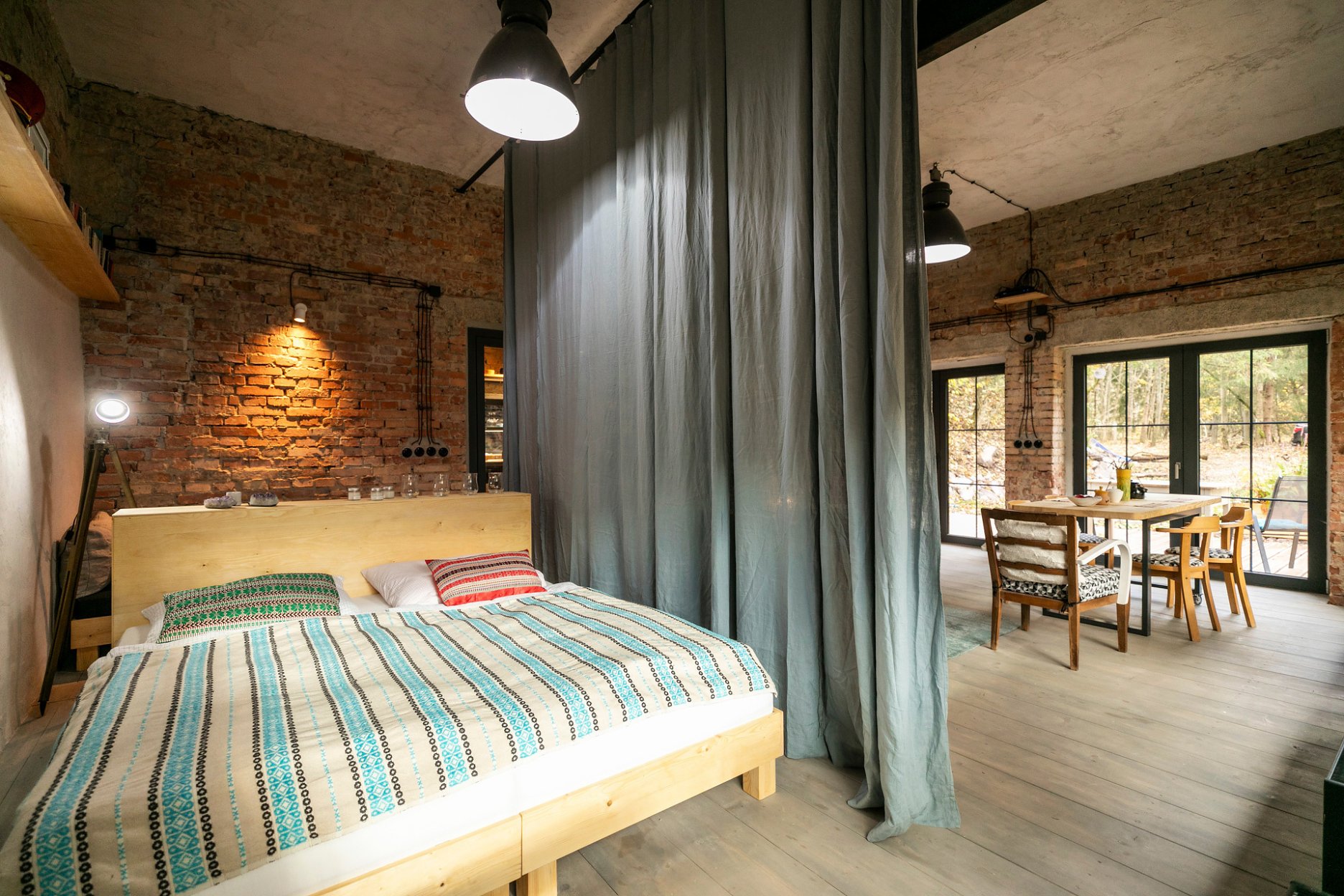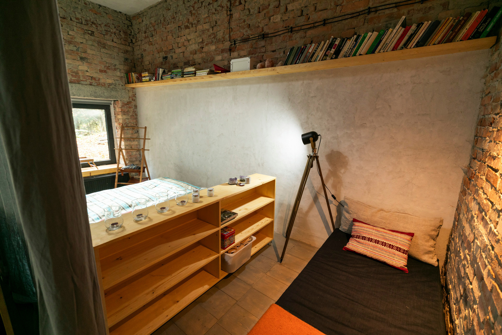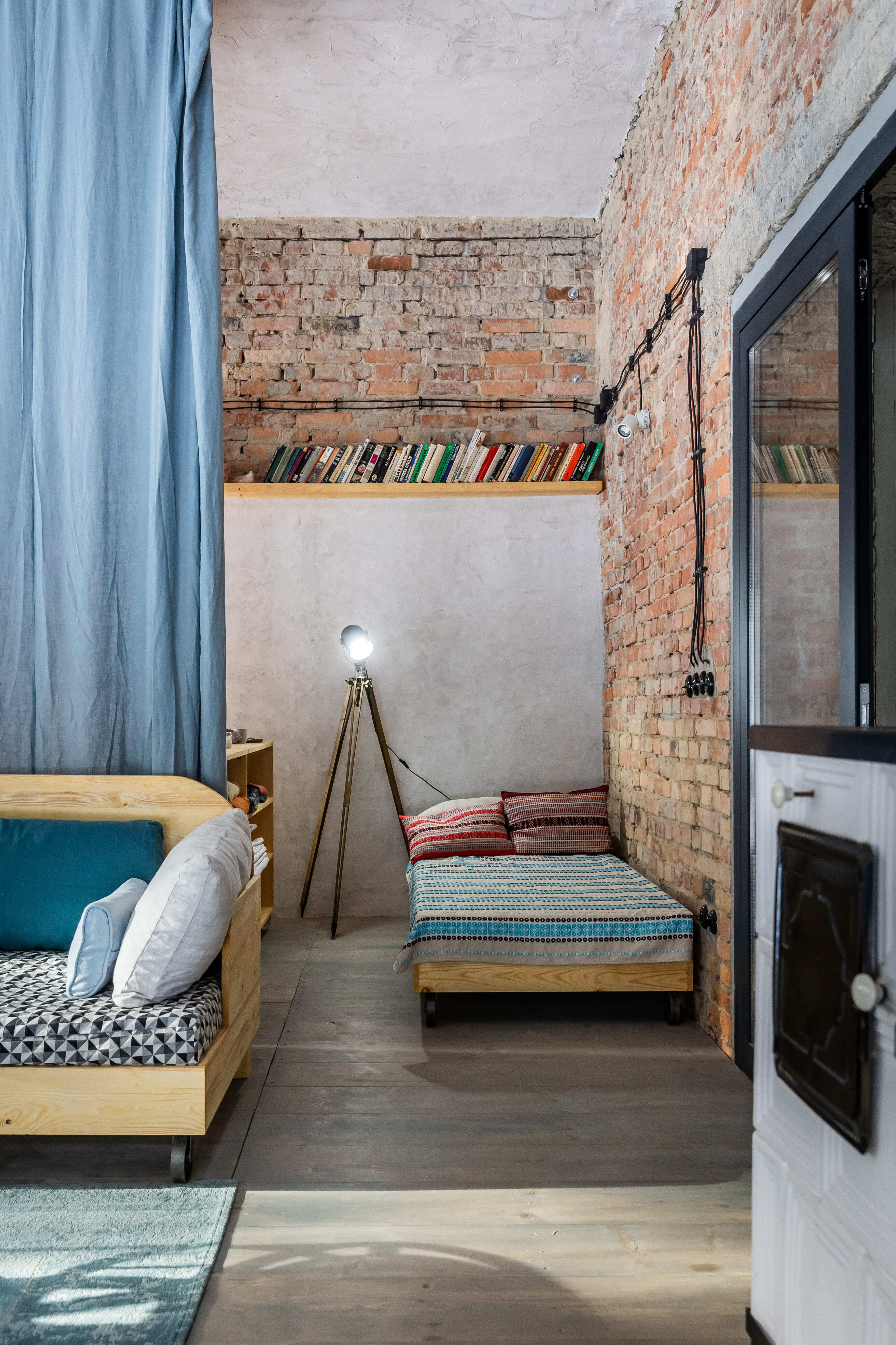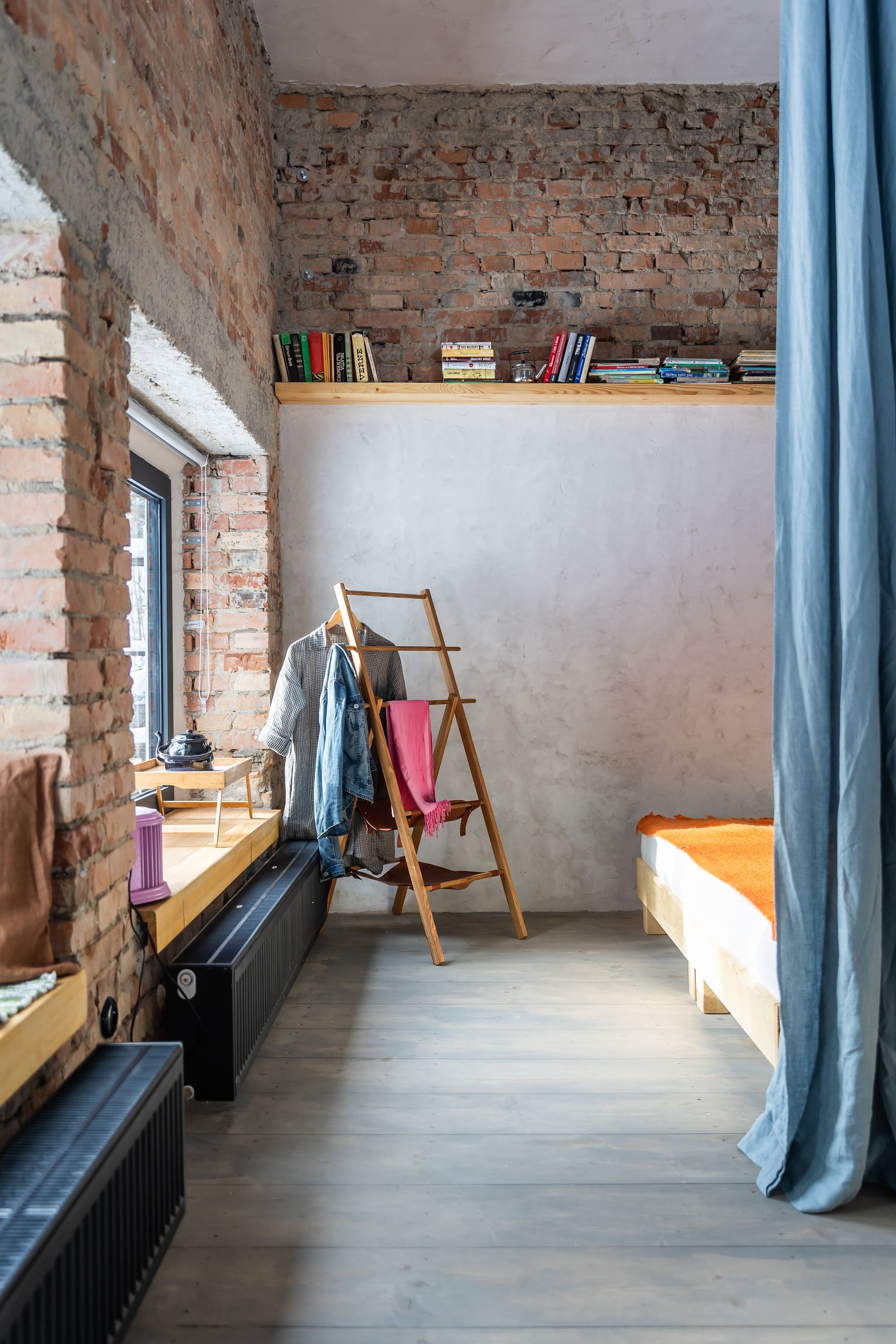 Ostatný priestor loftu s výškou 3,6 metra ponechala otvorený, a to z jednoduchého dôvodu: ponúka tak možnosti rôznorodého využitia. Aj keď aktuálne slúži ako víkendové bývanie, tento krásny priestor má v budúcnosti potenciál stať sa jedinečným miestom na prenájom - či už pre workshopy, zážitkové akcie, mítingy, či detské predstavenia. Tejto vízii architektka prispôsobila aj zariadenie. Takmer všetky nábytkové solitéry sú na kolieskach, čo umožňuje ich jednoduché premiestnenie. Pohovka a postele na kolieskach sú nové, na mieru vyhovovené. Kreslá a konferenčný stolík sú opravené, repasované a prečalúnené staré kúsky.