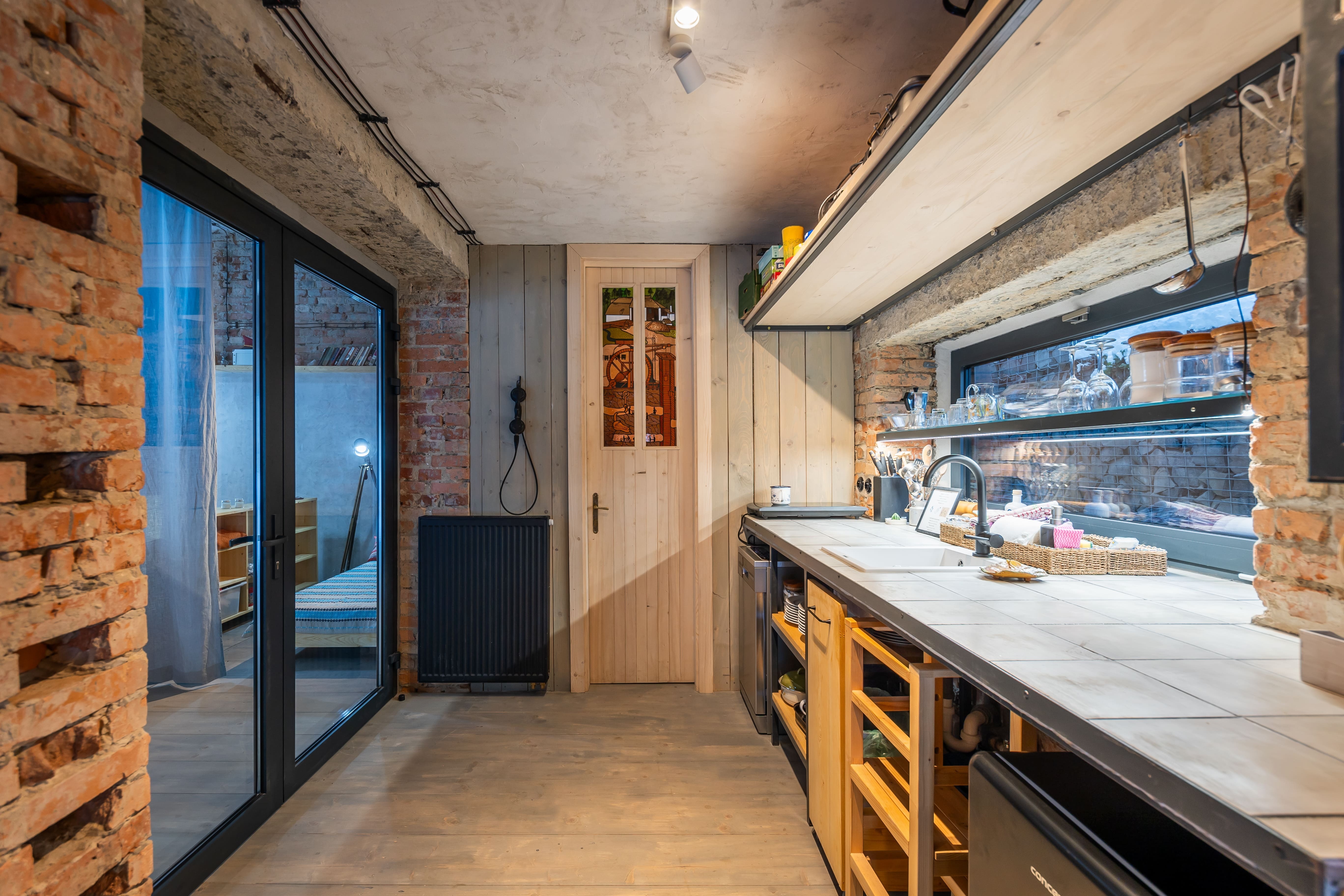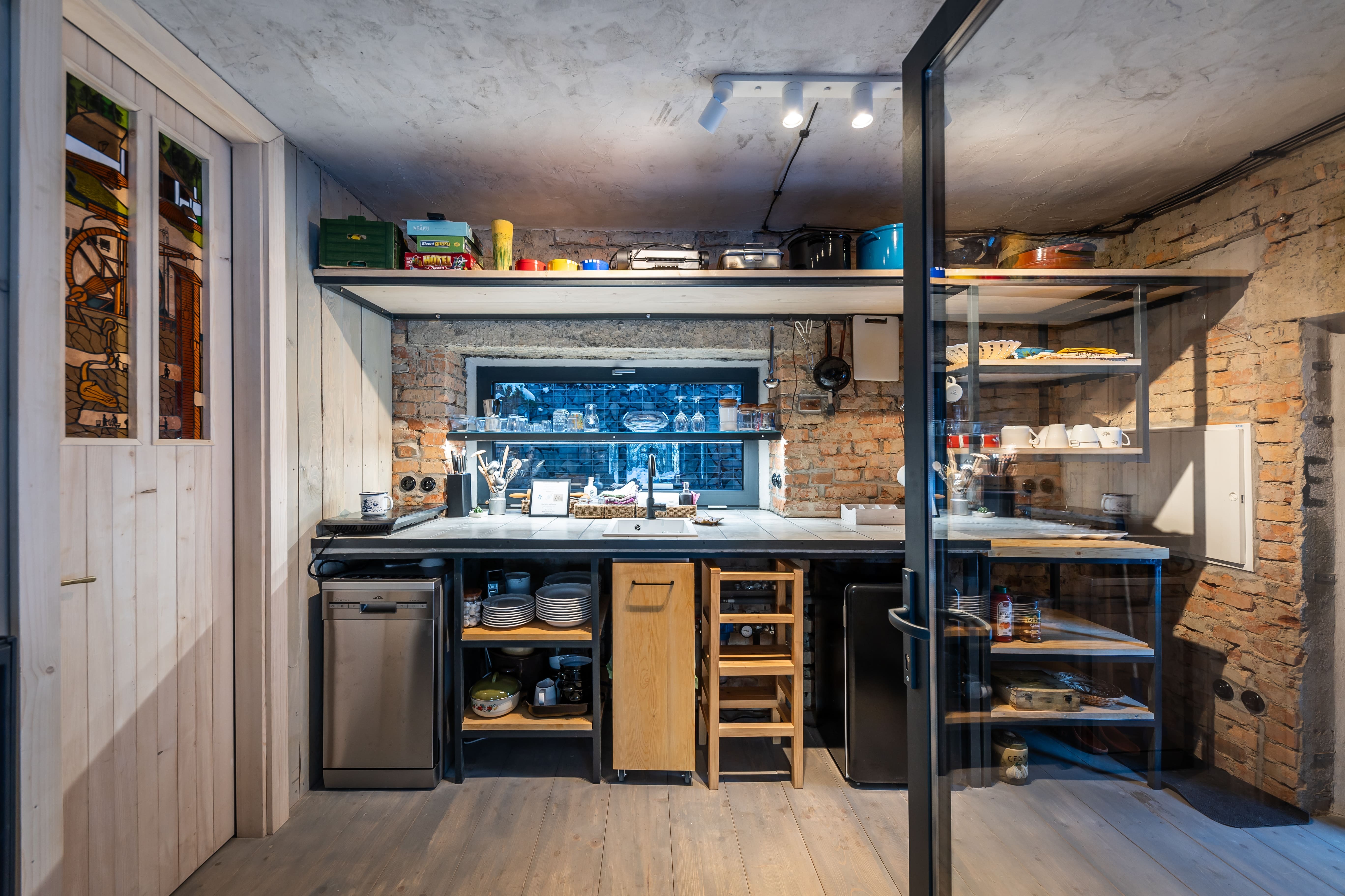Pôdorysné rozvrhnutie je čisté, bez zbytočných komplikácií. Autorka využila oddelenú časť s nižším stropom na situovanie kuchyne, a navrhla tu jedinú novú priečku, drevenú, ktorou oddelila kúpeľňu. Kuchynskú linku v industriálnom štýle tvorí  jeden obrovský pult, na ktorom pracovnú dosku tvoria recyklované betónové dlaždice od výrobcu Ľubomíra Horáka. Pod ním sú výsuvné prvky. Zaujímavým riešením je polica na poháre osadená priamo v okne. Na dverách do kúpeľne vytvorila epické vitráže Katka Pokorná. Zachytáva miestnu technickú pamiatku, šachtu Ludovika.