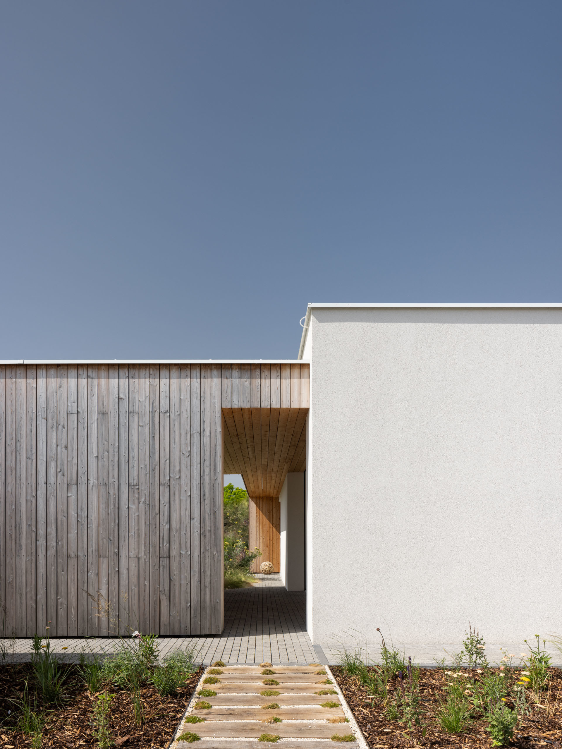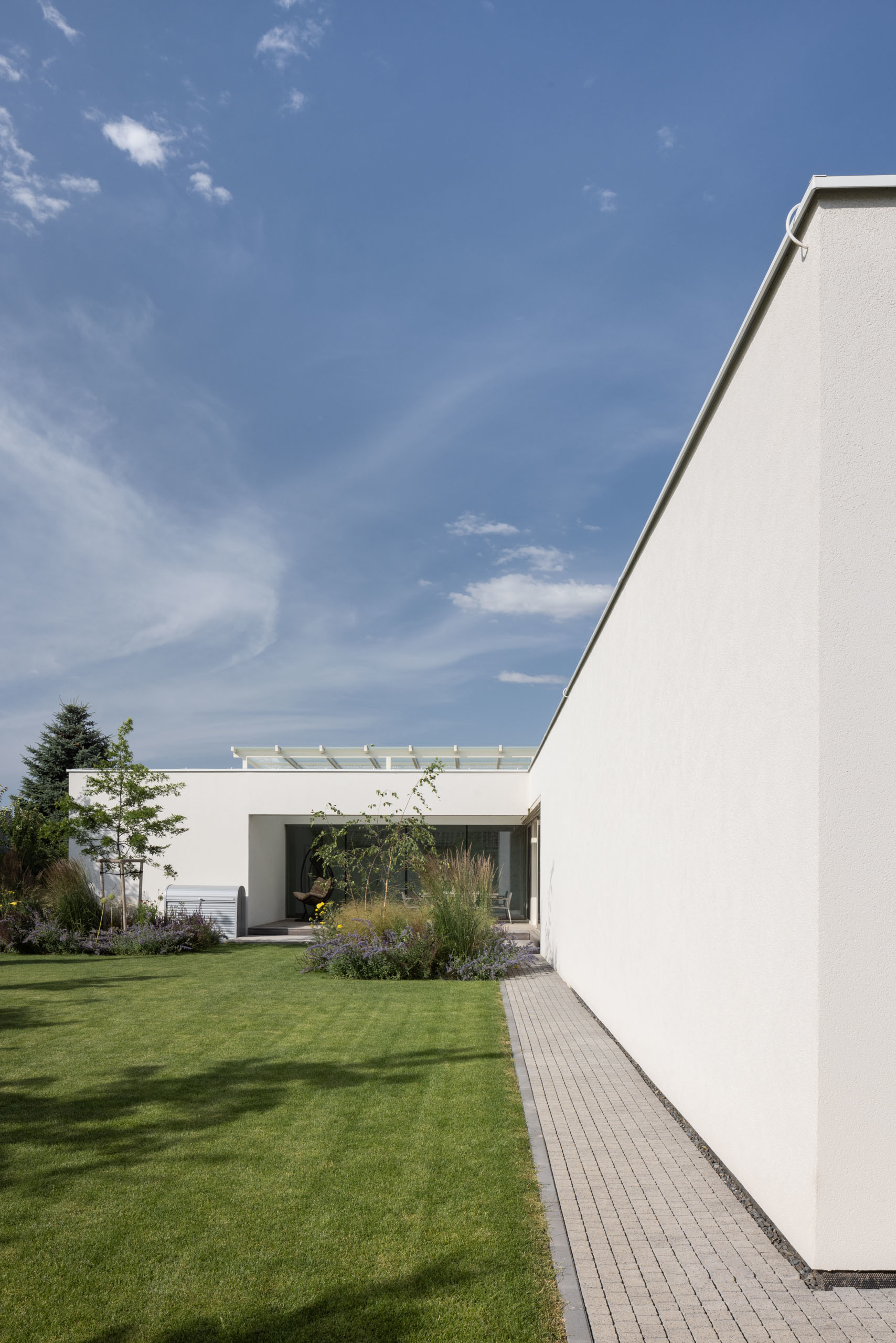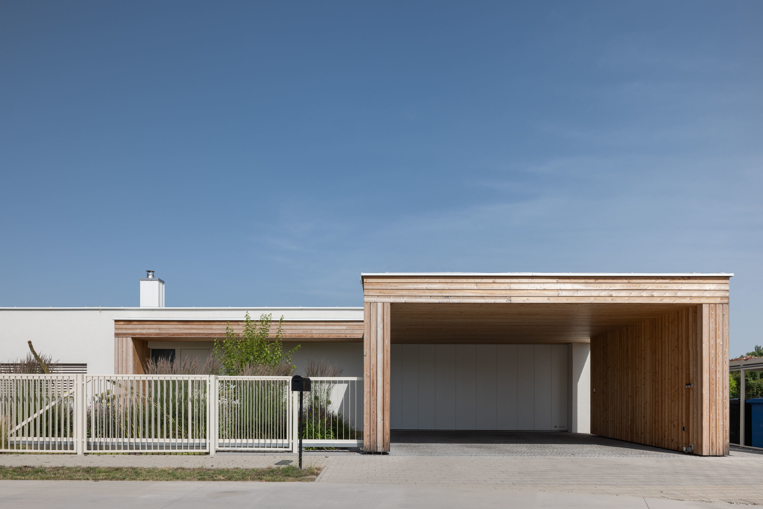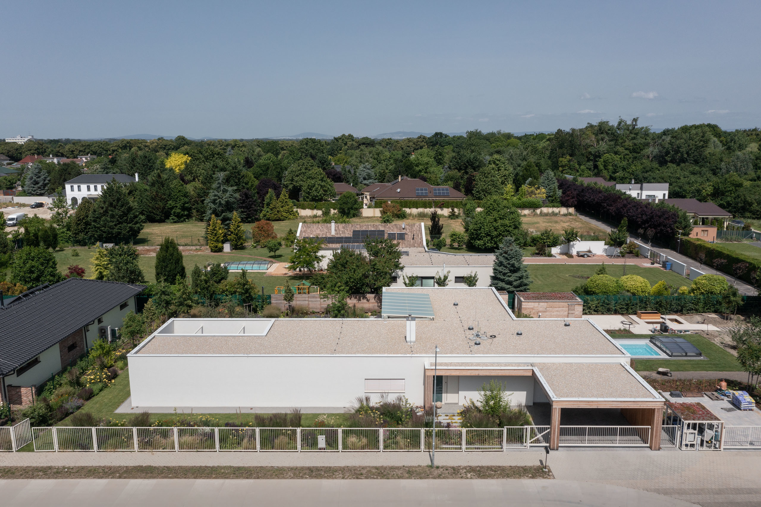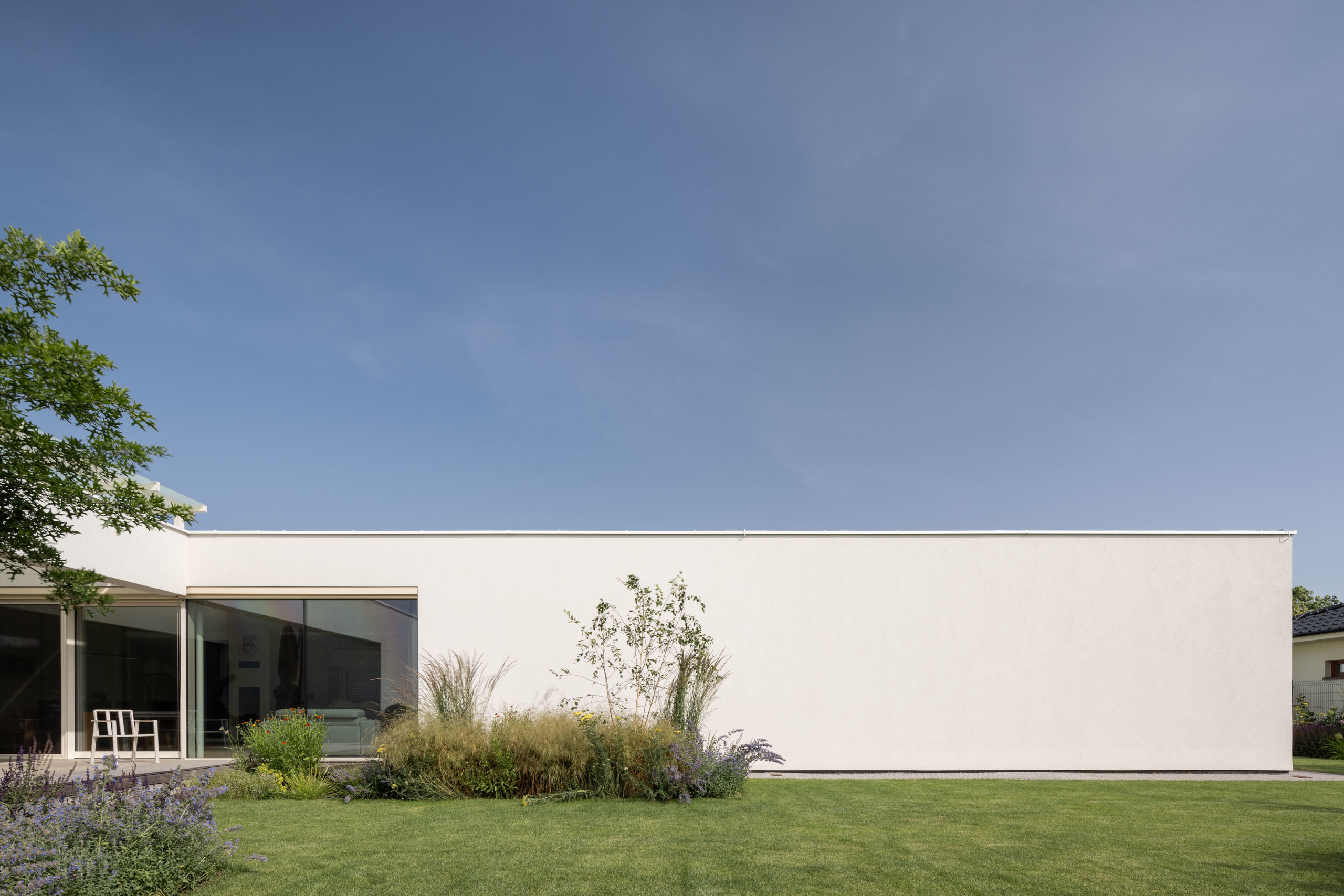Jednopodlažný objekt na rovine, s bezbariérovovou prevádzkou na jednej úrovni a priamym prepojením na priľahlý pozemok. Strohé výrazové prostriedky, jednoduchá ortogonálna forma, drevo, biela farba a zeleň na záhrade - vytvárajú predpoklady pre príjemné, neokázalé, nadčasové bývanie.