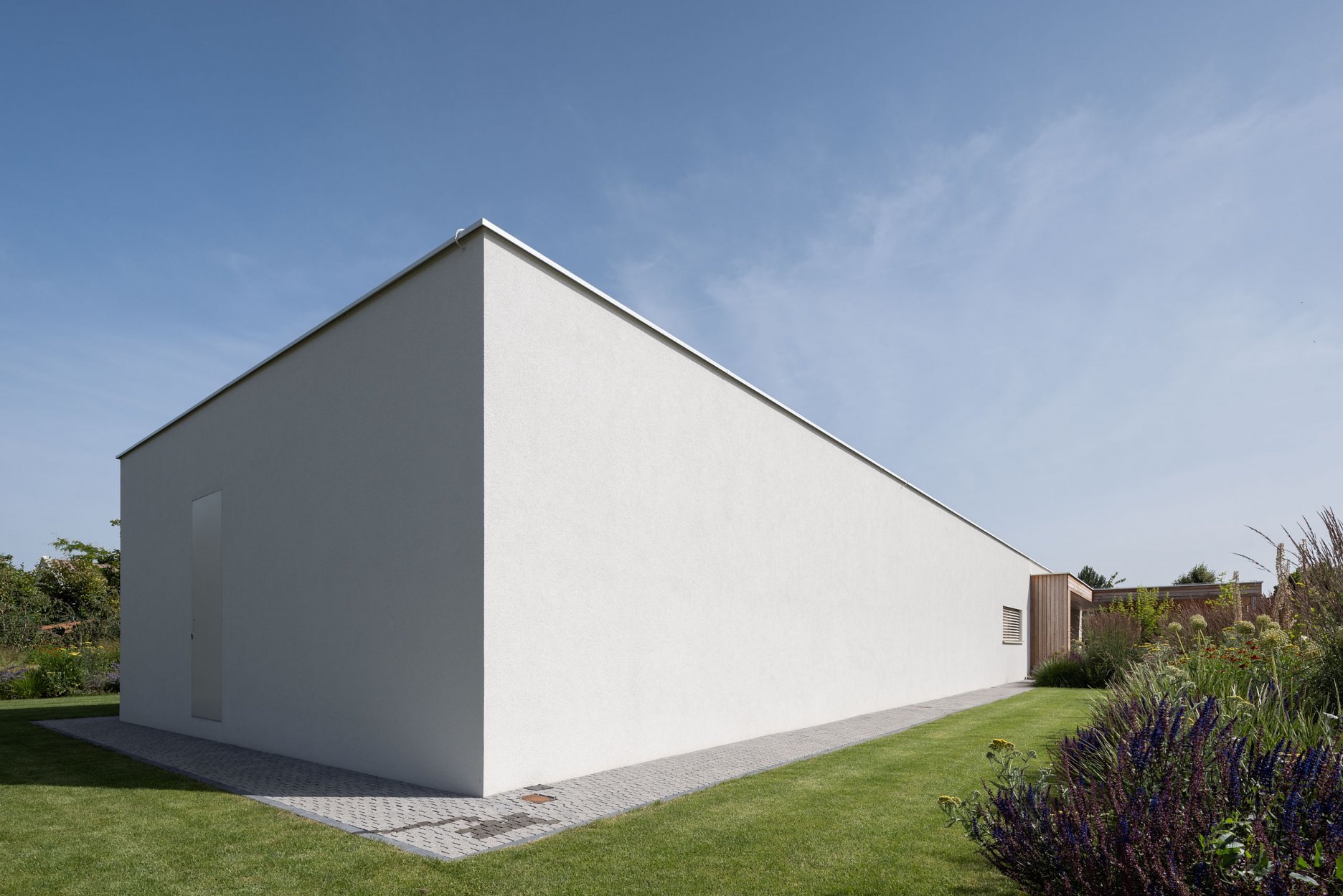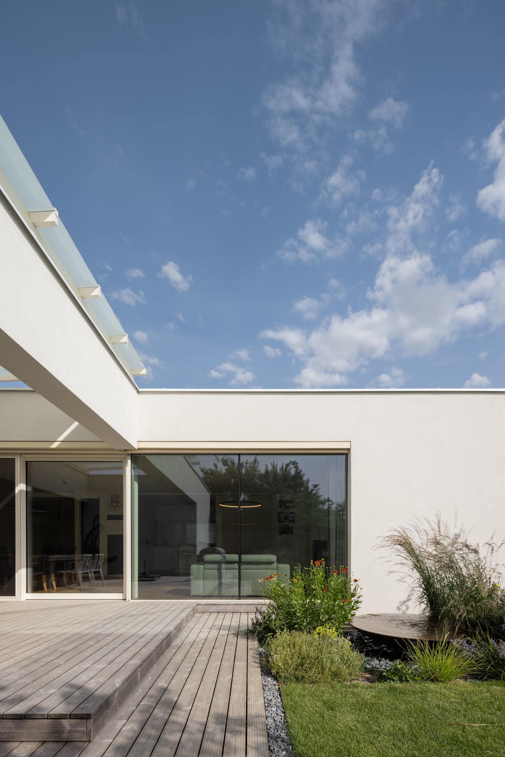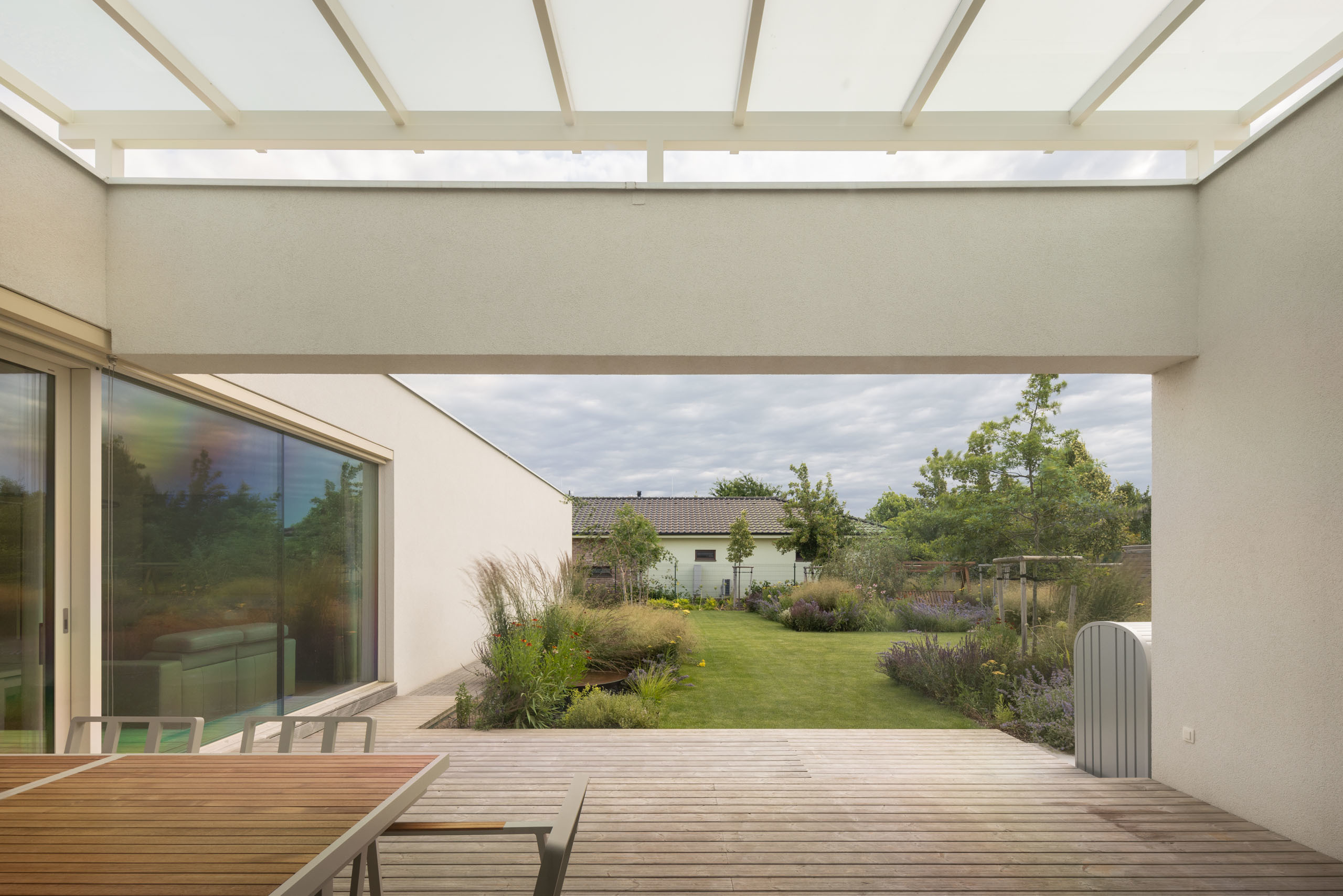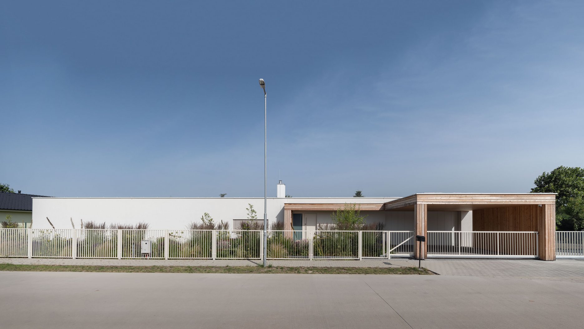 Jednopodlažný objekt na rovine, s bezbariérovovou prevádzkou na jednej úrovni a priamym prepojením na priľahlý pozemok. Strohé výrazové prostriedky, jednoduchá ortogonálna forma, drevo, biela farba a zeleň na záhrade - vytvárajú predpoklady pre príjemné, neokázalé, nadčasové bývanie.