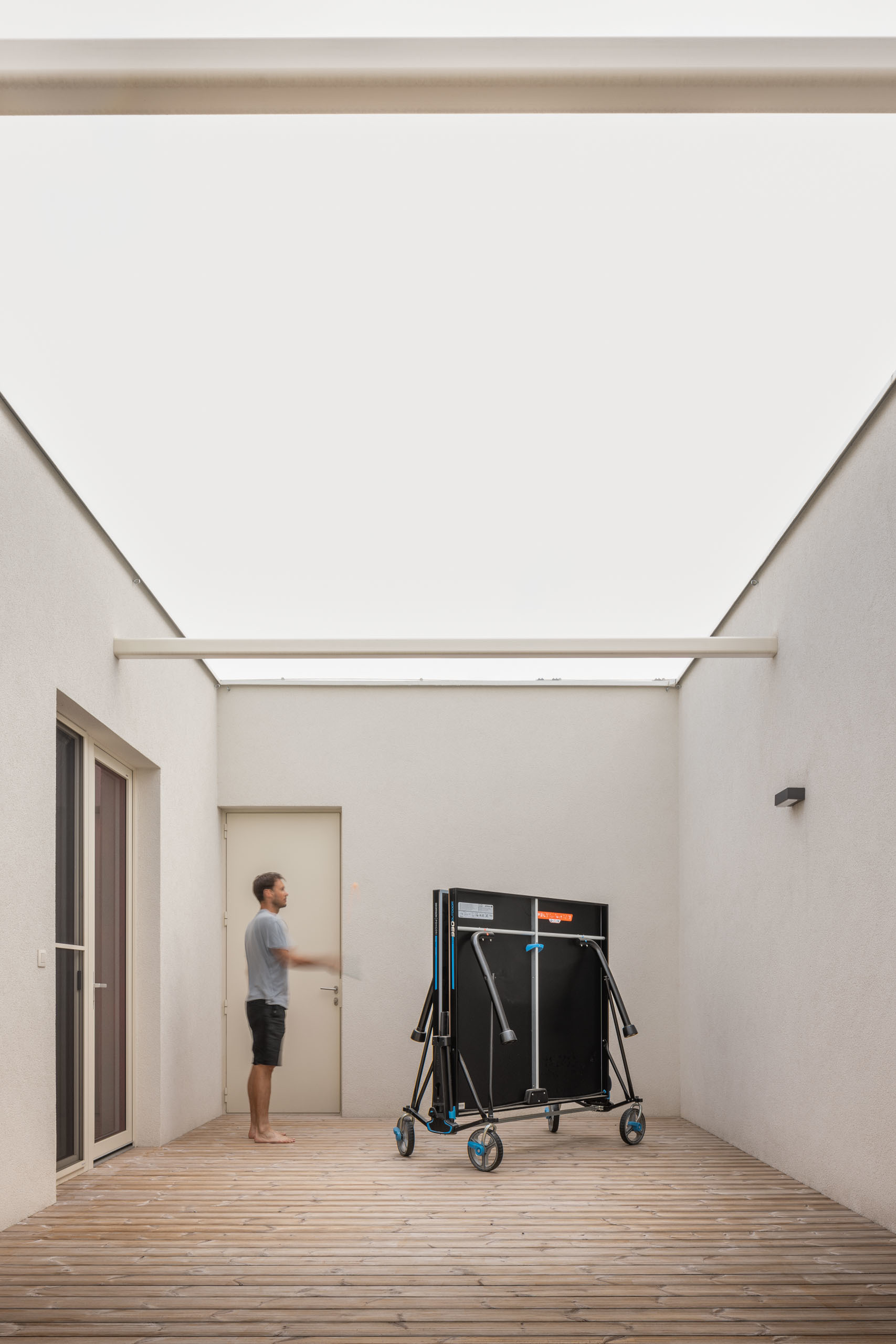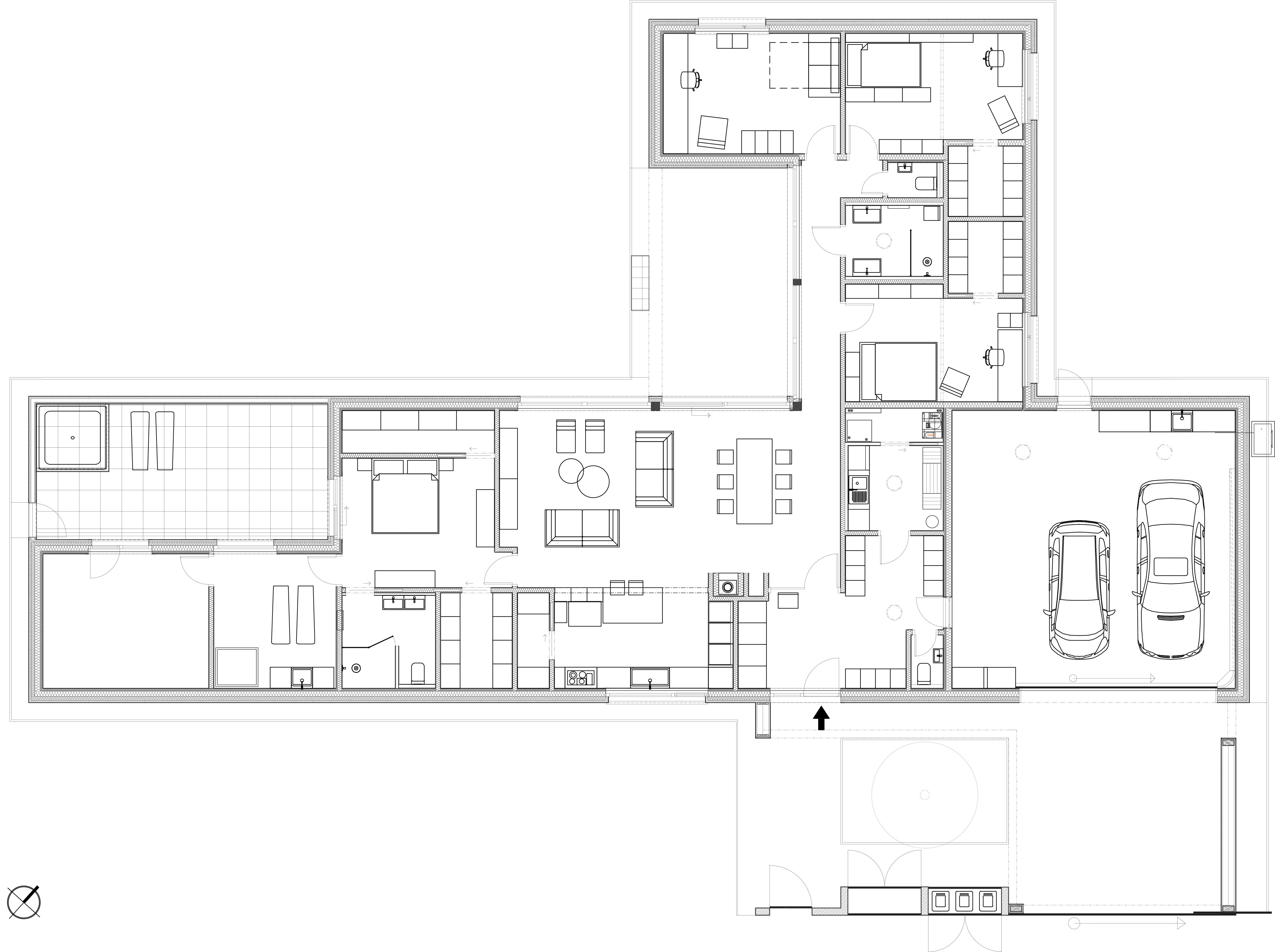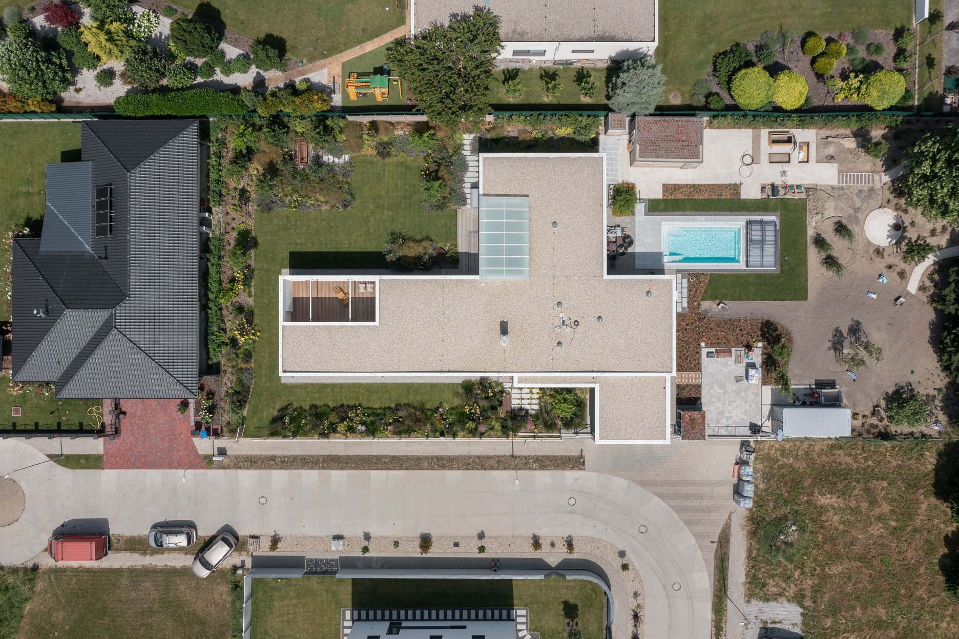 Pozemok svojou mierkou a proporciami umožnil, aby potreby rodičov boli saturované lineárne pozdĺž ulice. Garáž, vstup, obytný priestor s kuchyňou (jediné okno do ulice na 34 metrov dlhej fasáde), spálňa rodičov s hygienickým zázemím a šatníkom, sauna, fitness, privátne átrium s vírivkou. V komunikačnej kolmici “dlhý” blok je pozicionované krátke detské krídlo s hygienickým zázemím a hosťovskou izbou. Obe krídla spája vonkajšia krytá terasa.