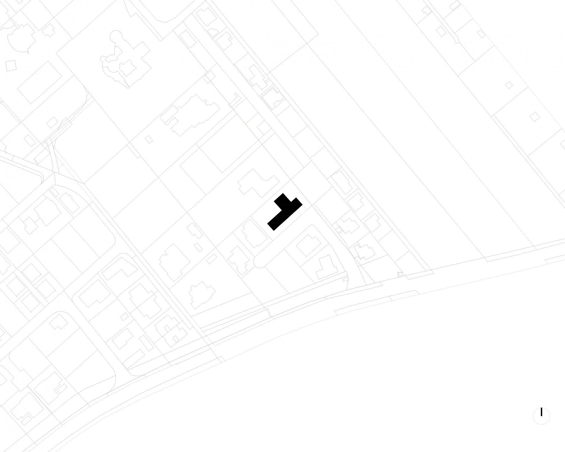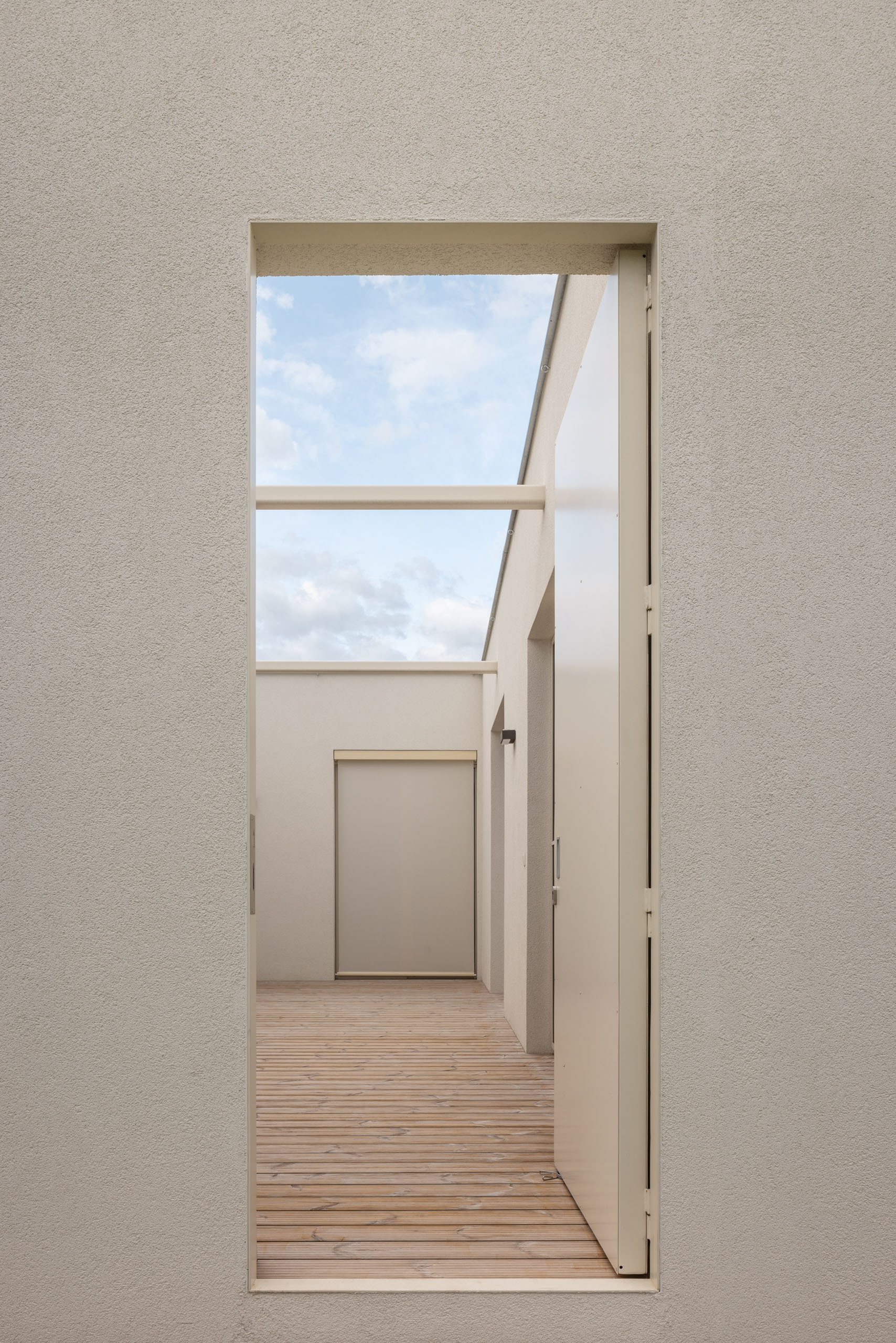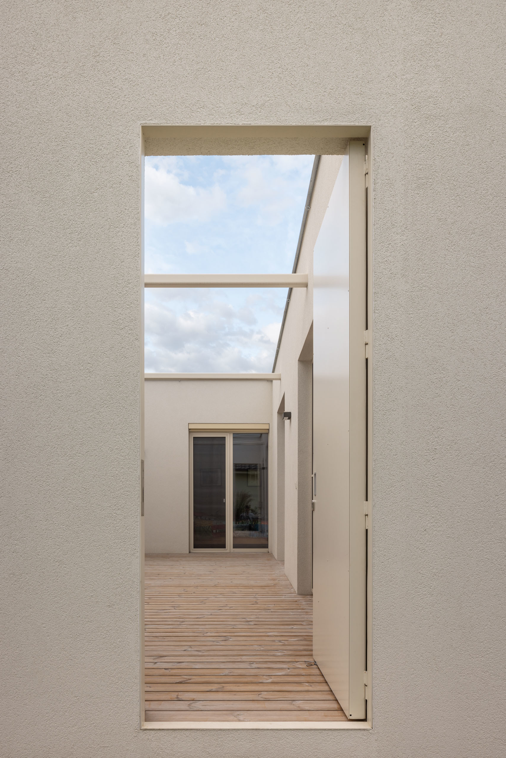 Pozemok svojou mierkou a proporciami umožnil, aby potreby rodičov boli saturované lineárne pozdĺž ulice. Garáž, vstup, obytný priestor s kuchyňou (jediné okno do ulice na 34 metrov dlhej fasáde), spálňa rodičov s hygienickým zázemím a šatníkom, sauna, fitness, privátne átrium s vírivkou. V komunikačnej kolmici “dlhý” blok je pozicionované krátke detské krídlo s hygienickým zázemím a hosťovskou izbou. Obe krídla spája vonkajšia krytá terasa.