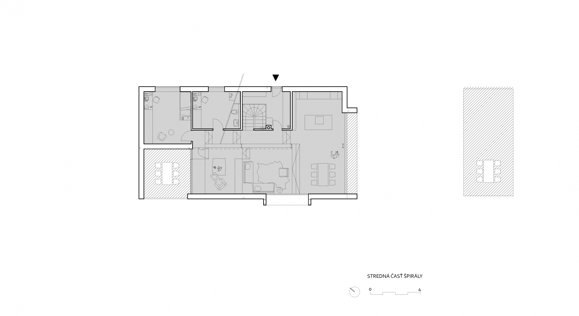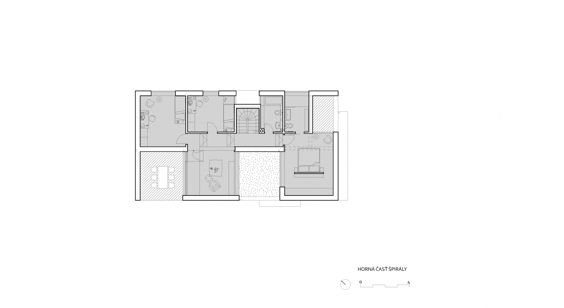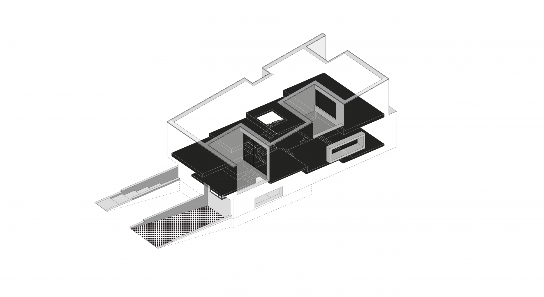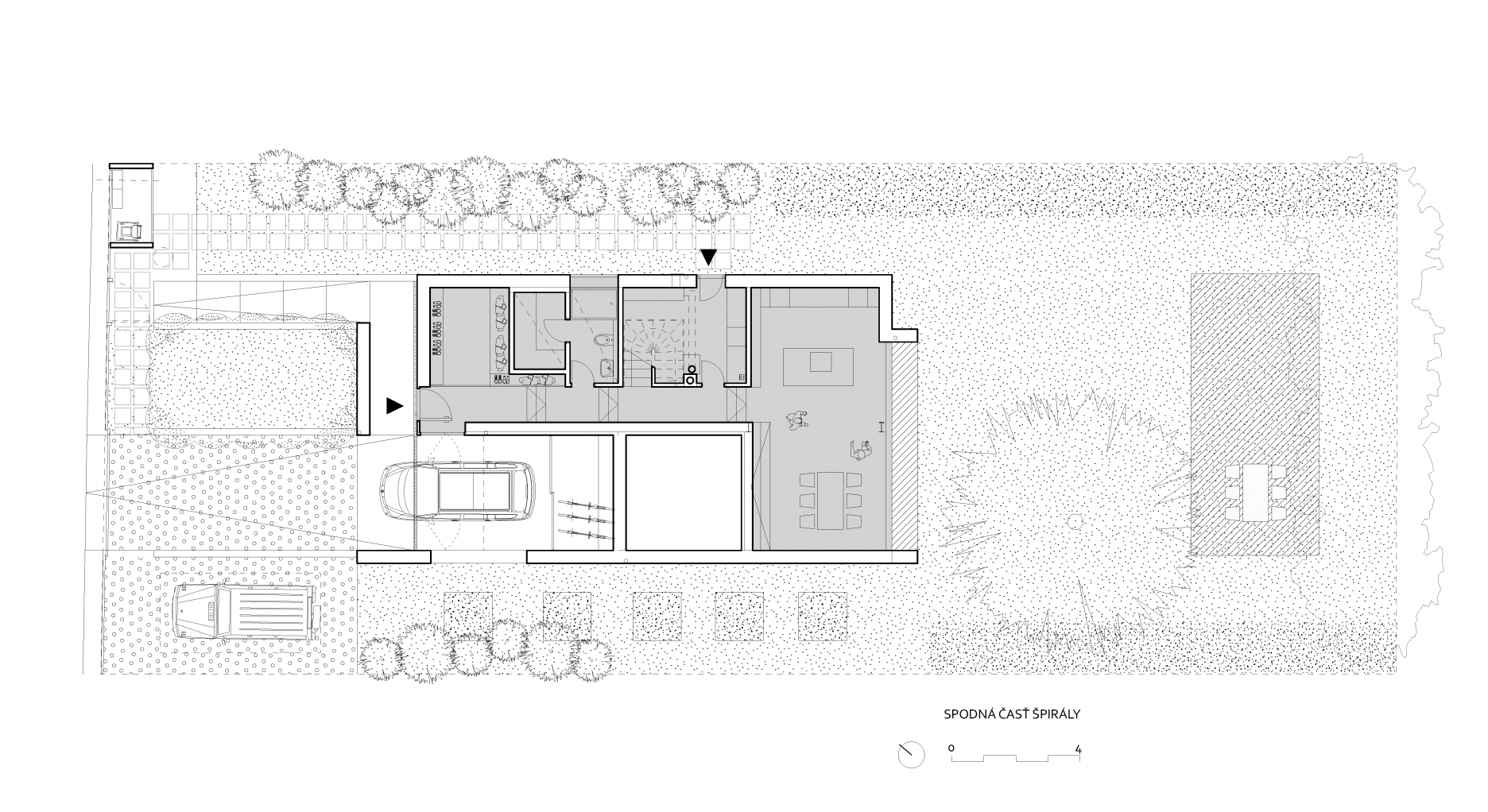 Ozajstná prírodná záhrada je len jedným z mnohých zastavení vo zvlnenej krajine počas putovania domom. Plošinové radenie navzájom pol metra vyposúvaných platforiem vytvára kontinuálne klesajúci a stúpajúci terén. Elevácia umožňuje kontakt s exteriérom aj z druhého konca domu a prináša do medzi-interiérových interakcií nové vzťahy a polohy obyvateľov voči sebe a pozerania sa na seba. Do špirály zjednodušený raumplan je zároveň odkazom na pódiové radenie priestorov architektonických zdrojov a vzorov (aj slovenských), ktoré máme radi.