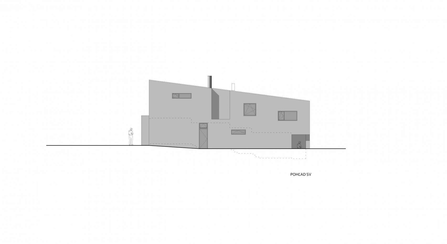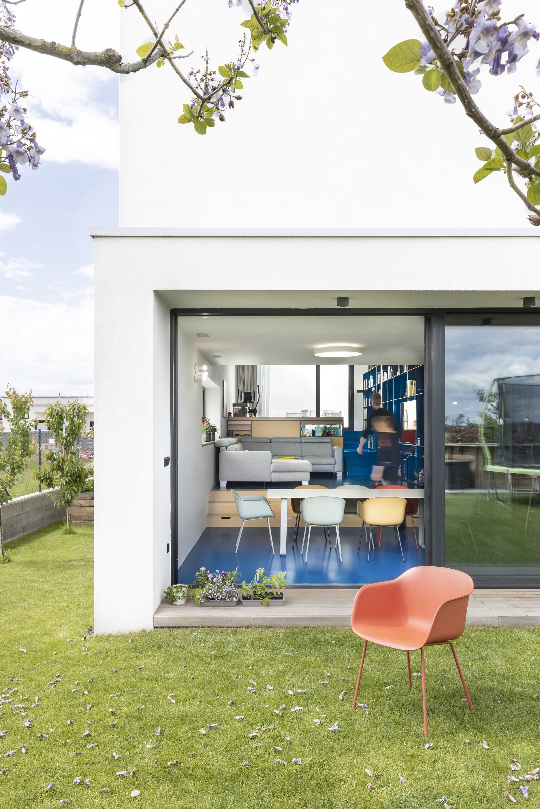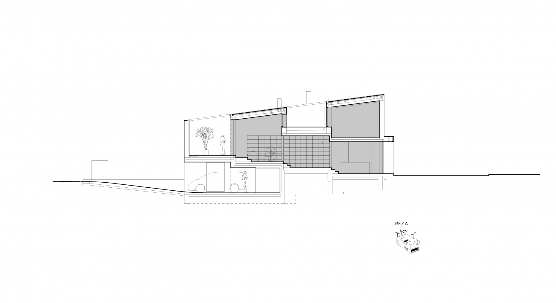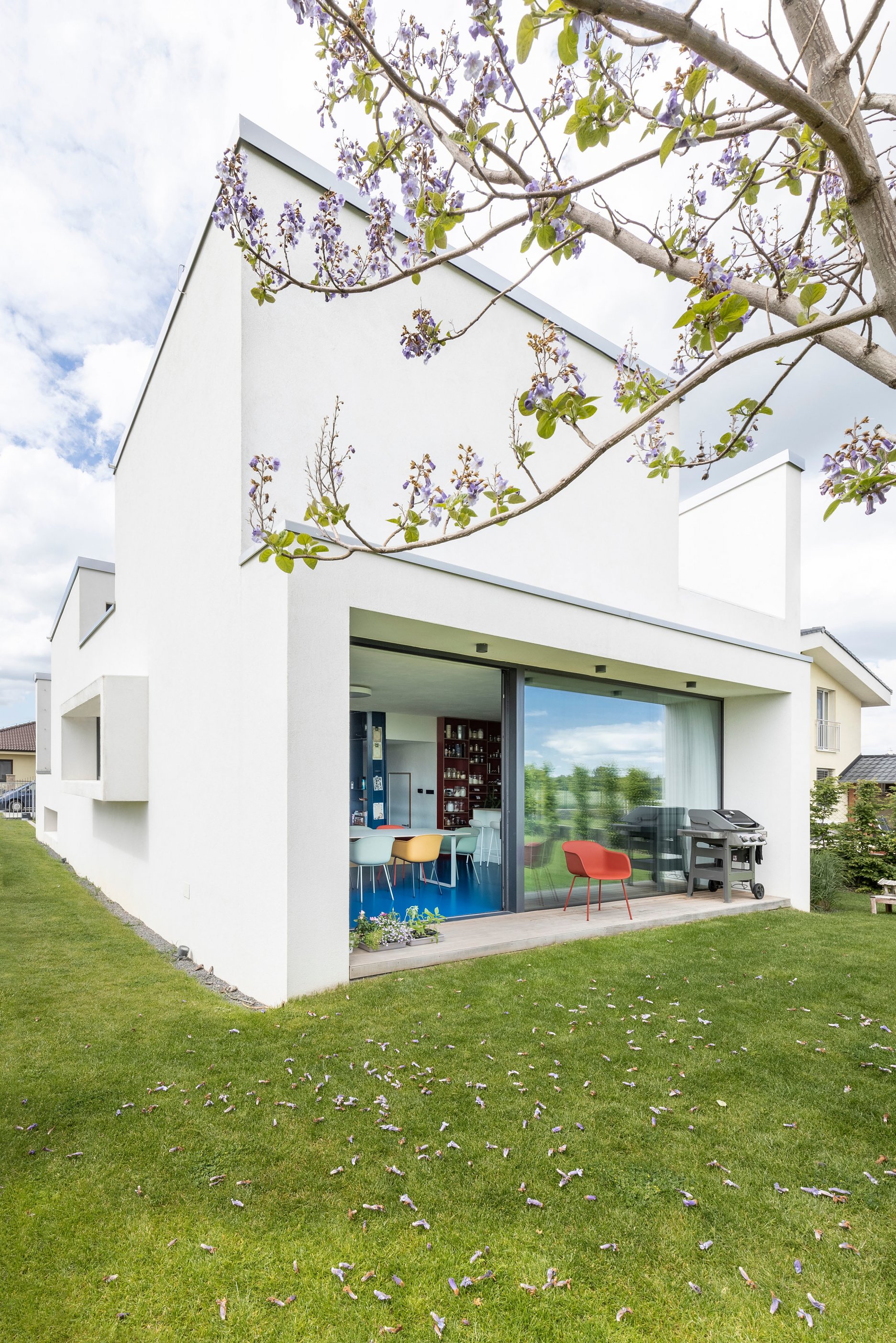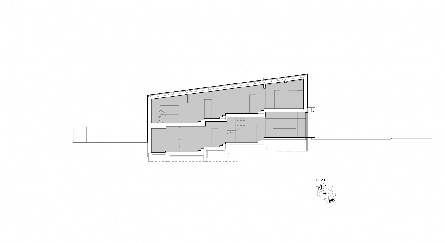 Ozajstná prírodná záhrada je len jedným z mnohých zastavení vo zvlnenej krajine počas putovania domom. Plošinové radenie navzájom pol metra vyposúvaných platforiem vytvára kontinuálne klesajúci a stúpajúci terén. Elevácia umožňuje kontakt s exteriérom aj z druhého konca domu a prináša do medzi-interiérových interakcií nové vzťahy a polohy obyvateľov voči sebe a pozerania sa na seba. Do špirály zjednodušený raumplan je zároveň odkazom na pódiové radenie priestorov architektonických zdrojov a vzorov (aj slovenských), ktoré máme radi.