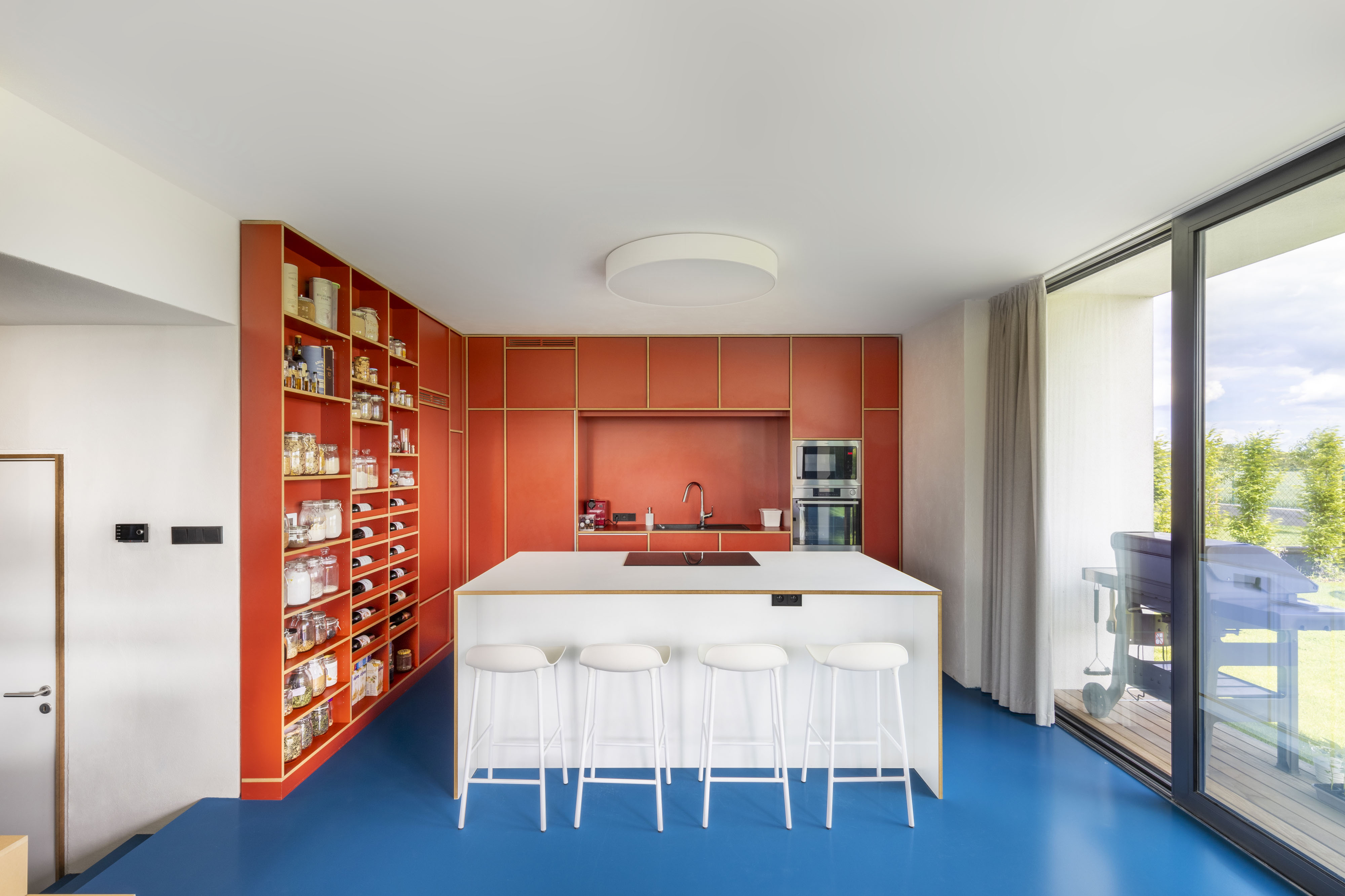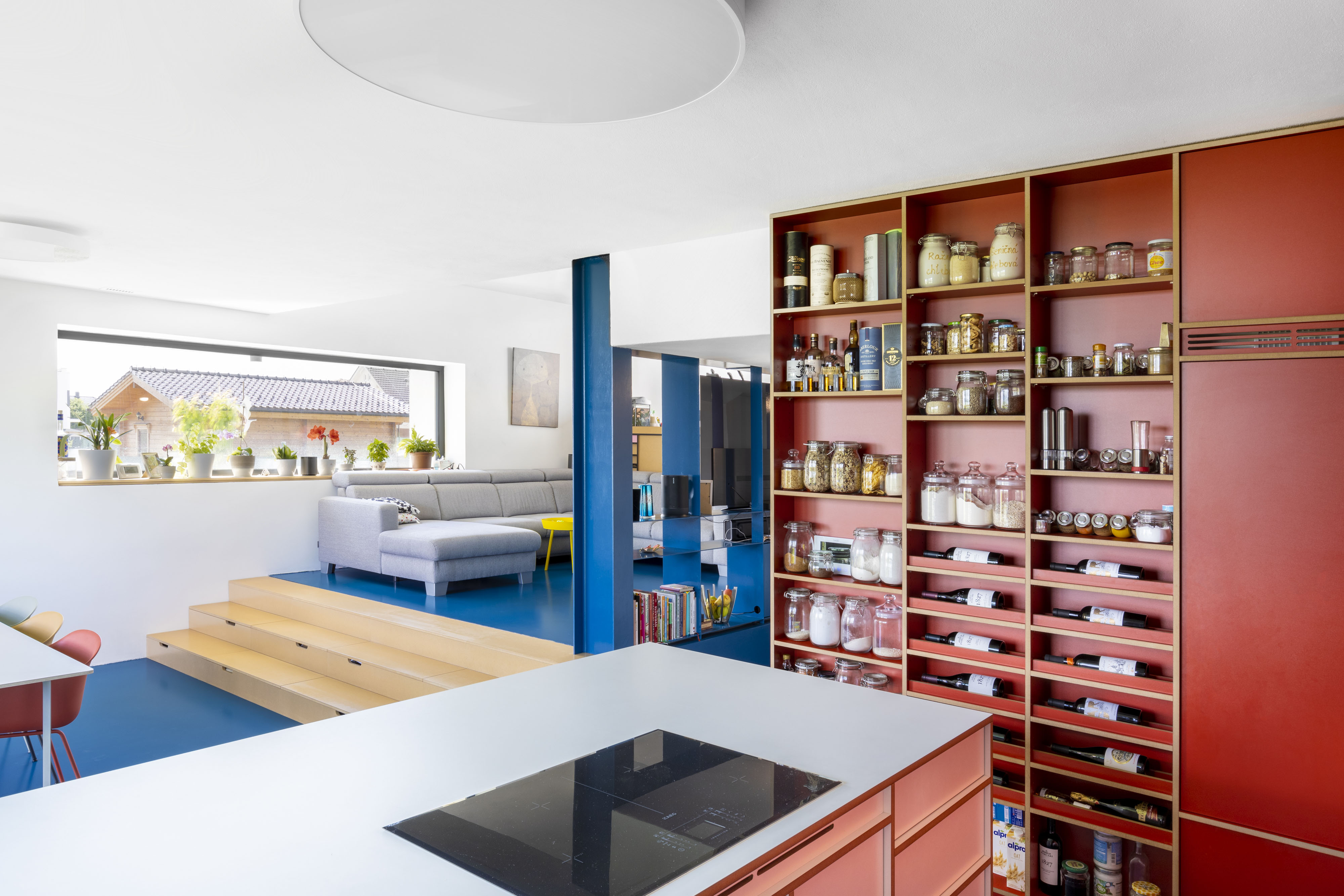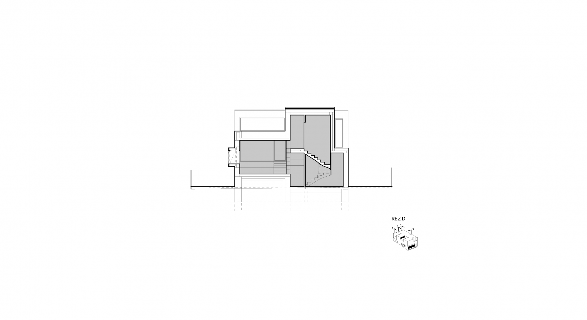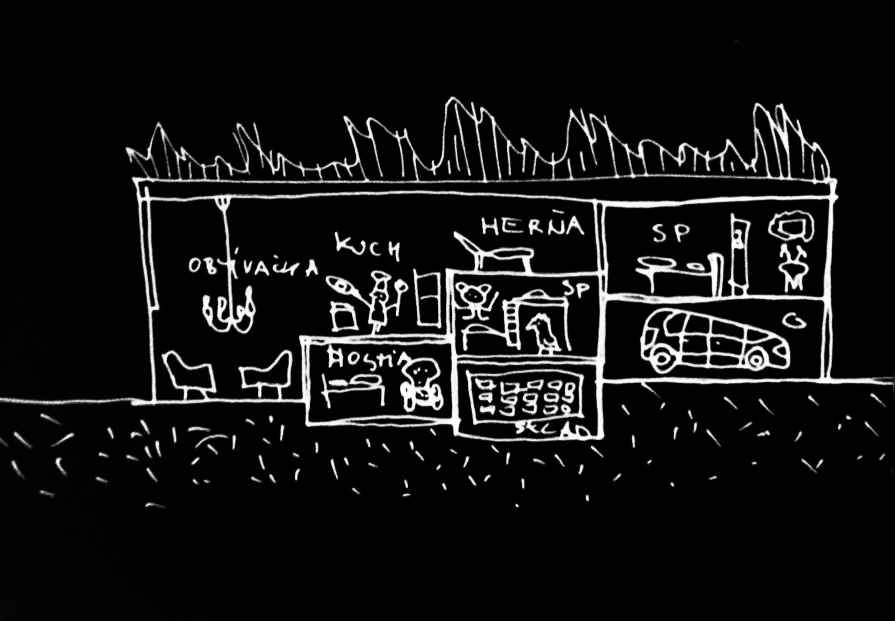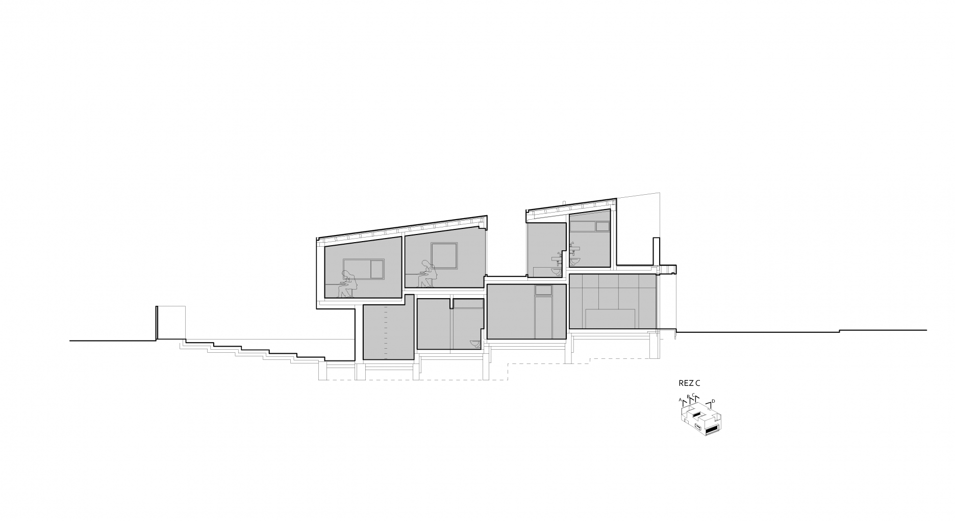 Ozajstná prírodná záhrada je len jedným z mnohých zastavení vo zvlnenej krajine počas putovania domom. Plošinové radenie navzájom pol metra vyposúvaných platforiem vytvára kontinuálne klesajúci a stúpajúci terén. Elevácia umožňuje kontakt s exteriérom aj z druhého konca domu a prináša do medzi-interiérových interakcií nové vzťahy a polohy obyvateľov voči sebe a pozerania sa na seba. Do špirály zjednodušený raumplan je zároveň odkazom na pódiové radenie priestorov architektonických zdrojov a vzorov (aj slovenských), ktoré máme radi.