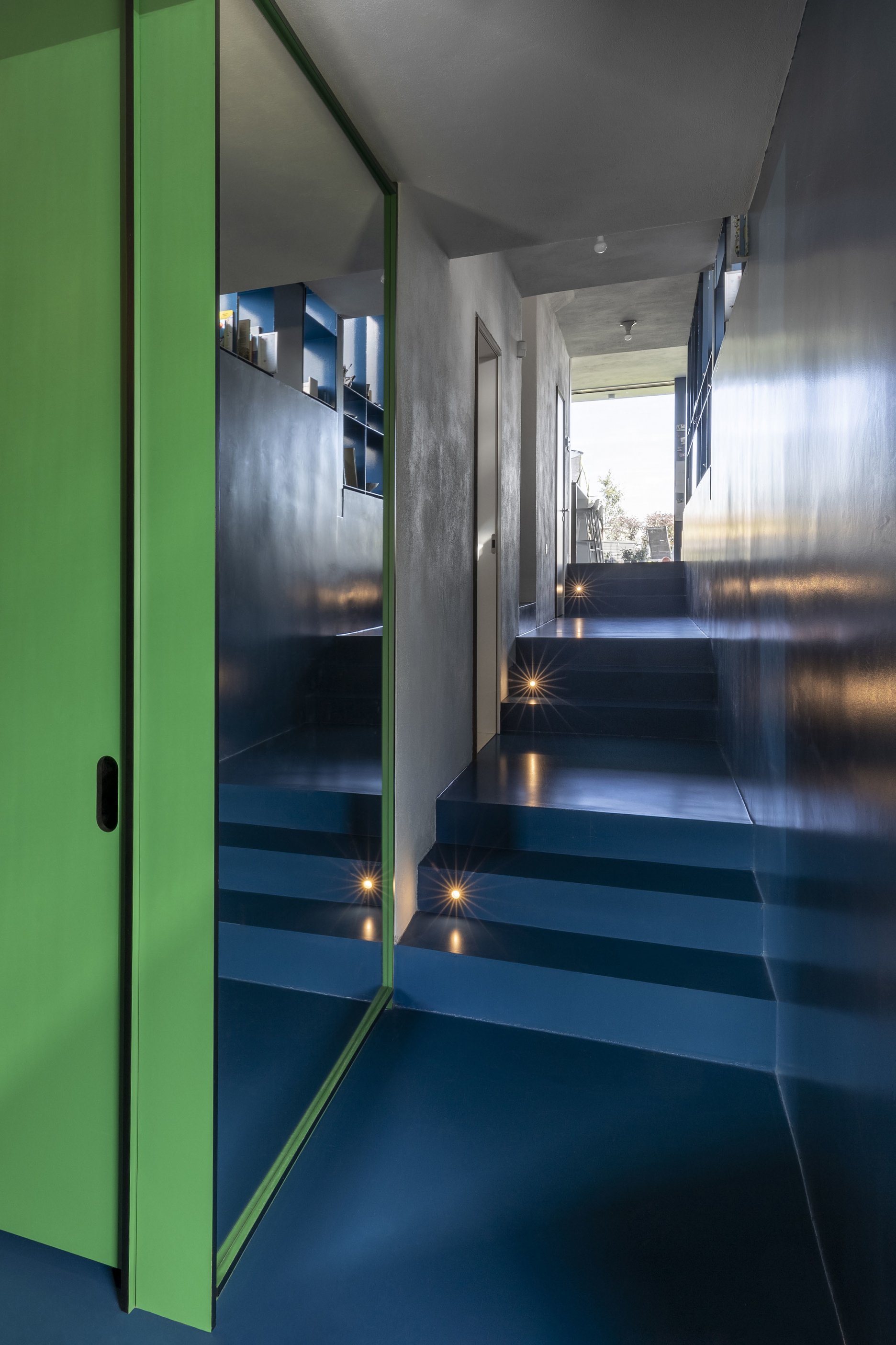 Dom umožňuje výstupy do exteriéru v rôznych úrovniach – na platformách #1, #3, #4 priamo do rôznych úrovní záhrady, na platformách #6a a #10a je výstup do polo uzatvorených loggii #6b a #10b.