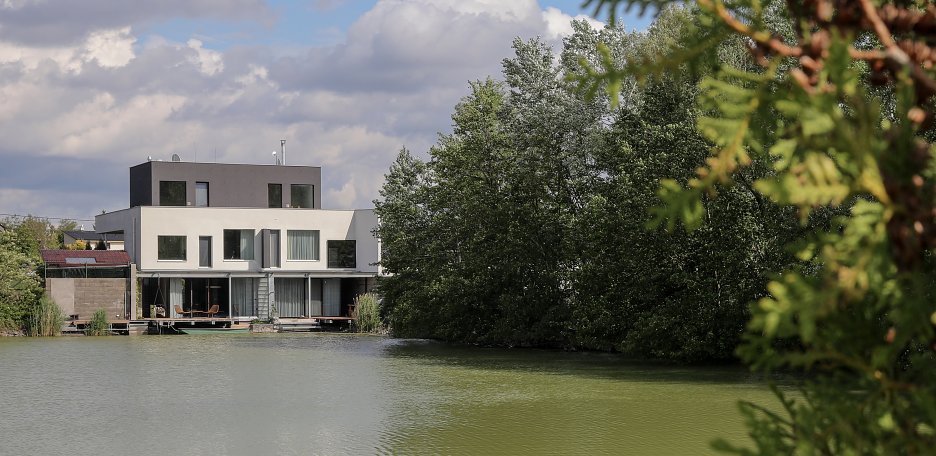 Objekt, posunutý na samú hranicu pozemku, oddeľuje od ruchu ulice kryté parkovanie s garážami. Zapustený, privátny priestor záhrady priamo nadväzuje na transparentnú dennú zónu domu, ktorá prostredníctvom terasy siaha až k hladine jazera.
