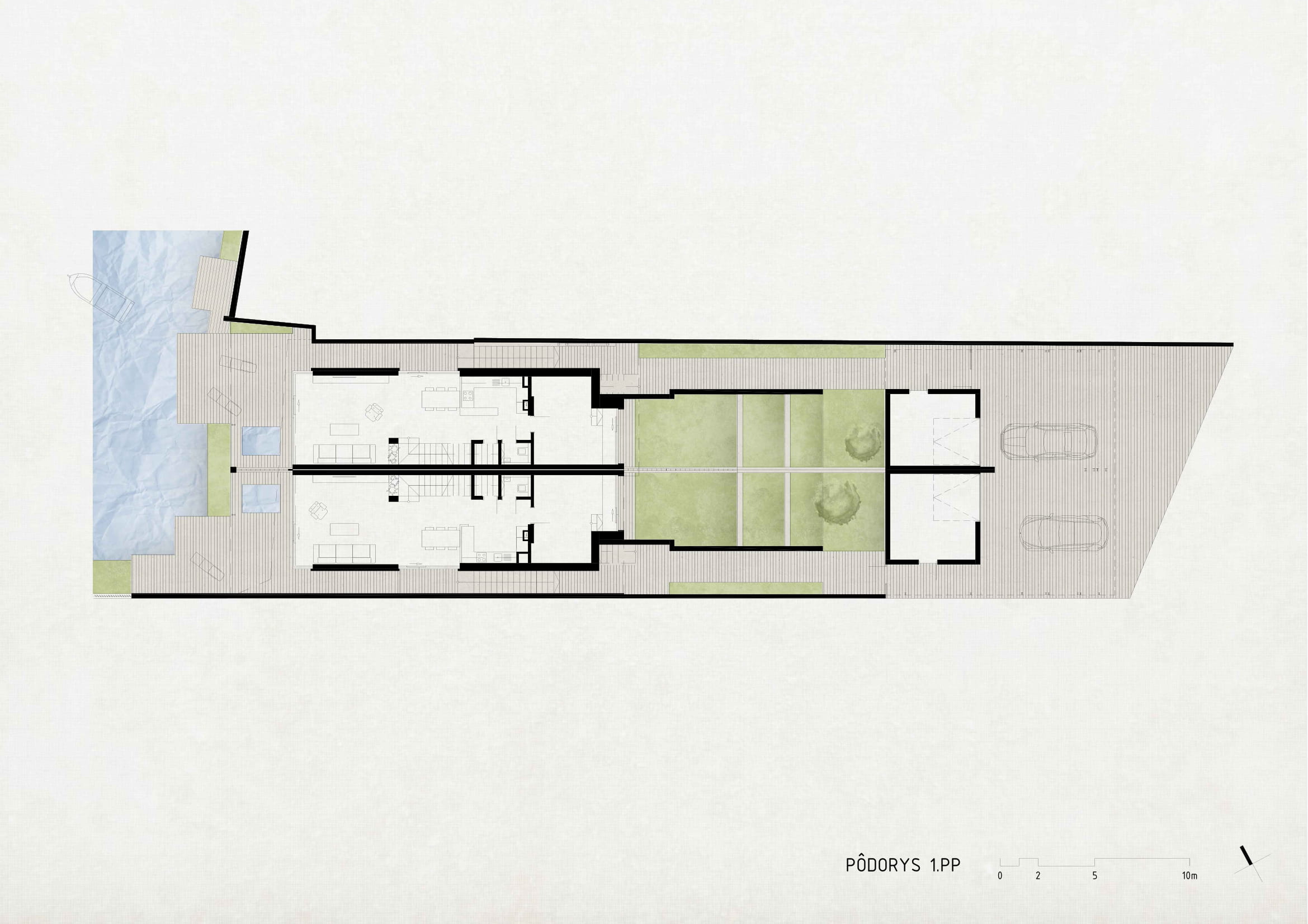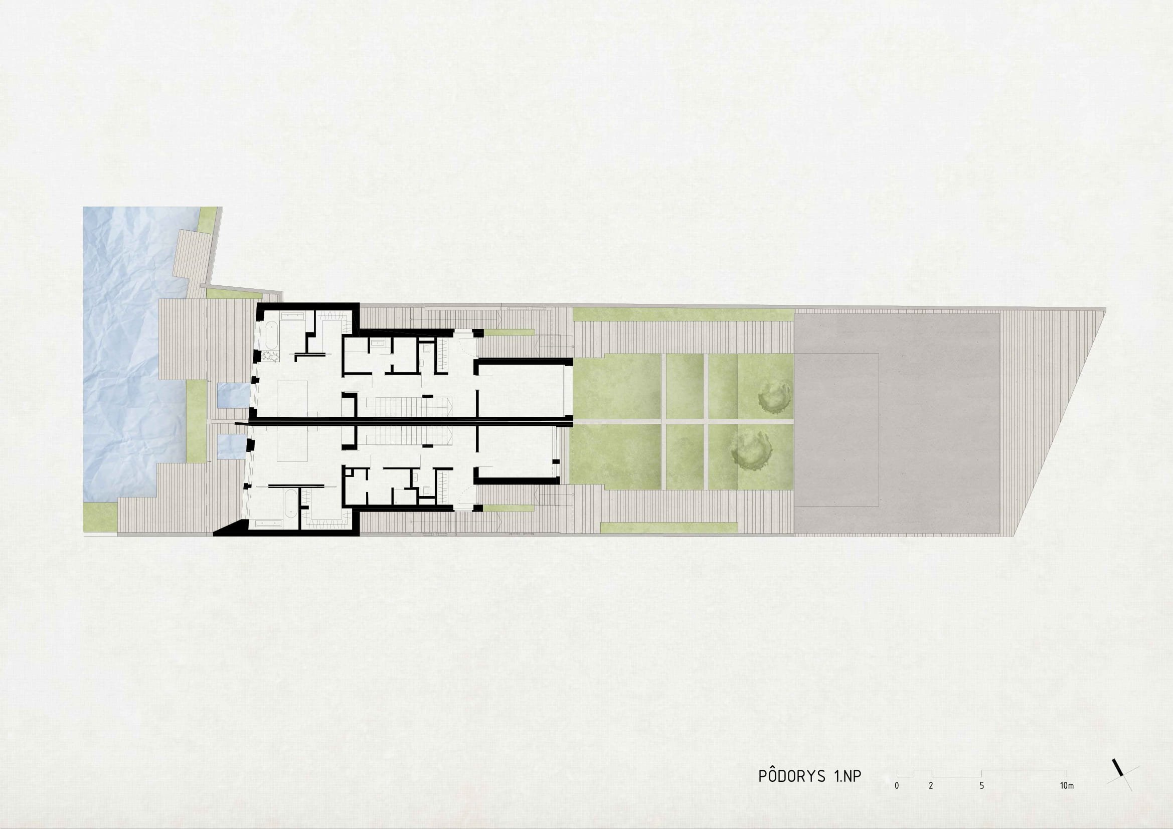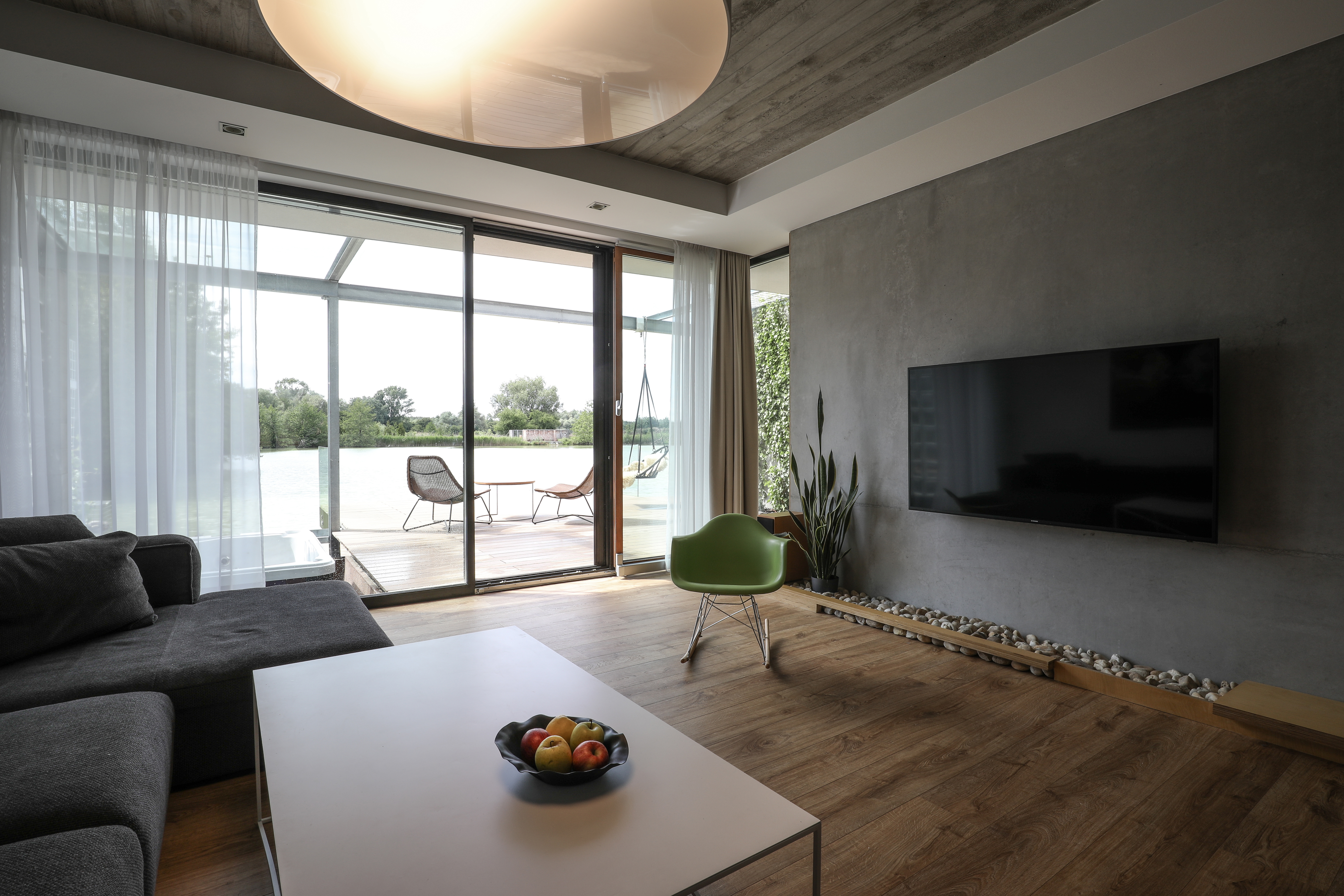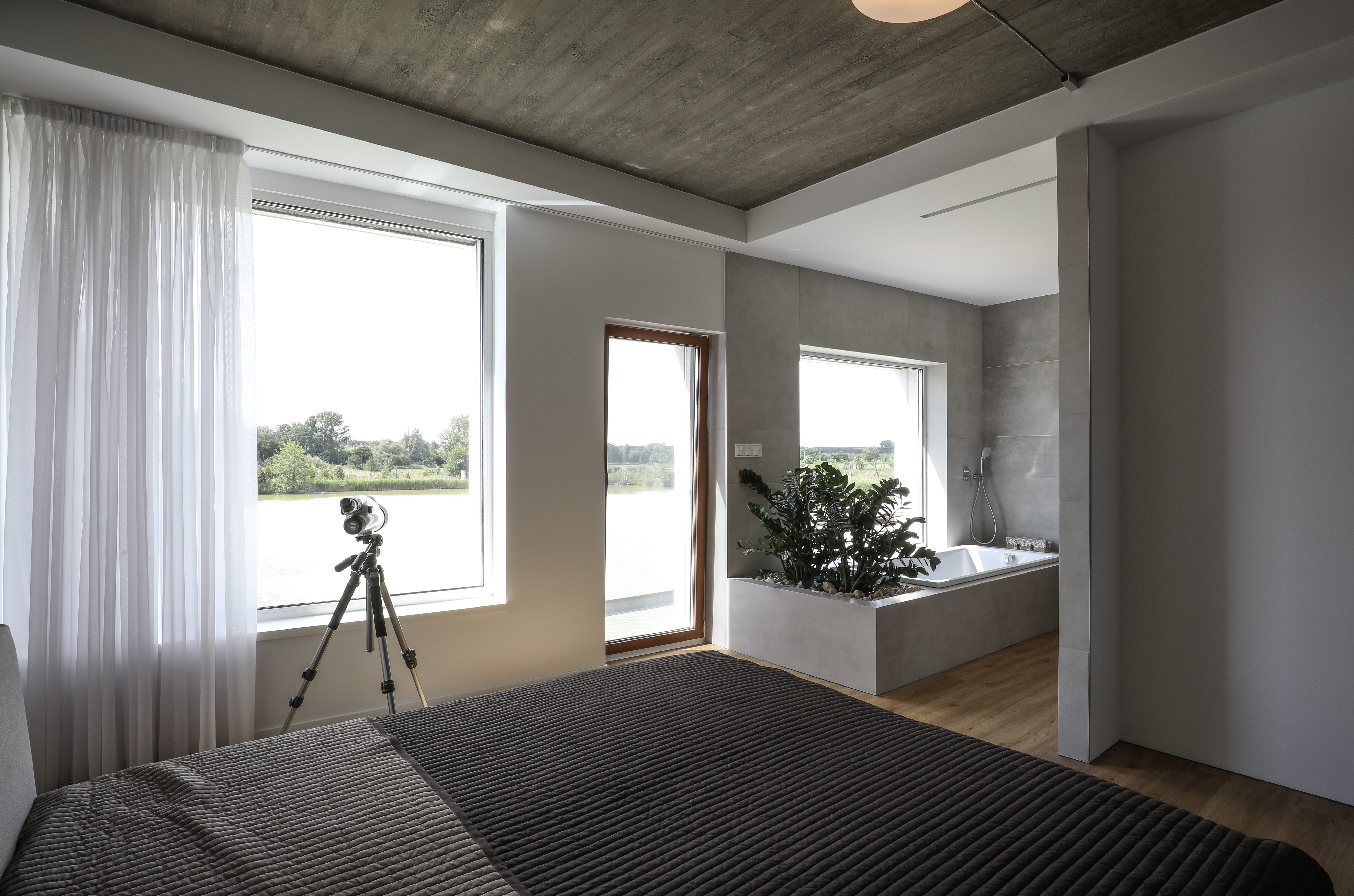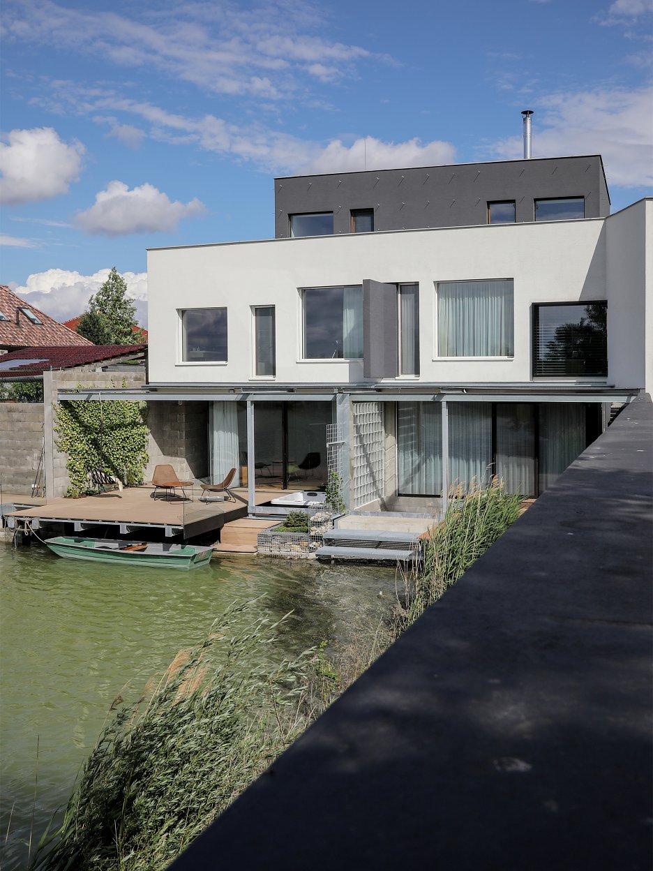 Dvojdom na vode vznikol v obci Kostolište na úzkom a pomerne malom pozemku. Jeho architektonický výraz ovplyvnil určujúci fenomén, ktorým je vodná plocha na ktorej sa nachádza. Filozofiou myšlienky bolo skĺbenie vody, zelene a prírodných materiálov do harmonického celku. Objemová hmota sa v exteriéri tvári ako jeden samostatný objekt, ale pôdorysy sú v princípe zrkadlovým obrazom. Domy sú čiastočne zapustené v teréne. Otvárajú sa tvarovo i výrazovo na dve možné strany. Sú trojpodlažné a vstupy majú umiestnené na strednom podlaží, pričom spoločenská - obytná časť je zapustená v náväznosti na exteriérovú terasu, ktorá je umiestnená priamo nad vodnou plochou.