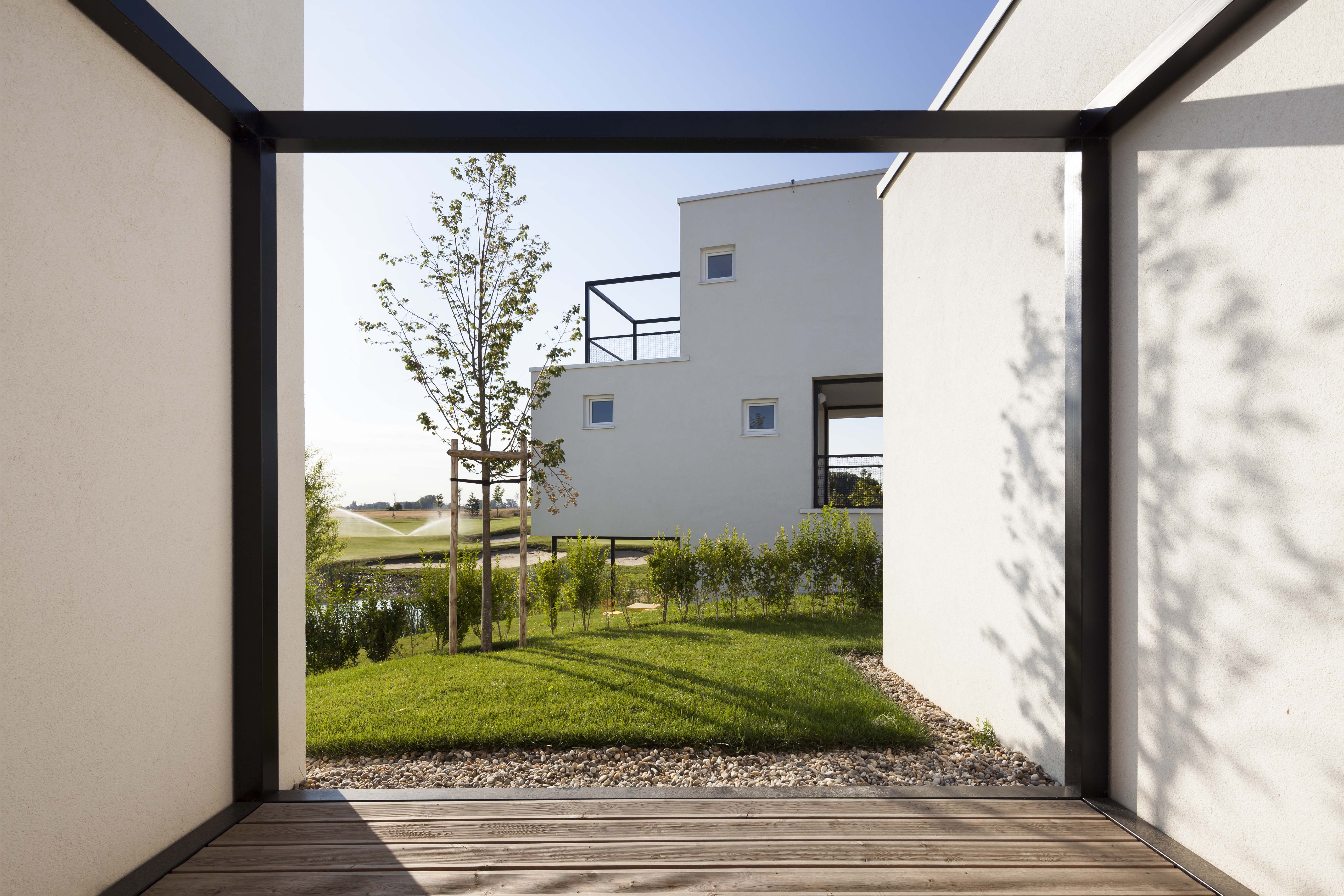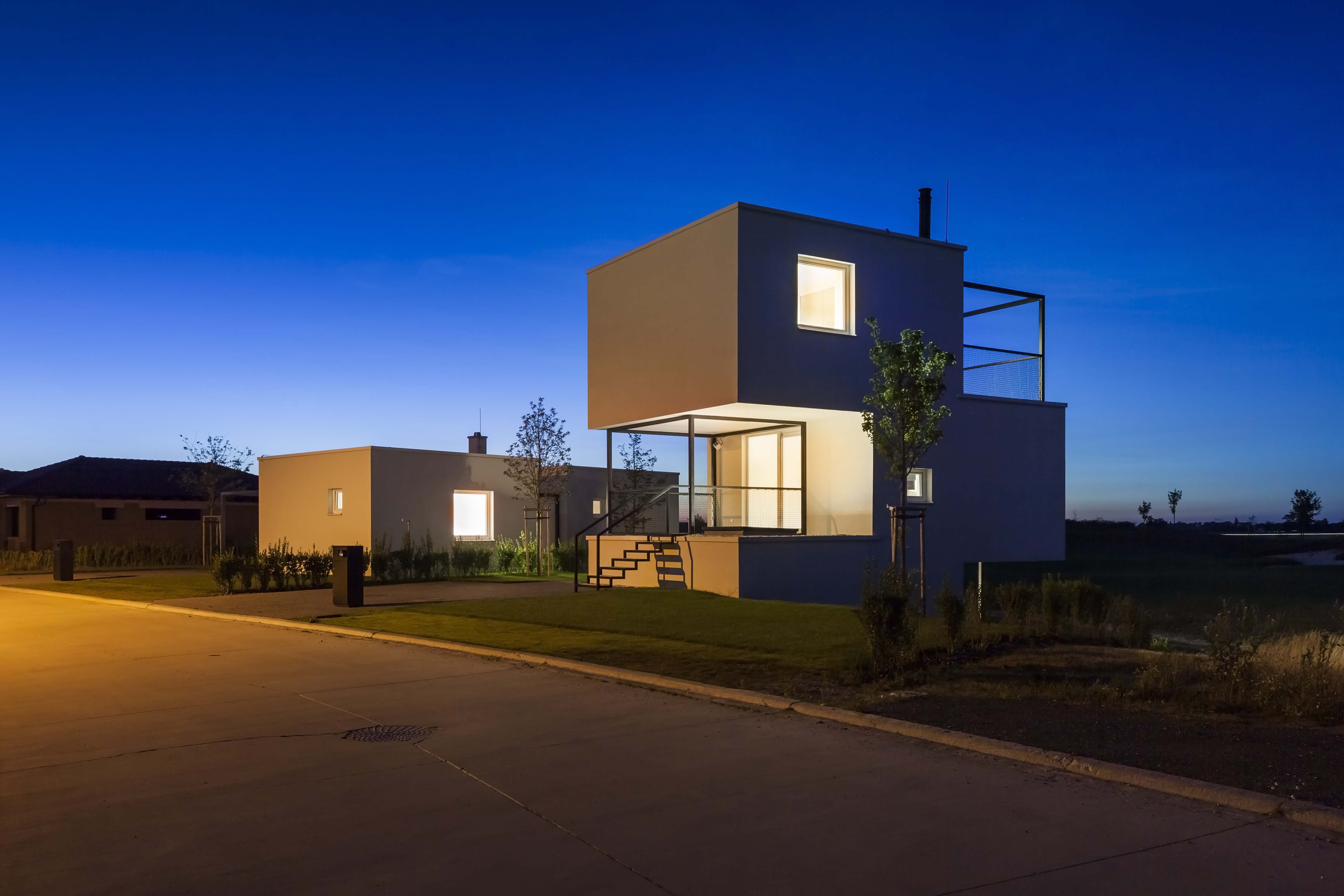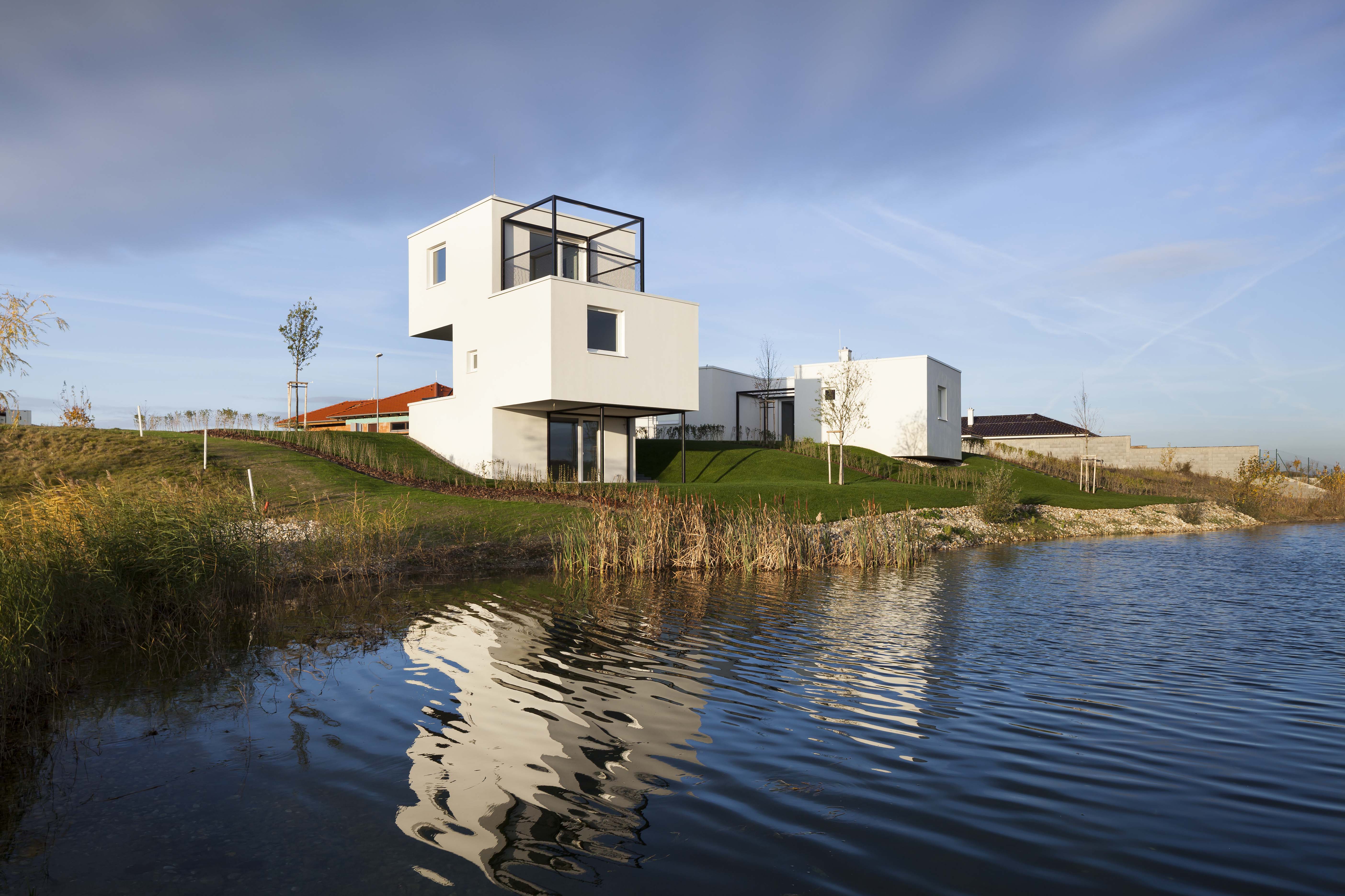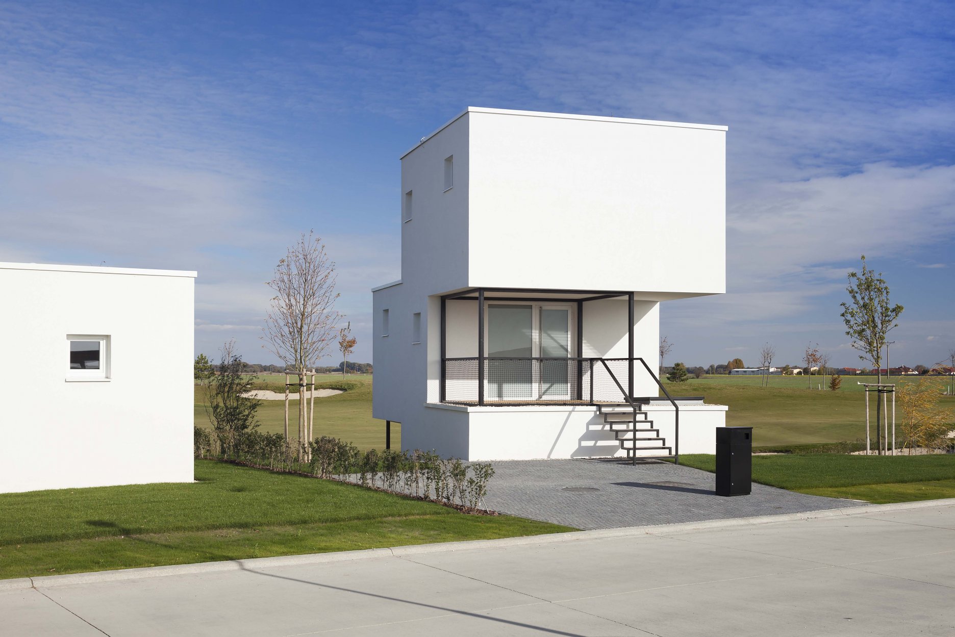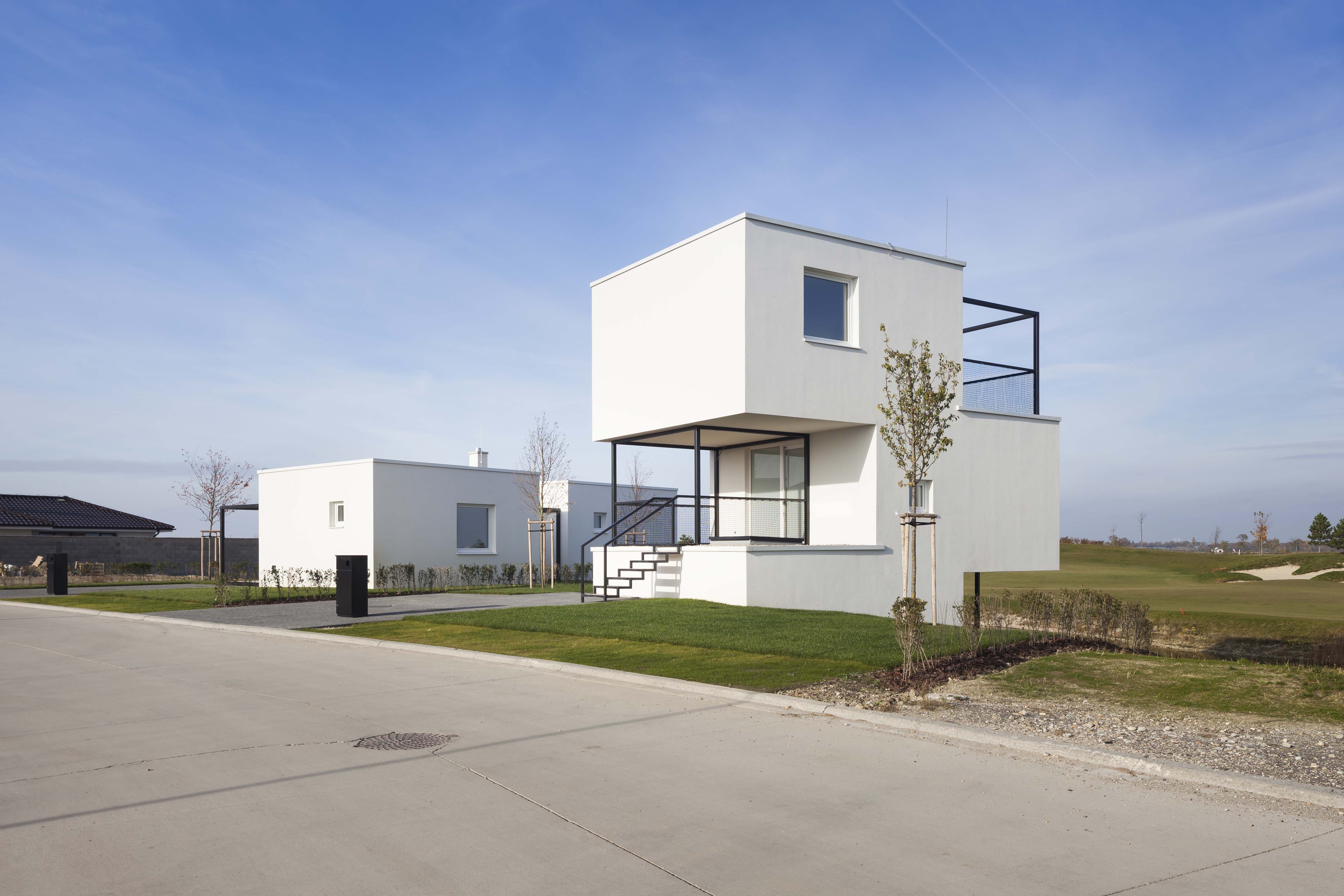Veľkosť domov aj investičné náklady sú v oboch príkladoch takmer totožné, odlišný je systém radenia jednotlivých priestorov. Základný modul - kubus je v prípade domu “A” usporiadaný vertikálne, dom “B” je rozložený horizontálne. Každý kváder má vonkajší rozmer 6 x 6 metrov. Oba domy sa skladajú z troch takýchto kvádrov. Priestor medzi posunutými modulmi je v oboch prípadoch využitý na umiestnenie terás. Domy sú charakterovo rozdielne, hoci používajú rovnaký dispozičný koncept. Vertikálny dom je na rozdiel od bezbariérového “Béčka” skôr extrovert. Poskytuje súkromie, no vonkajšími terasami sa obracia smerom von. Nástupná terasa je otočená do ulice, človek si tam môže sadnúť a komunikovať so susedmi. Z hornej terasy je viditeľná jamka, dá sa sledovať dianie na greene. Spodná terasa s nadväznosťou na spoločenskú časť domu je odvrátená od ulice. V lete je vysunutou časťou domu tienená. Napriek tomu, že je dom je otvorený, je tam miesto na relax a súkromie.