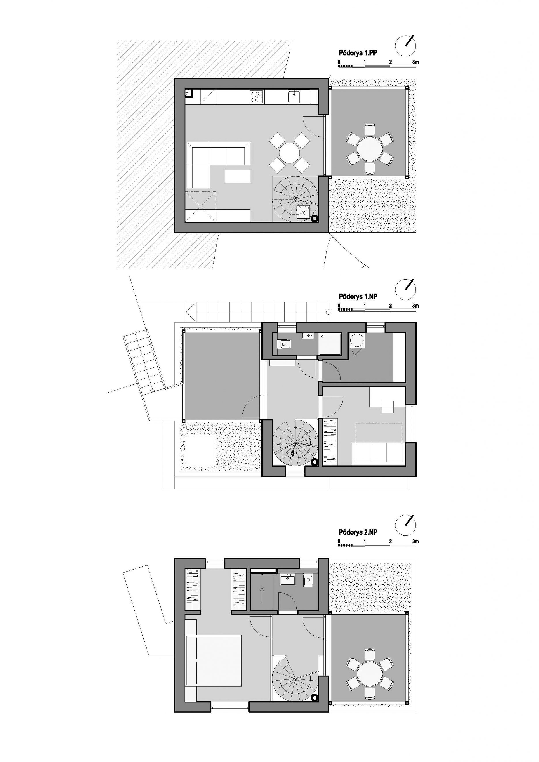 Oba domy v súčastnosti využívajú autori, sú však na predaj. Vertikálny dom má dokončené aj interiéry a dá prenajať. Ak by mal niekto záujem, pripájame link. Horizontálny dom "B" je pripravený pre klienta, ktorý si ho zariadi podľa svojho vkusu.