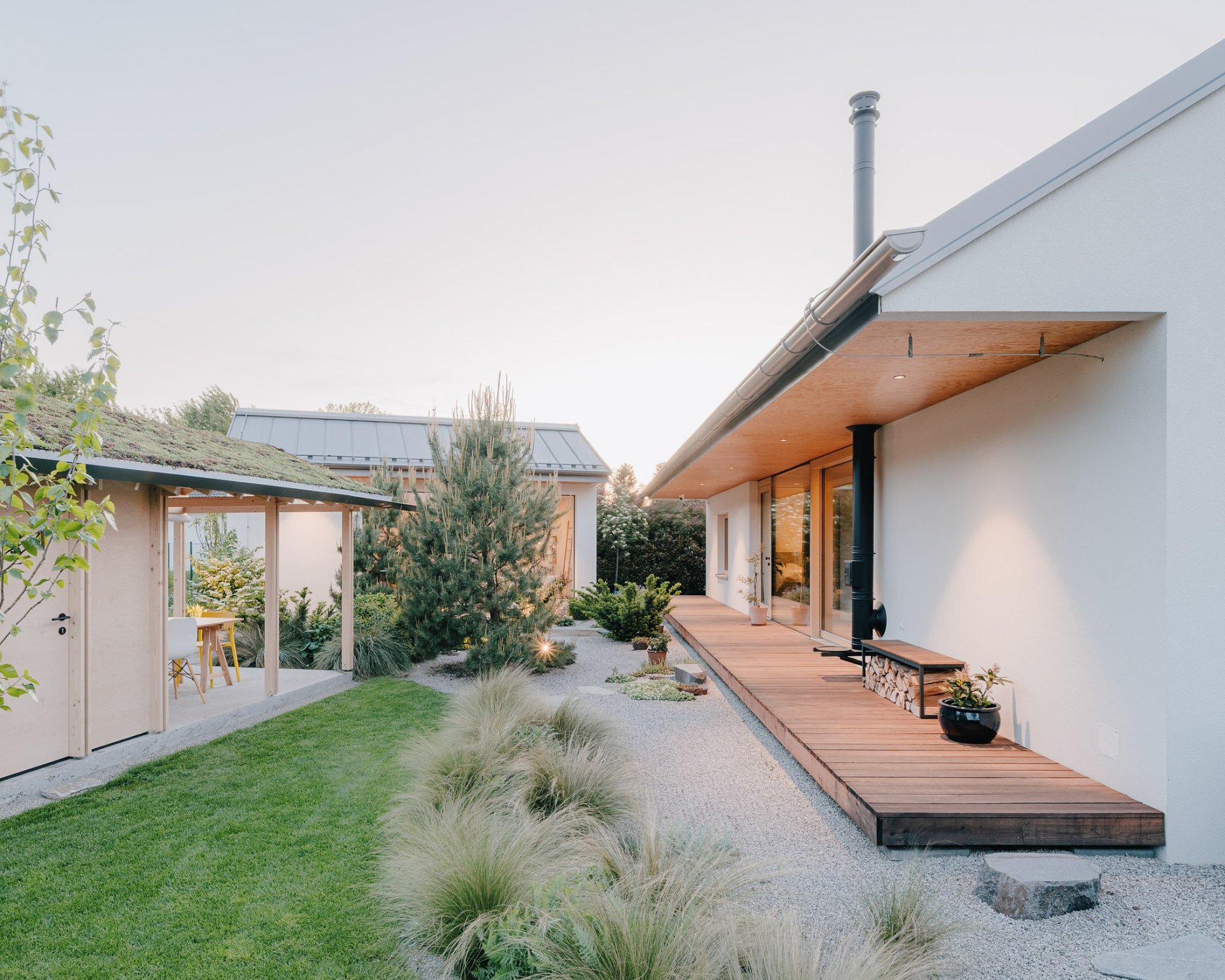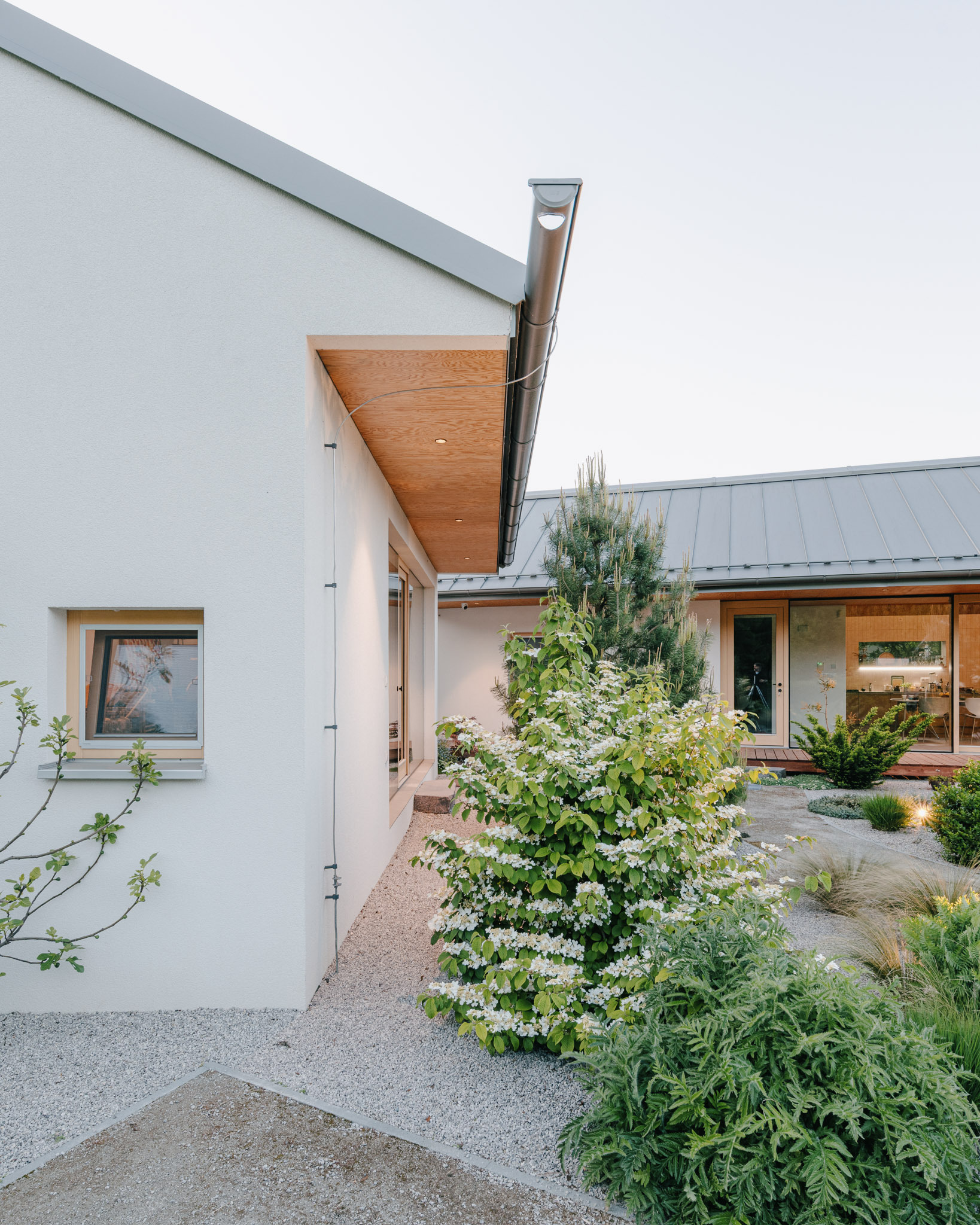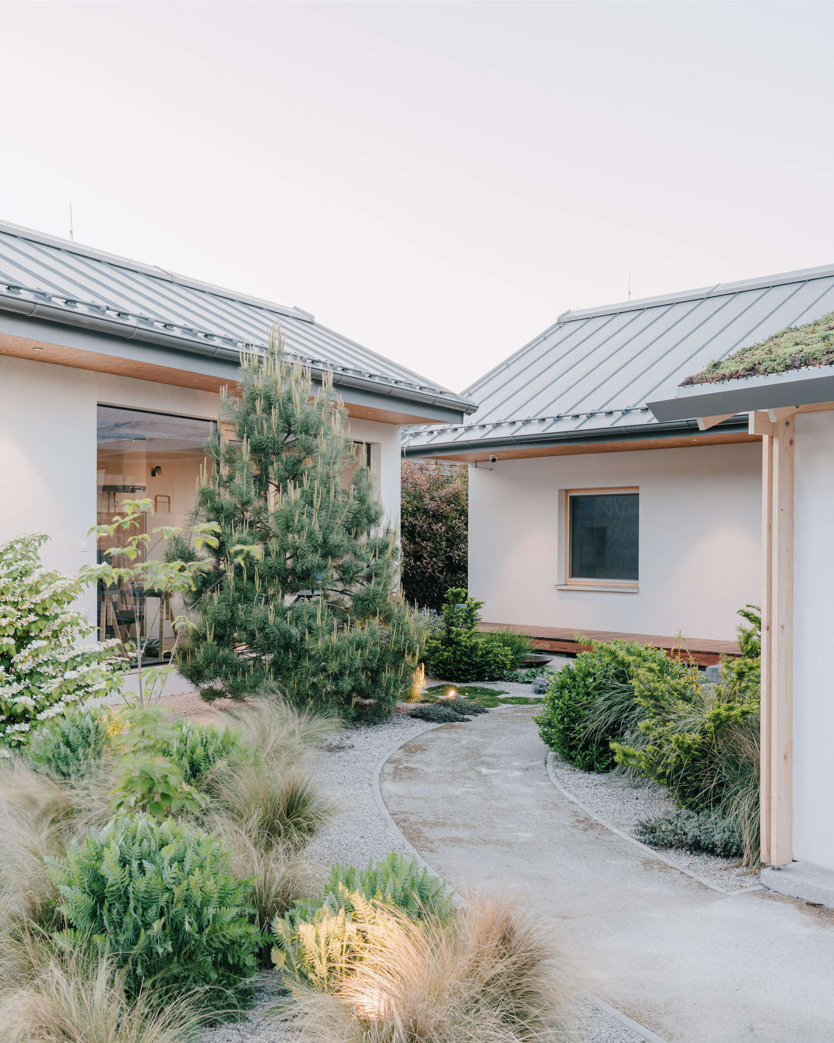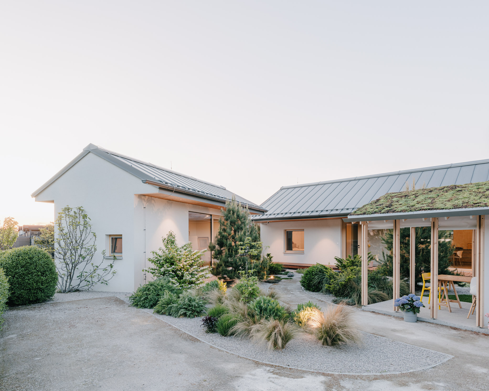Z úzkeho odstupového zbytku medzi domom a plotom vznikajú otvorenejšie pôdorysné trojuholníky, ktoré sa stali funkčnou súčasťou parcely, nie iba normovým odstupom – pestovanie zeleniny, tieňové zákutie, miesto pre auto. Najmenší objekt zakrýva výhľad na parkovacie miesta, ulicu a susedov. Medzi troma objektami vzniká pootvorený chránený dvor, výhľady sú orientované do seba, závesy na veľké zasklenia nie sú potrebné.