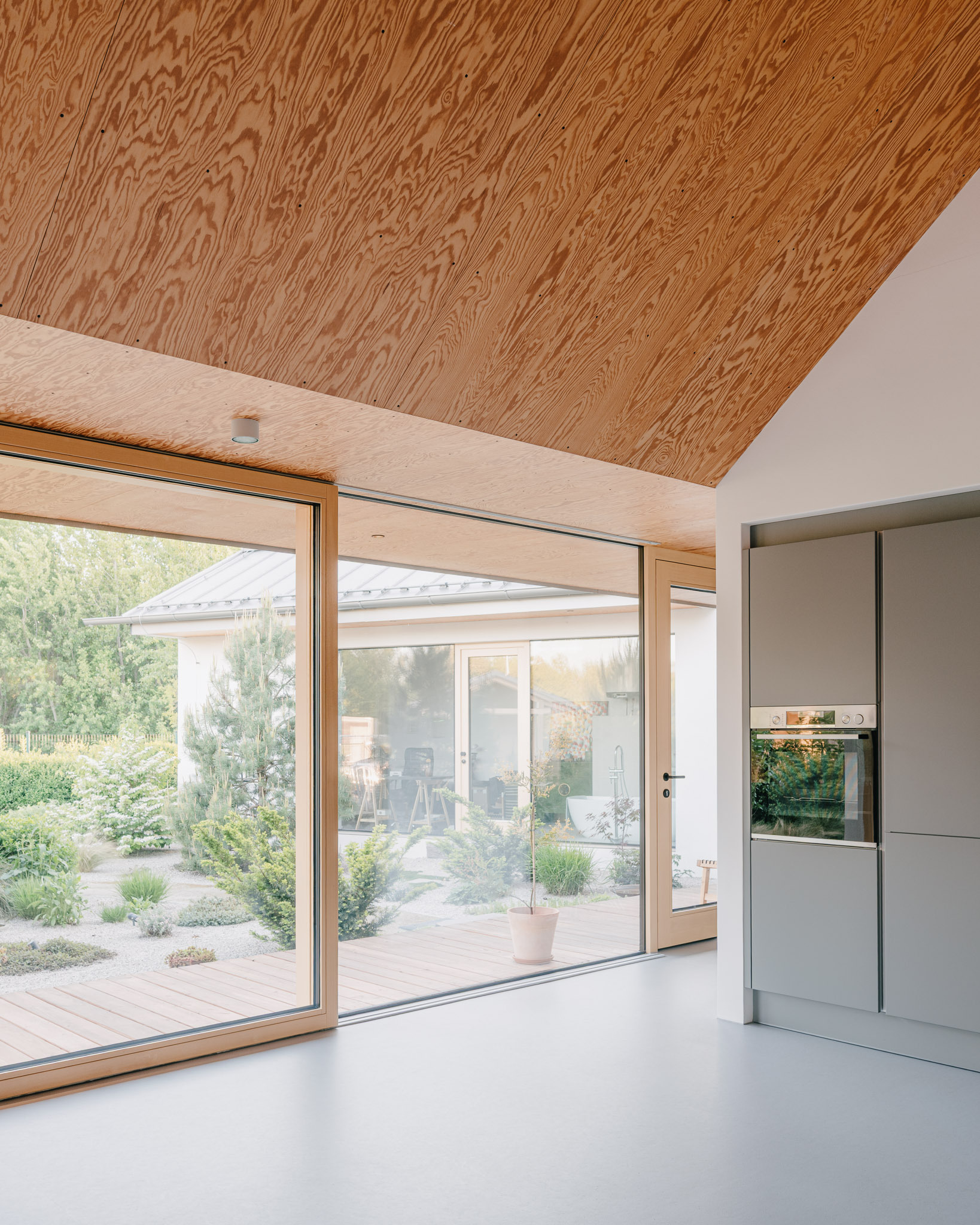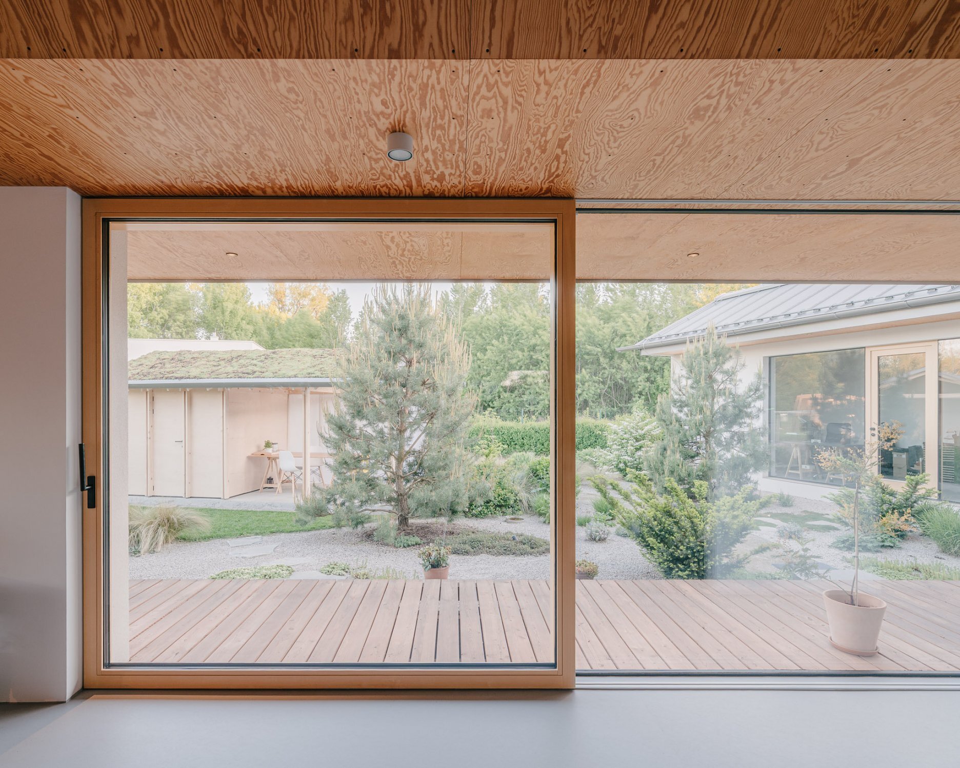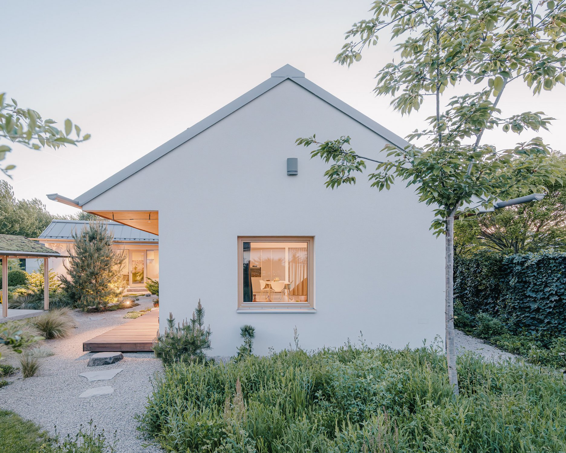 Z úzkeho odstupového zbytku medzi domom a plotom vznikajú otvorenejšie pôdorysné trojuholníky, ktoré sa stali funkčnou súčasťou parcely, nie iba normovým odstupom – pestovanie zeleniny, tieňové zákutie, miesto pre auto. Najmenší objekt zakrýva výhľad na parkovacie miesta, ulicu a susedov. Medzi troma objektami vzniká pootvorený chránený dvor, výhľady sú orientované do seba, závesy na veľké zasklenia nie sú potrebné.