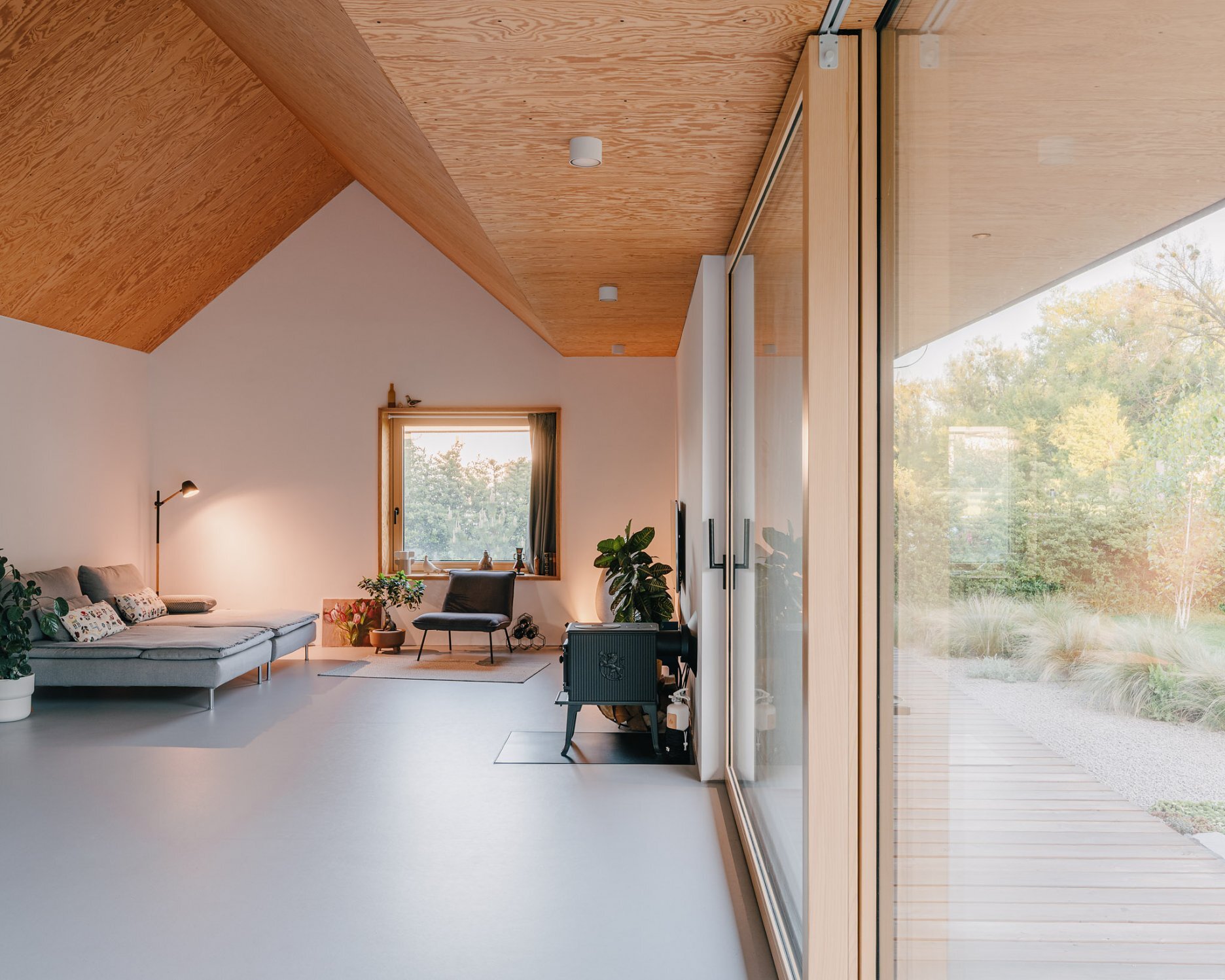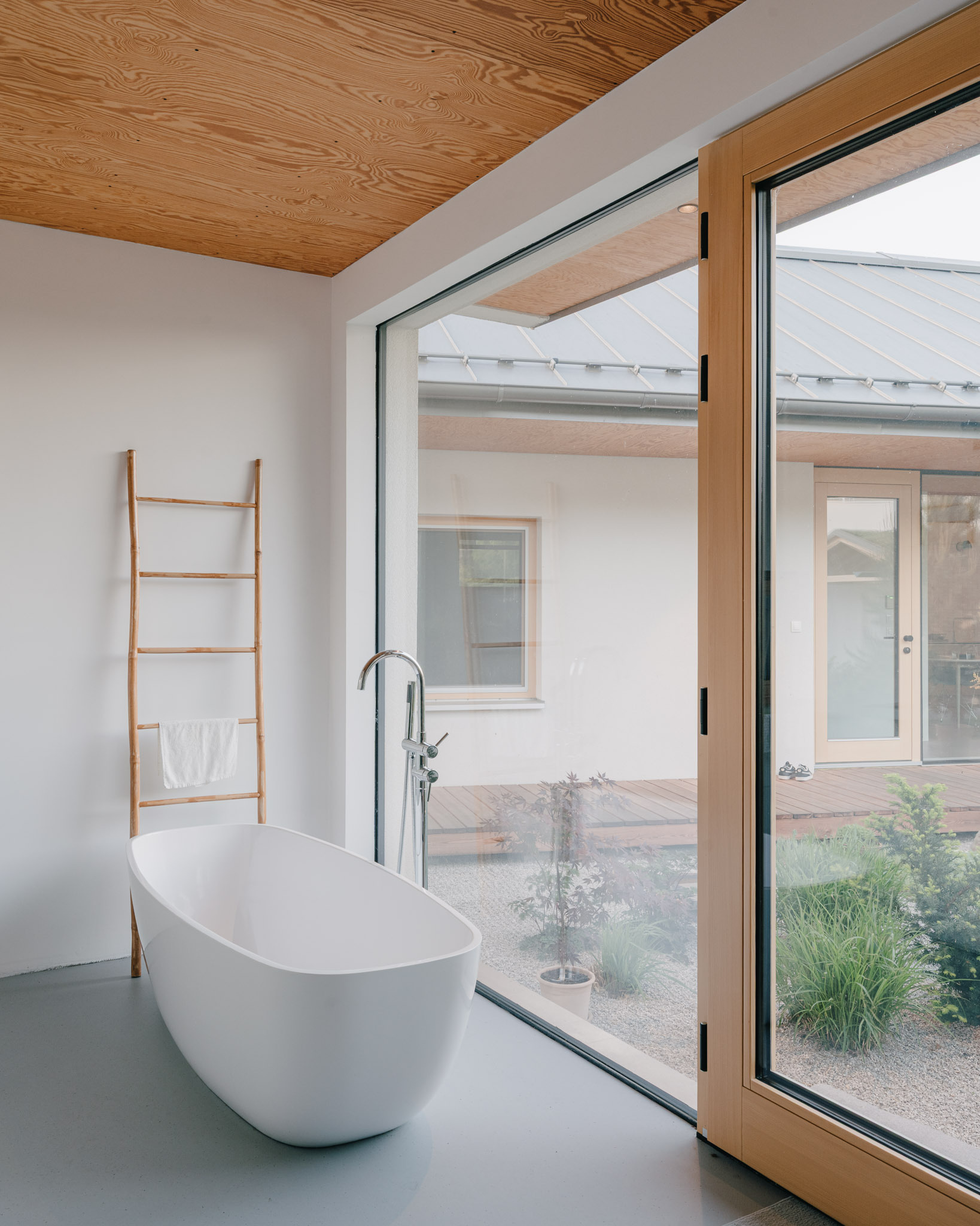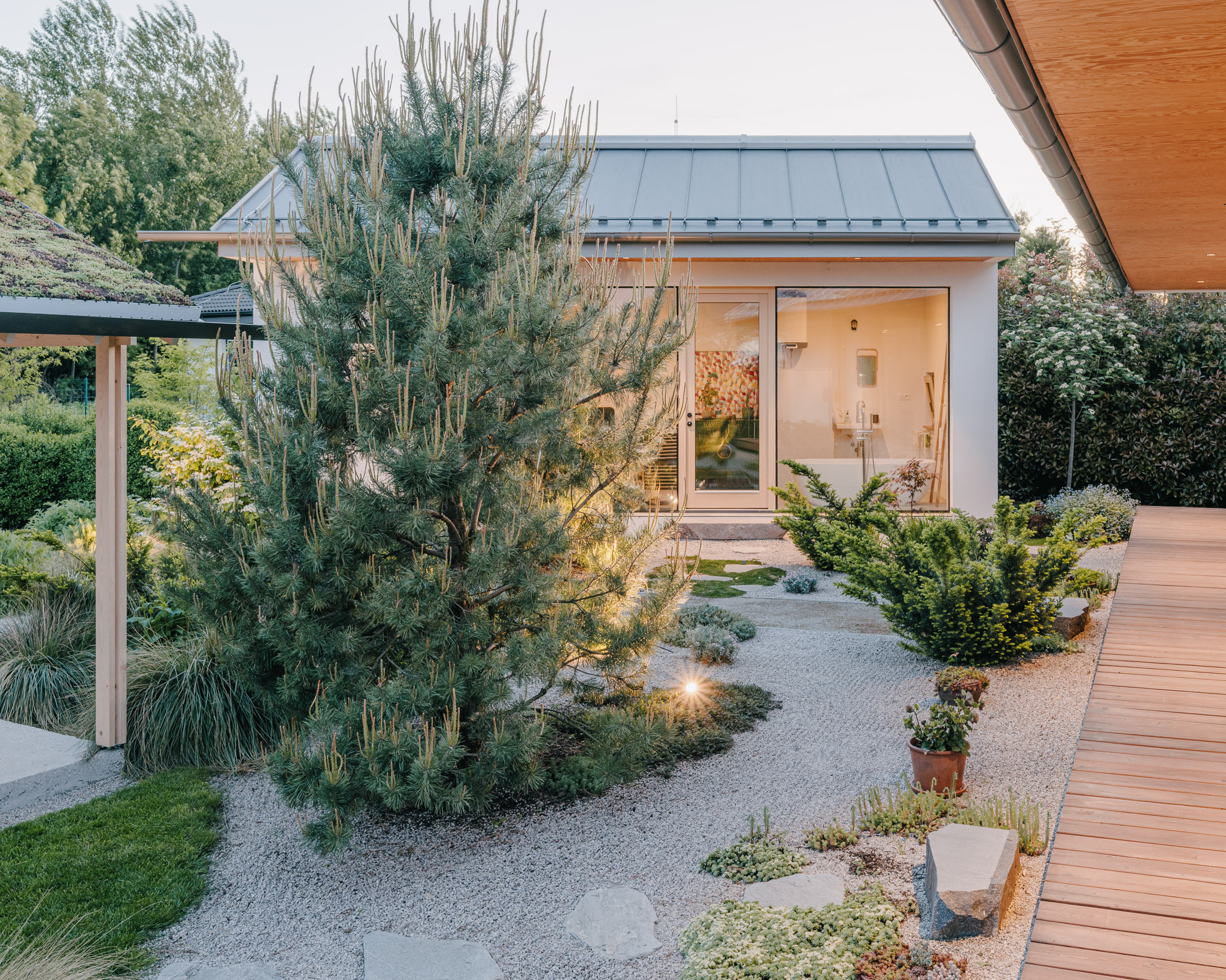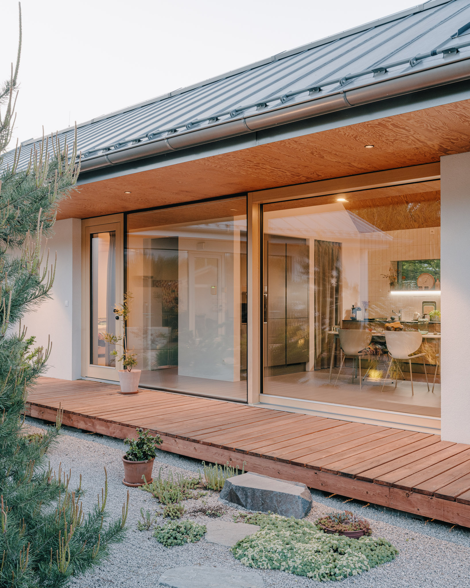 Z úzkeho odstupového zbytku medzi domom a plotom vznikajú otvorenejšie pôdorysné trojuholníky, ktoré sa stali funkčnou súčasťou parcely, nie iba normovým odstupom – pestovanie zeleniny, tieňové zákutie, miesto pre auto. Najmenší objekt zakrýva výhľad na parkovacie miesta, ulicu a susedov. Medzi troma objektami vzniká pootvorený chránený dvor, výhľady sú orientované do seba, závesy na veľké zasklenia nie sú potrebné.