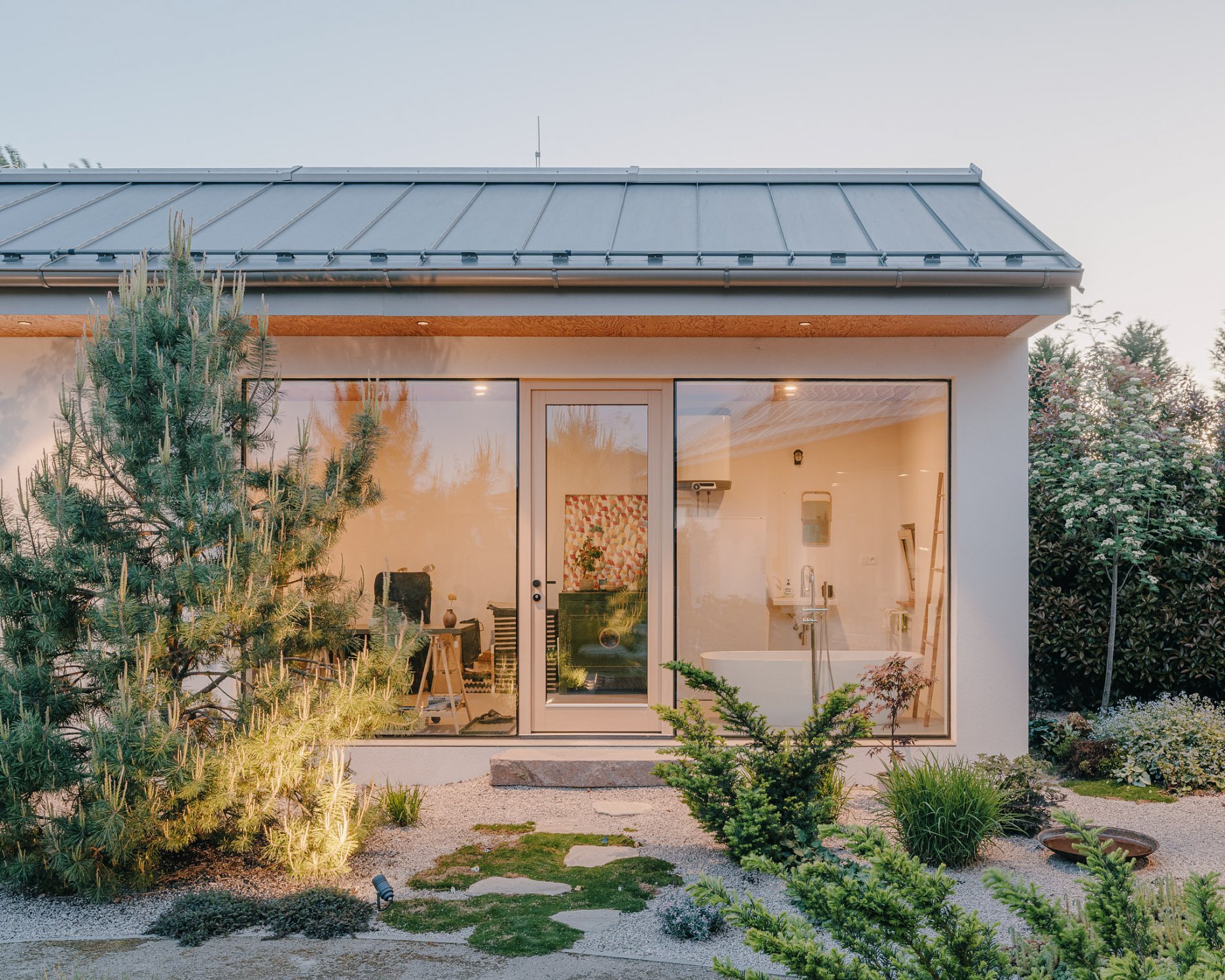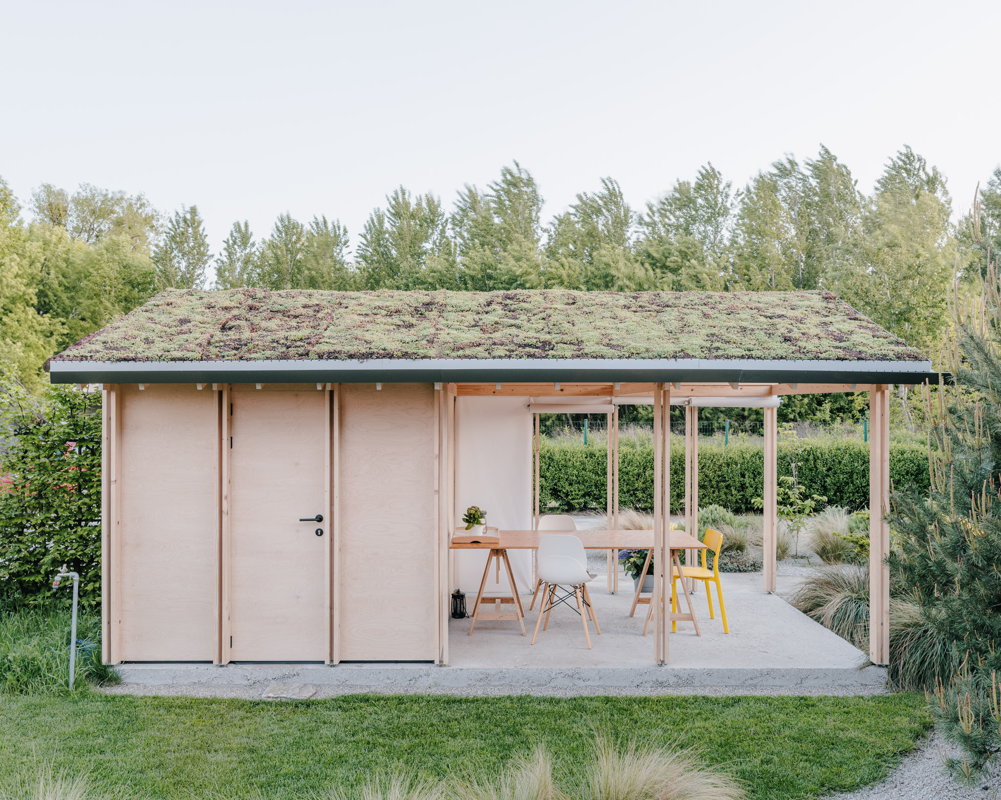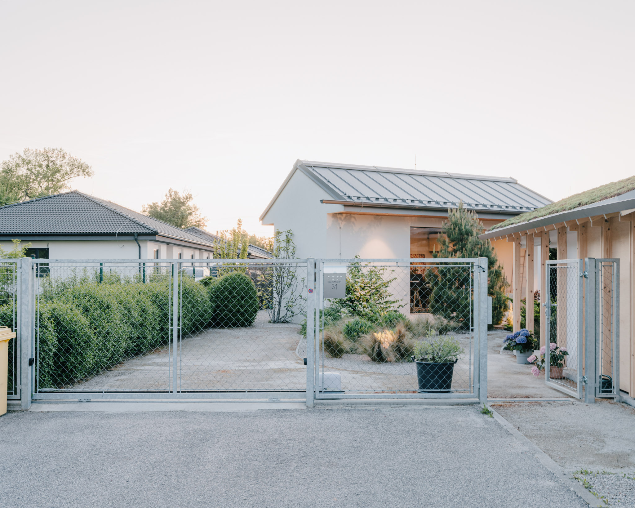 Malý rodinný dom na konci ulice novej štvrte rodinných domov v Bernolákove. Bývanie pozostáva z troch samostatných objektov: rodinný dom, pracovňa a záhradný sklad s altánkom.