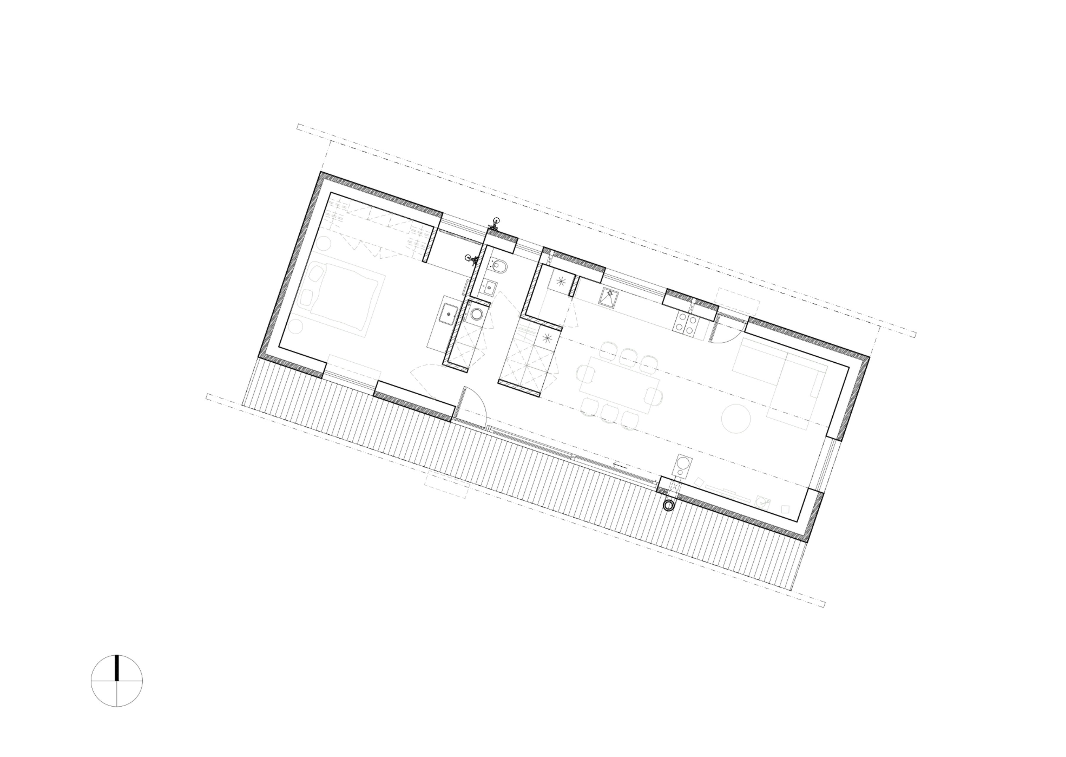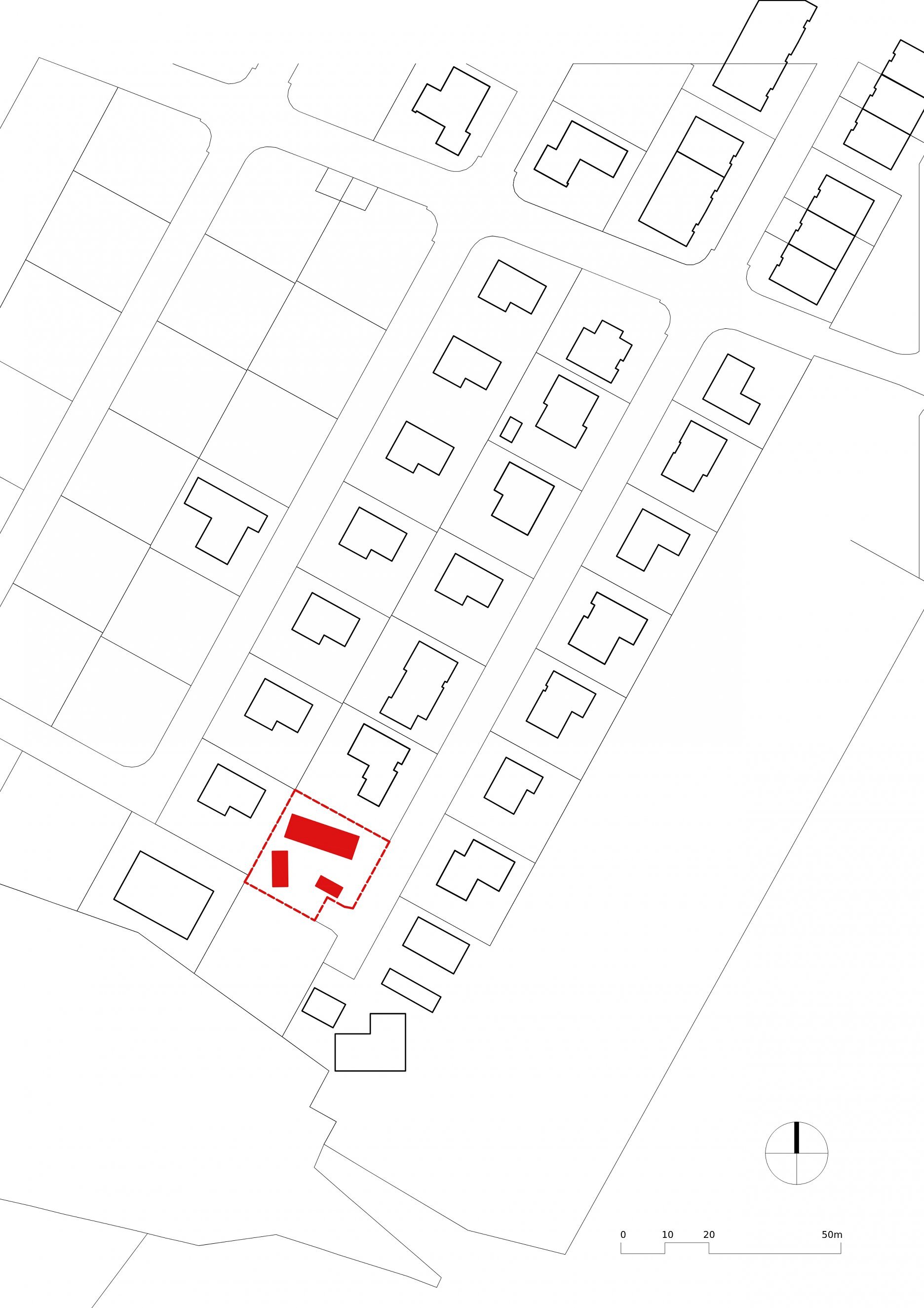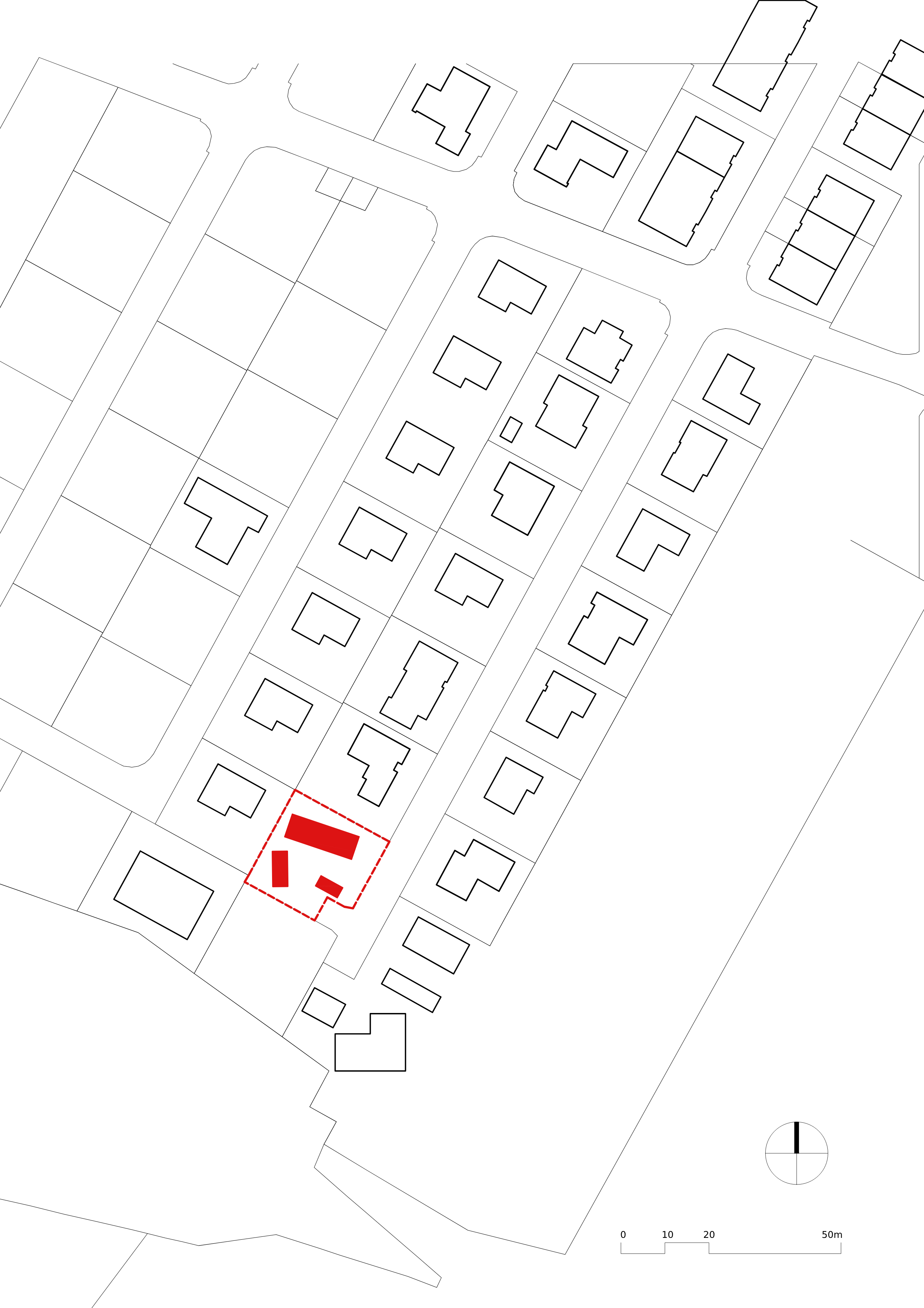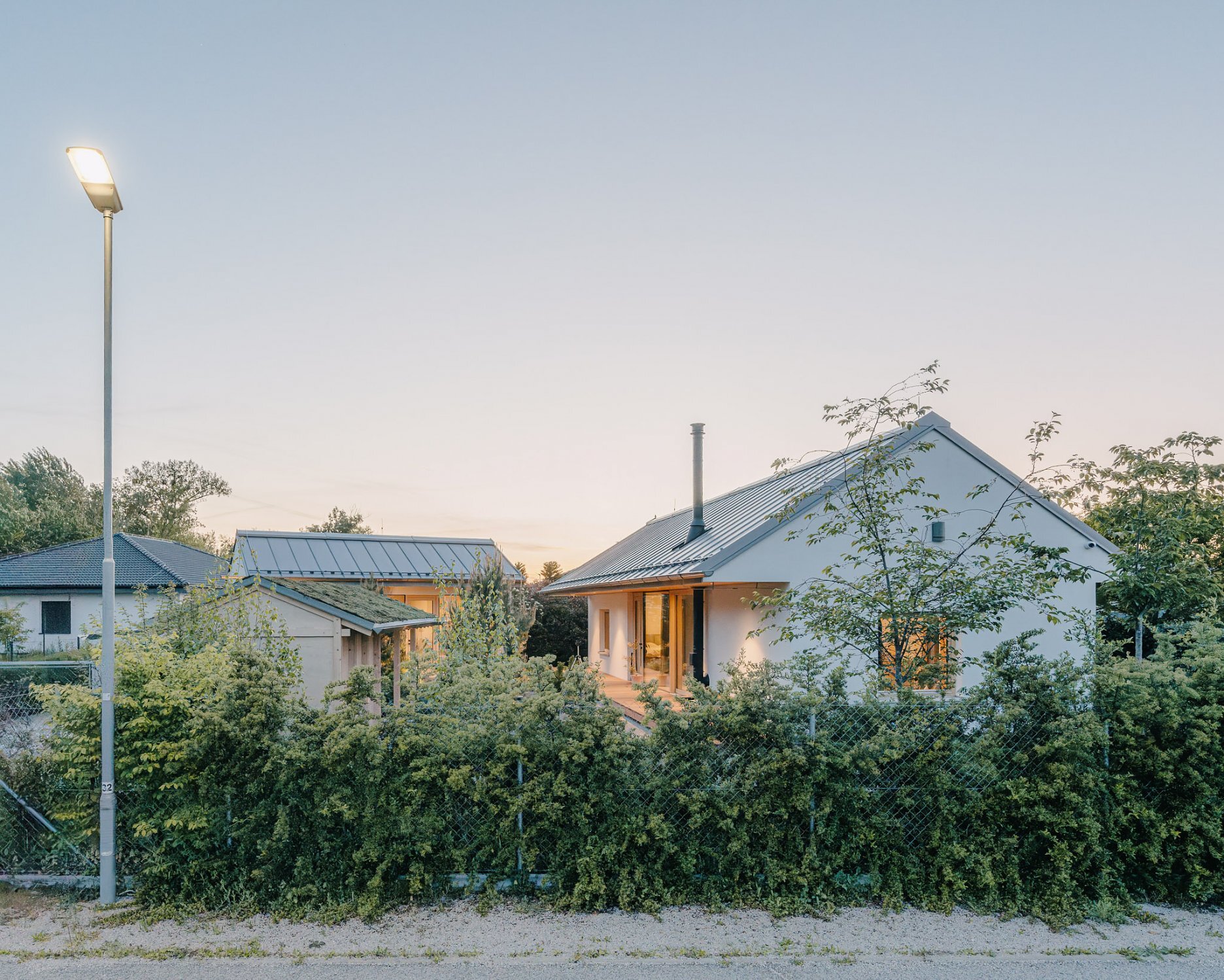 Objekty sú jednoduché hmoty so sedlovou strechou s presahmi, ktoré tu pokladáme za zásadné pre komfort, chránia pre dažďom a slnkom, pobytové priestory sa využívajú častejšie. Samotný rodinný dom má dve obytné miestnosti, rozdelené hygienickým jadrom. Denná časť domu má zvýšený strop s tvarom odlišným od strechy. Dutina medzi podhľadom a strechou je na juhu, chráni pred prehrievaním. Dom na konci ulice sa stáva komunitným miestom.