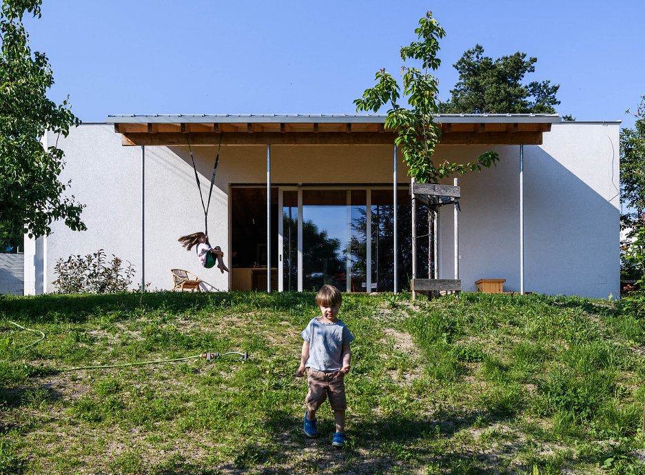 Dôležitou súčasťou návrhového konceptu je usporiadanie a členenie záhrady. Hmota domu delí pozemok na tri funkčné zóny. Vrchný cíp s parkovaním a miestom pre záhradný domček, južný výbežok s terasou a výhľadom do prislúchajúceho ovocného sadu a napokon východný roh s posedením pod vysokou borovicou. Architekti sa vyhli "splanírovaniu" parcely. Terén nechávajú plynúť v prirodzenom spáde.