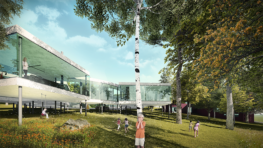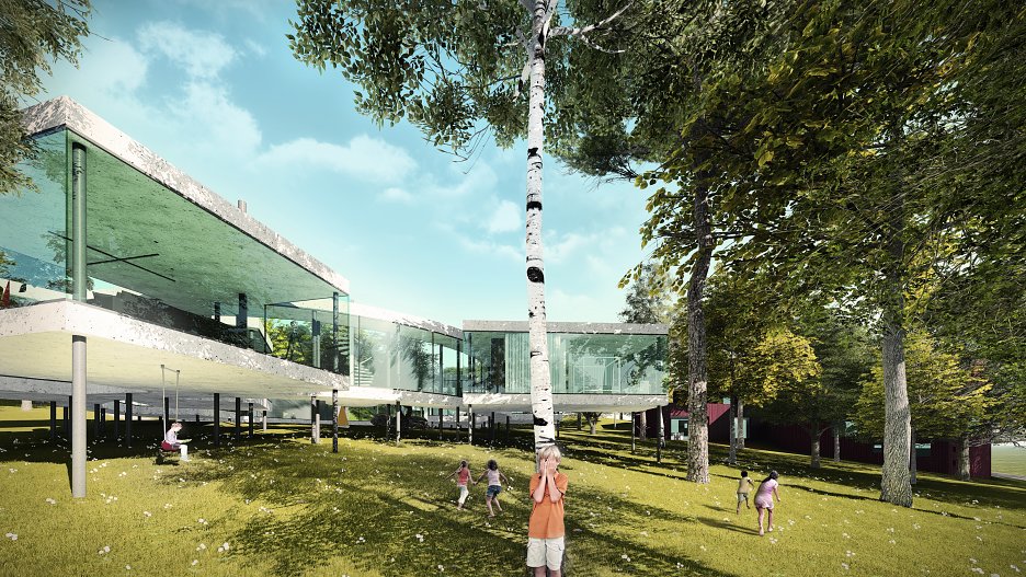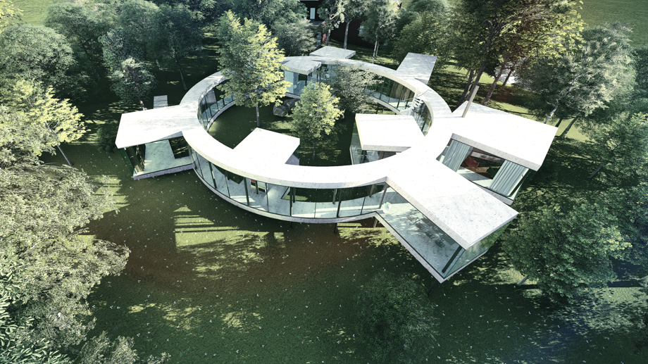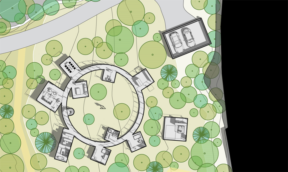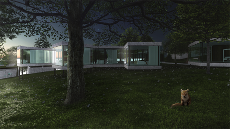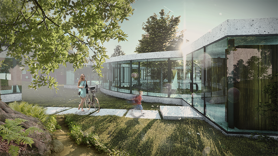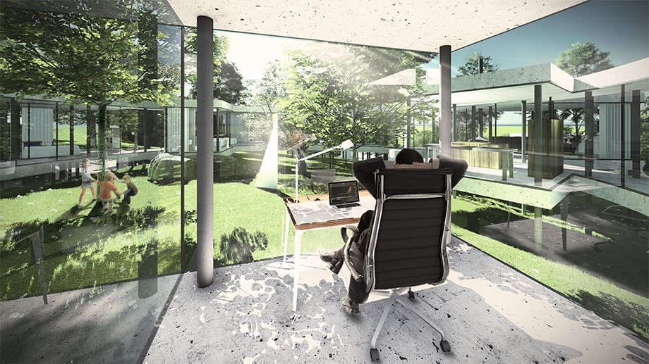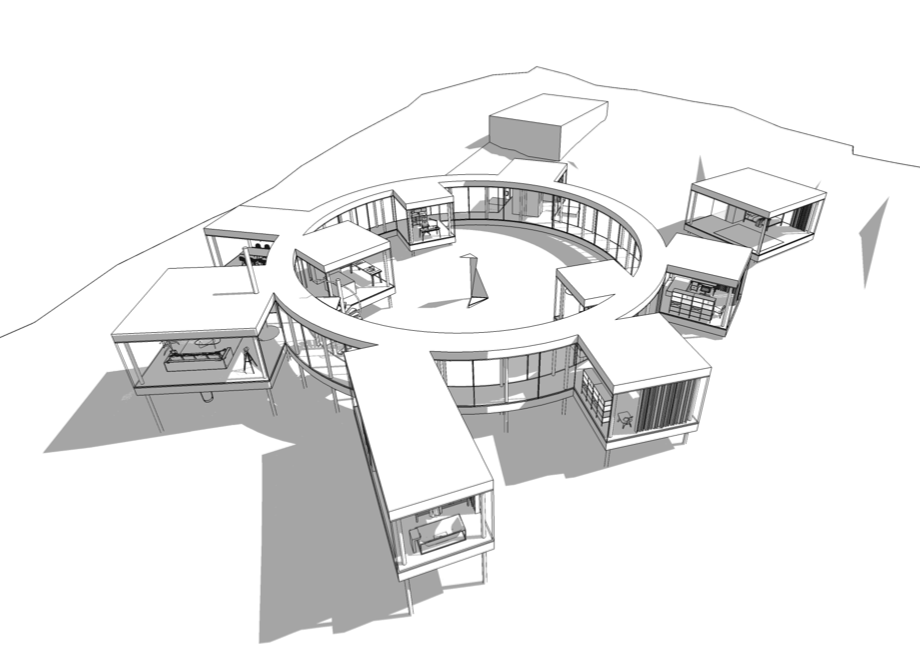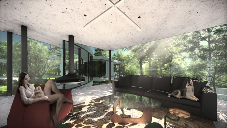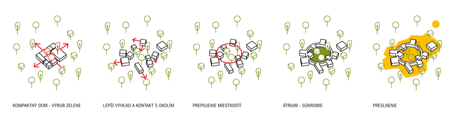 Cieľom bolo navrhnúť rodinný dom, ktorý bude poskytoval užívateľovi maximálny možný kontakt s okolím. Okolie tvoria, v súčasnosti zanedbané, záhrady a les. Jednotlivé miestnosti domu sú "voľne" rozložené na pozemku tak, aby mali správnu orientáciu, výhľady a vzájomné vzťahy, a tak aby zbytočne stavbe nepadali za obeť stromy. Priestory spája kruhová chodba, vzniká átrium. Objekt nekopíruje svažitosť terénu, stojí na koloch, pozemok tak objekt podteká a prepája inak uzavreté átrium s okolitým prostredím.