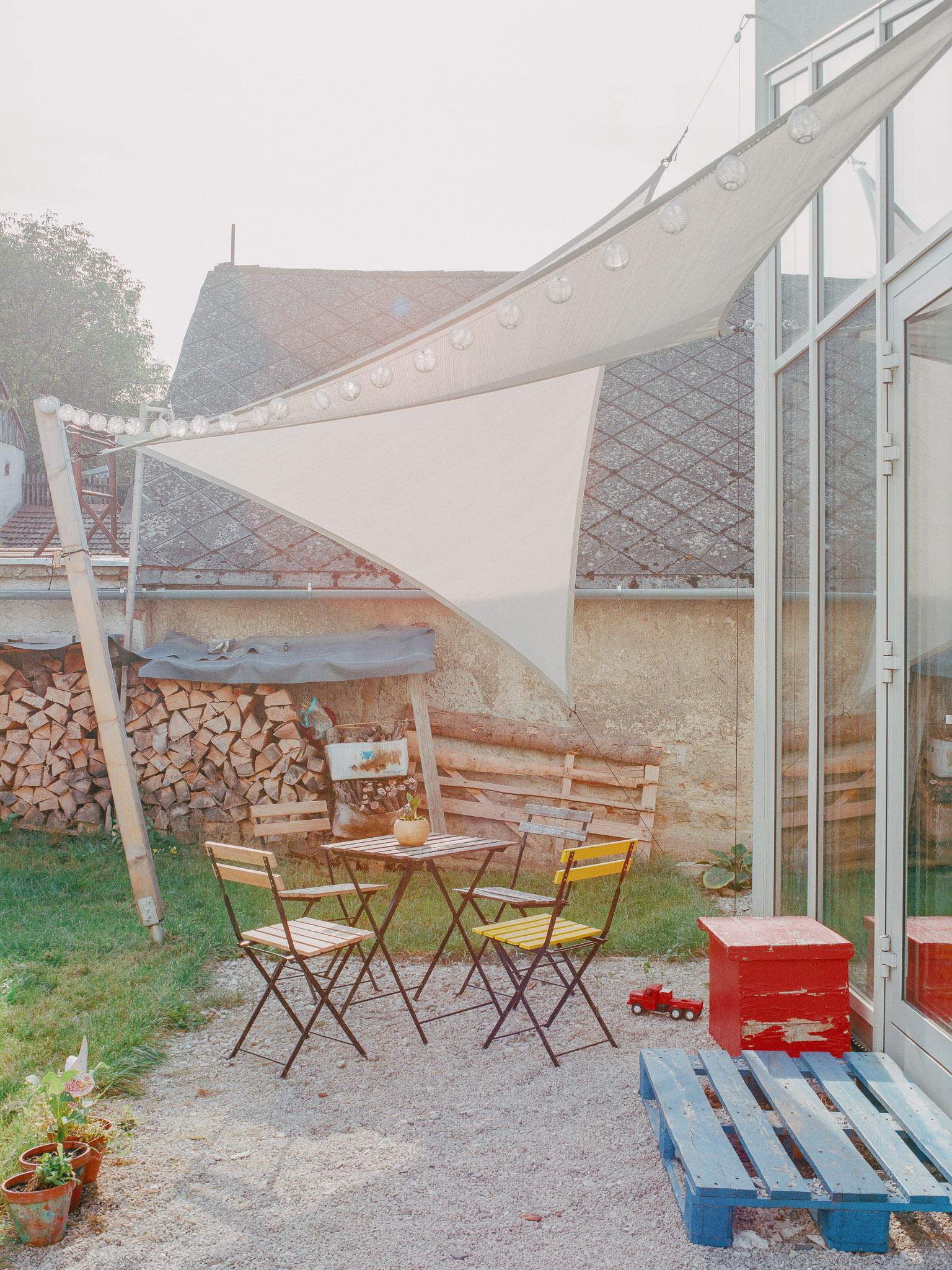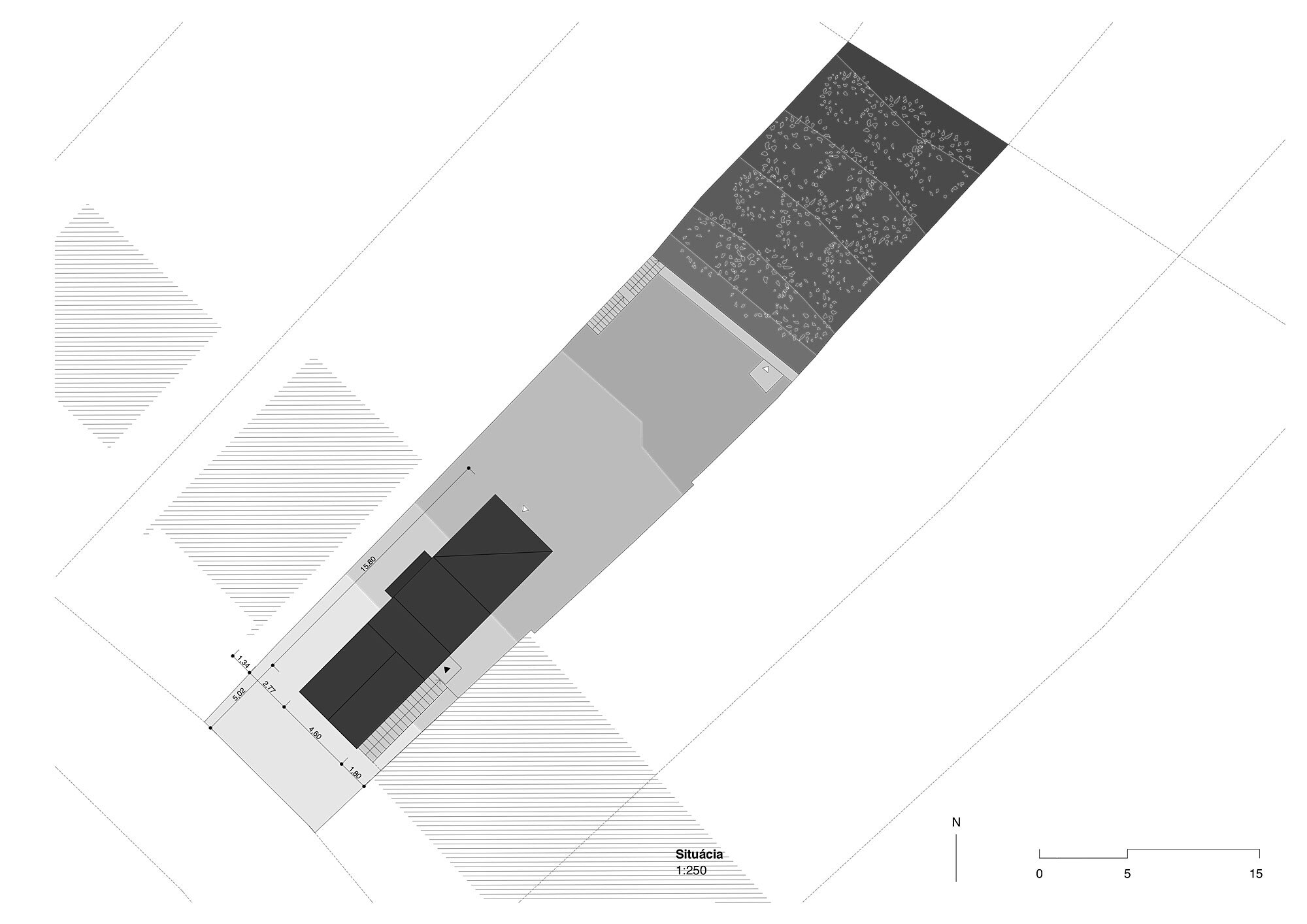 Úzka a dlhá parcela stúpa od ulice smerom na západ a v zadnej časti pozemku terénnym zlomom náhle stúpa, vytvára terasu. Tu bude úžitková záhrada.