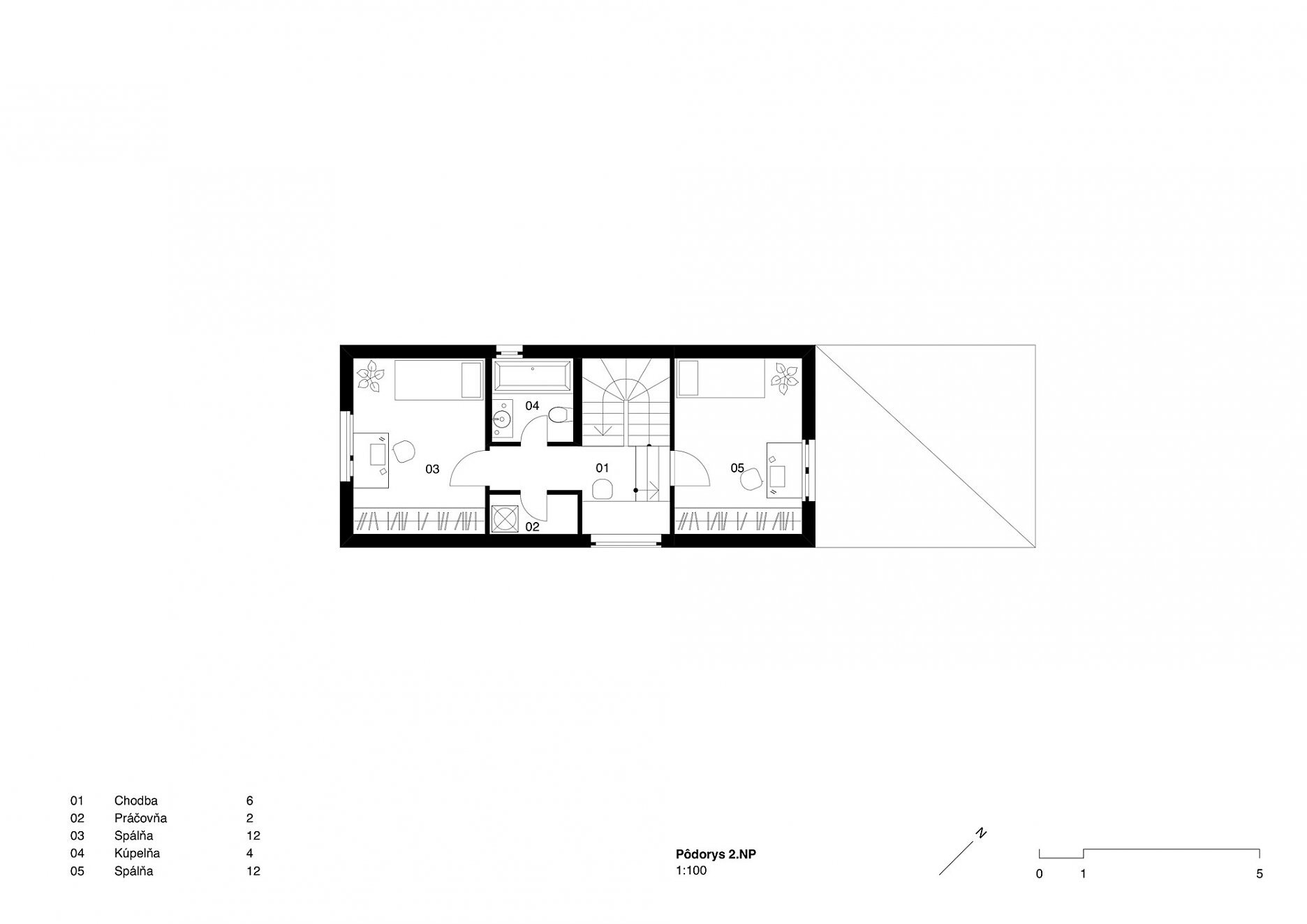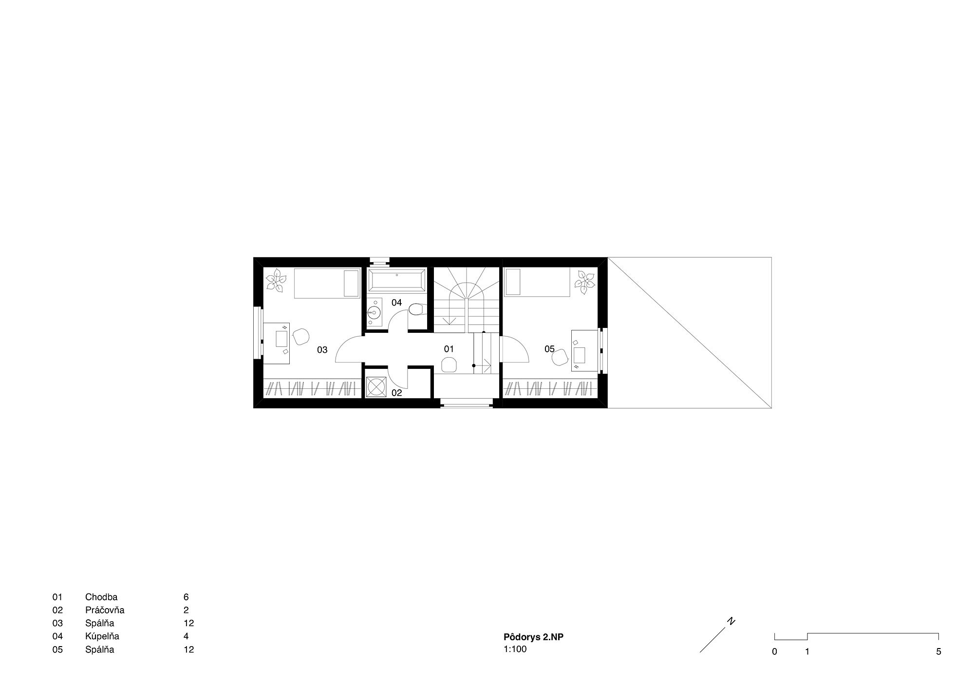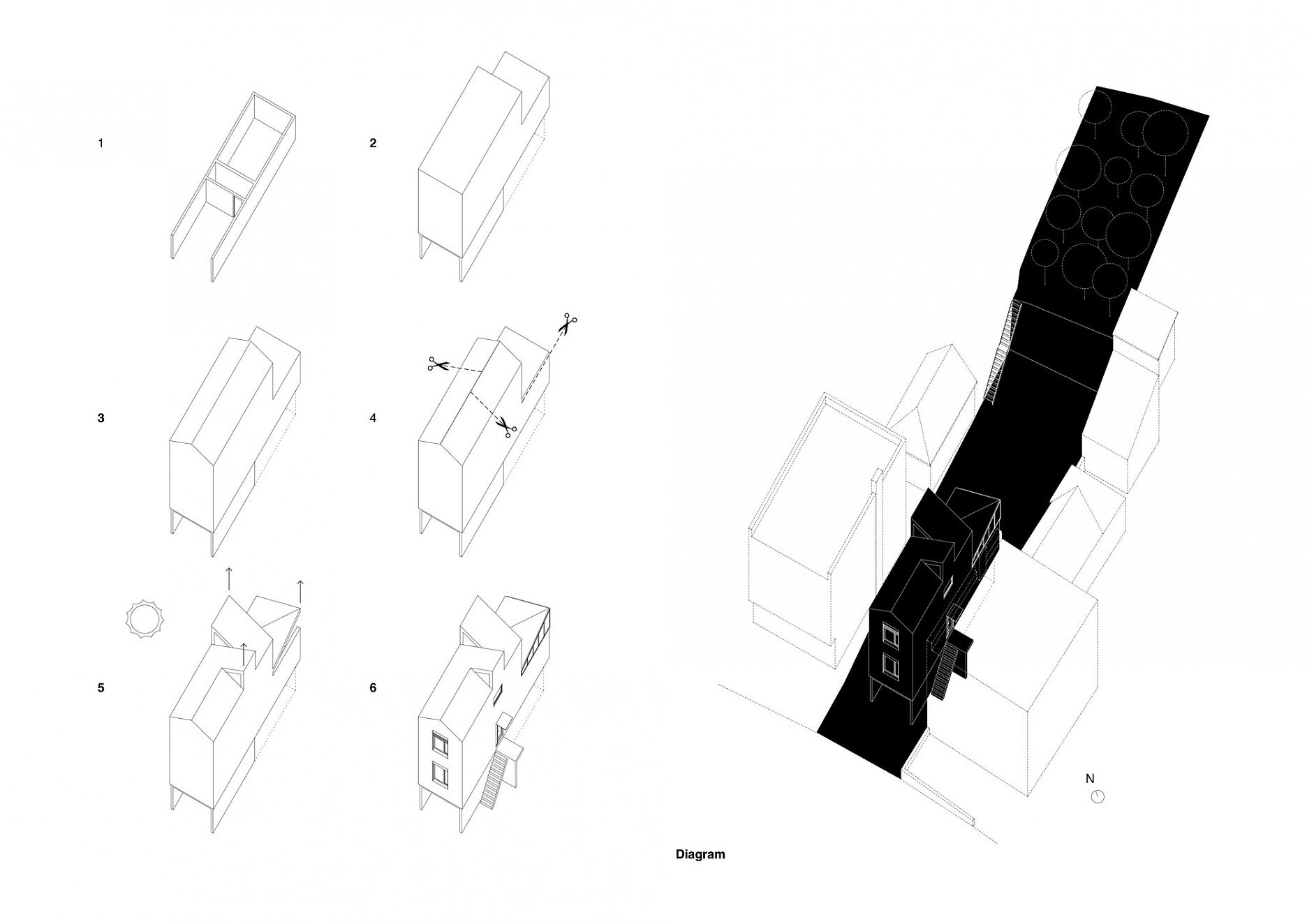 Štíhly lineárny objekt zastrešujeme šikmou strechou, podľa predpísanej regulácie. Striedame sedlovú strechu s pultovou v rôznych sklonoch. Takýmto spôsobom adresujeme problém s presvetlením obytných miestností. Keďže sa južnou fasádou nachádzame v tesnej blízkosti susedného domu, nie je možné umiestniť otvory do tejto fasády. Rôzne uhly striech vo svojich prienikoch vytvárajú priestor pre svetlíky.
