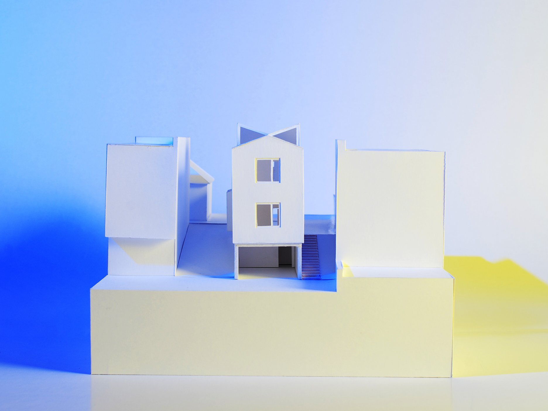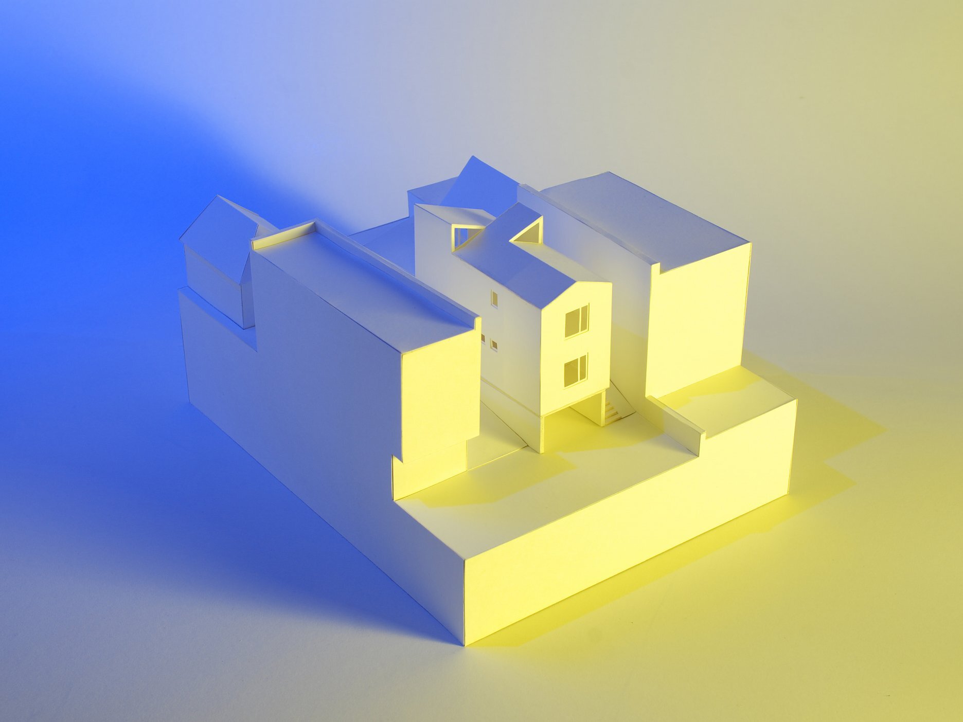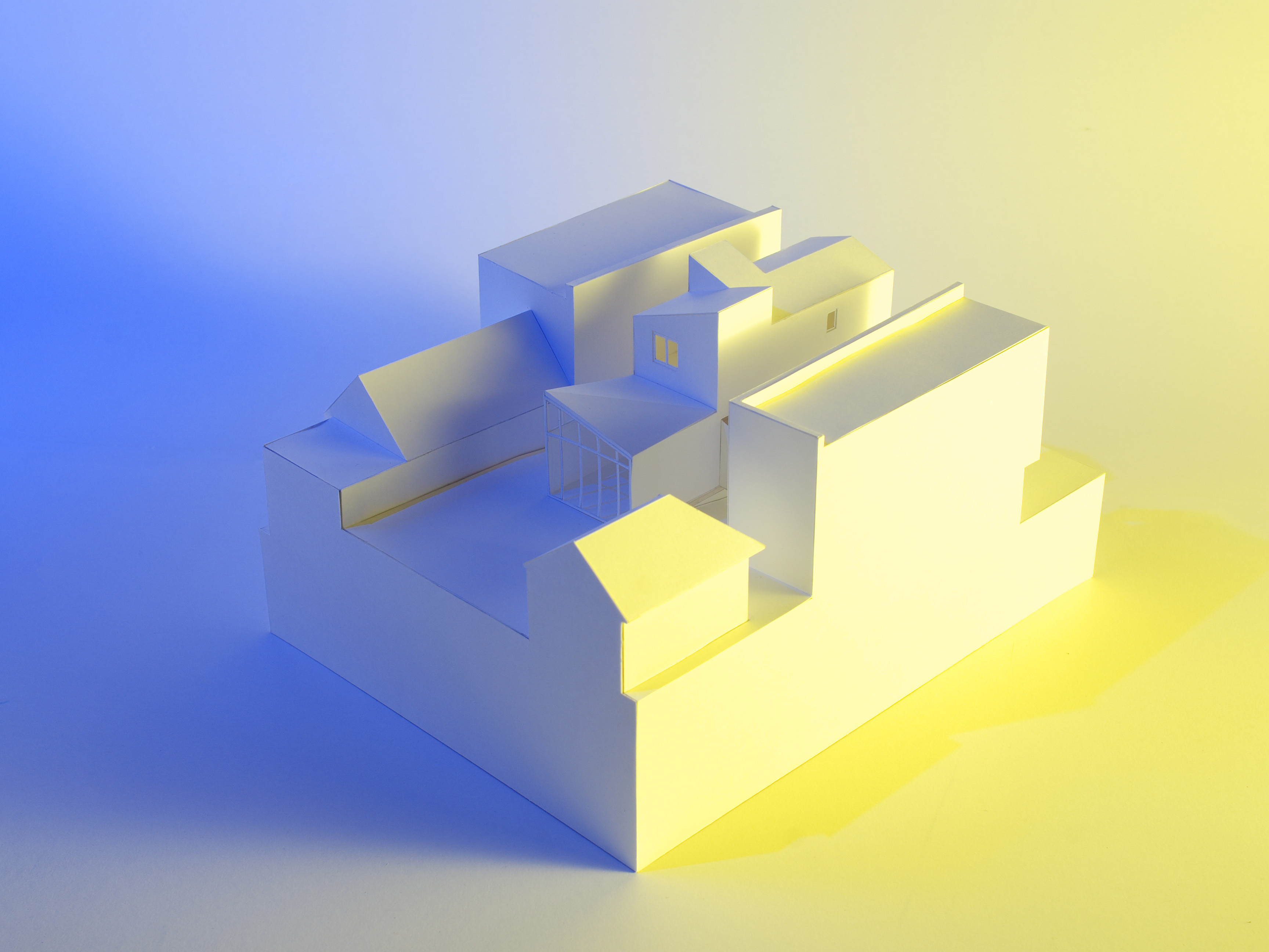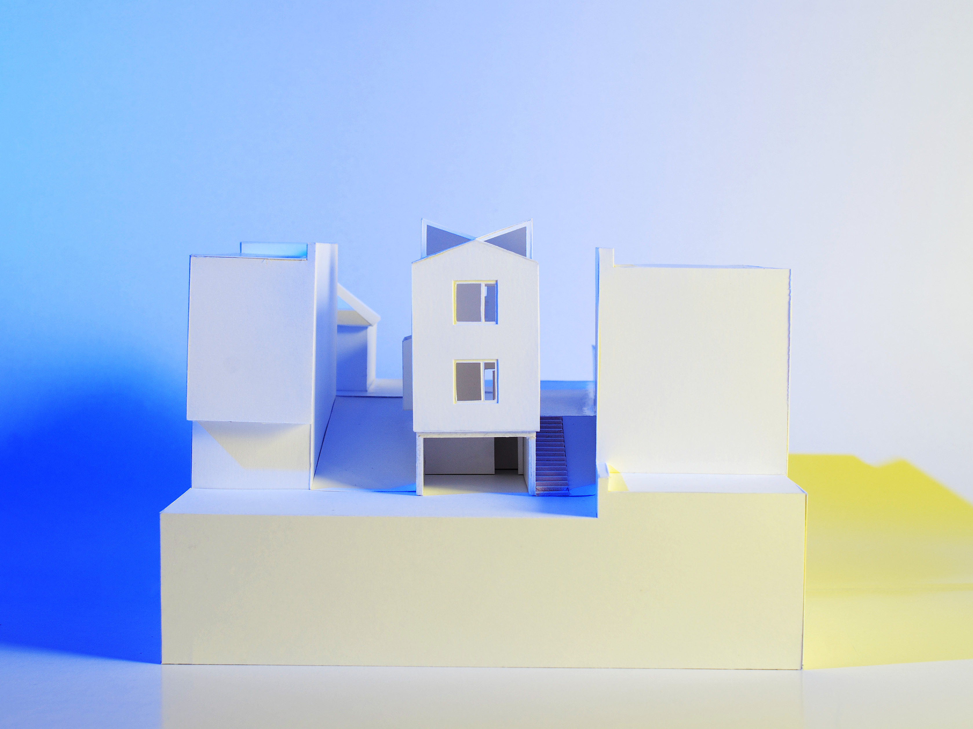 Štíhly lineárny objekt zastrešujeme šikmou strechou, podľa predpísanej regulácie. Striedame sedlovú strechu s pultovou v rôznych sklonoch. Takýmto spôsobom adresujeme problém s presvetlením obytných miestností. Keďže sa južnou fasádou nachádzame v tesnej blízkosti susedného domu, nie je možné umiestniť otvory do tejto fasády. Rôzne uhly striech vo svojich prienikoch vytvárajú priestor pre svetlíky.