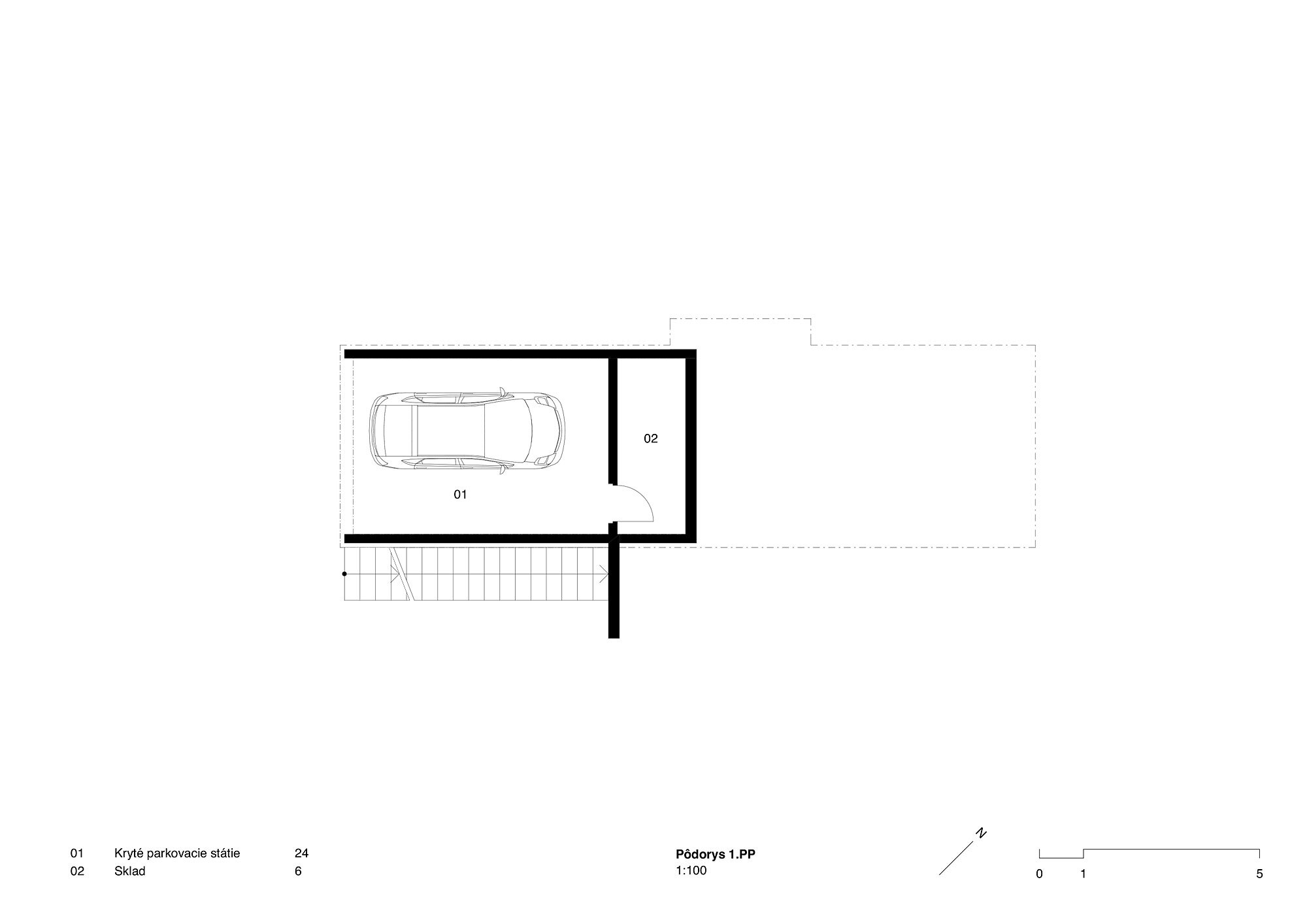 Dispozíciu vertikálne členíme na tri podlažia. Na prvom podzemnom podlaží, prístupnom z ulice, bude provizórnou stenovou konštrukciou z betónových tvárnic vybudované kryté parkovacie miesto pre automobil a nevykurovaný sklad - pivnicu. Na prvé nadzemné podlažie vedie jednoramenné schodisko priamo k vstupným dverám do domu, resp. pozvoľne stúpajúca rampa do záhrady, na druhej strane domu. Do objektu sa vstupuje z južnej strany. Minimálne zádverie nás zavedie priamo do centra dennej časti. Na západnej strane, smerom do ulice je jedna spálňa, naopak smerom do záhrady sa v rytme radia miestnosti dennej časti. Schody domu vedú do malej pracovne na druhom nadzemnom podlaží. Z nej sú napojené ostatné dve spálne.