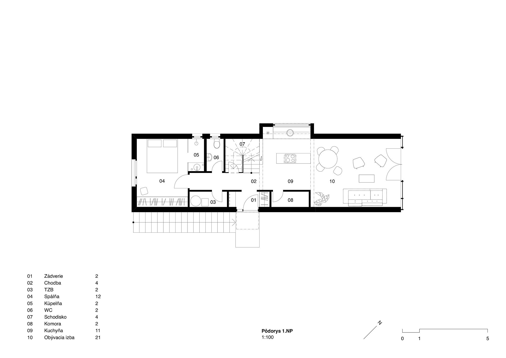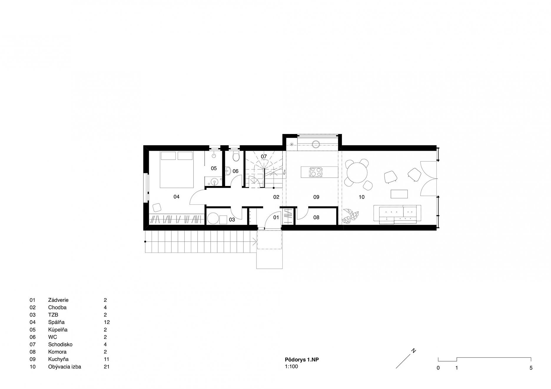 Všetky obytné miestnosti zaberajú celú šírku dispozície domu, ktorá je iba 4 m. Tento rozmer kompenzujeme dlhými priehľadmi po celej dĺžke domu a zvýšenou výškou podlaží v niektorých častiach.