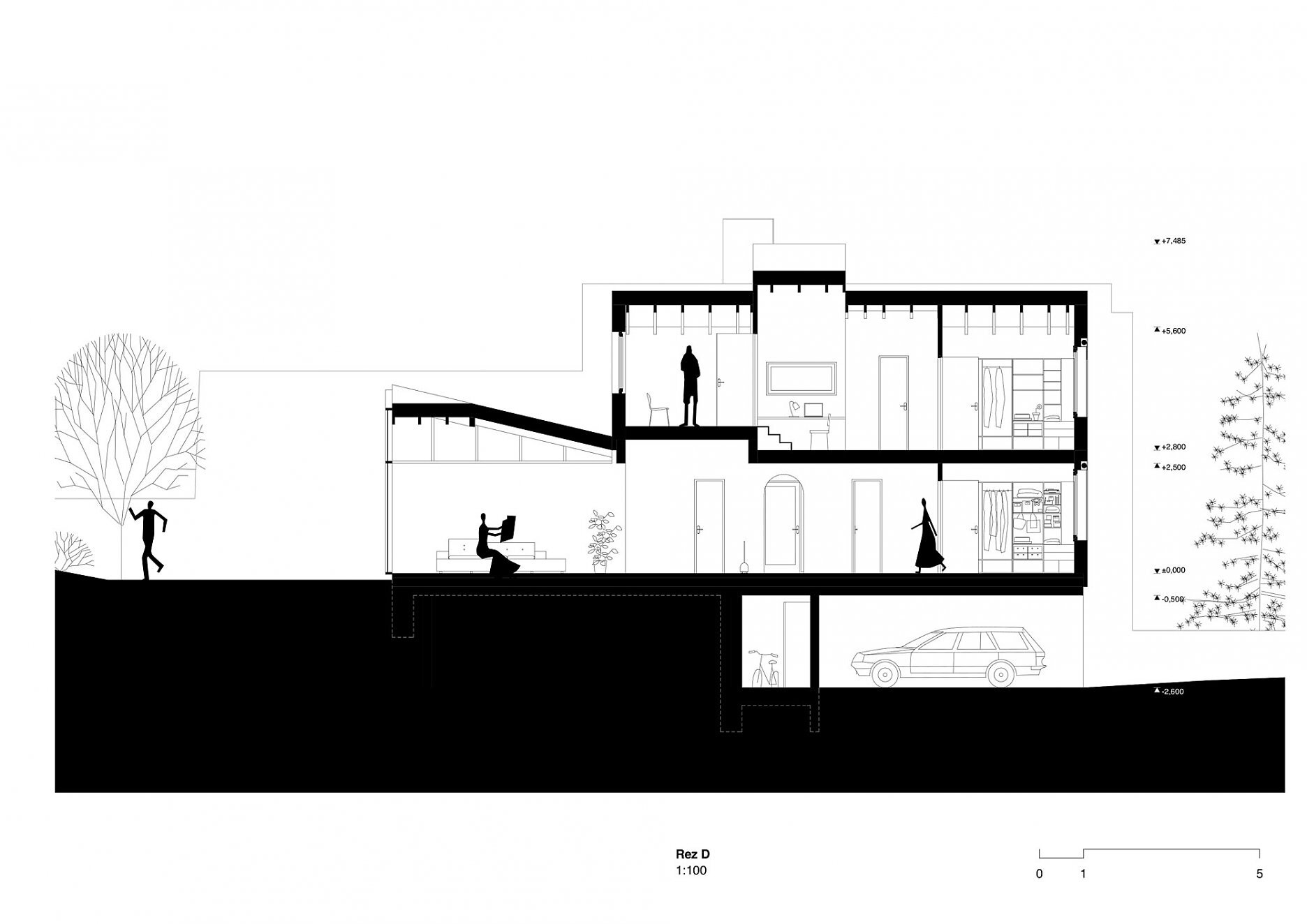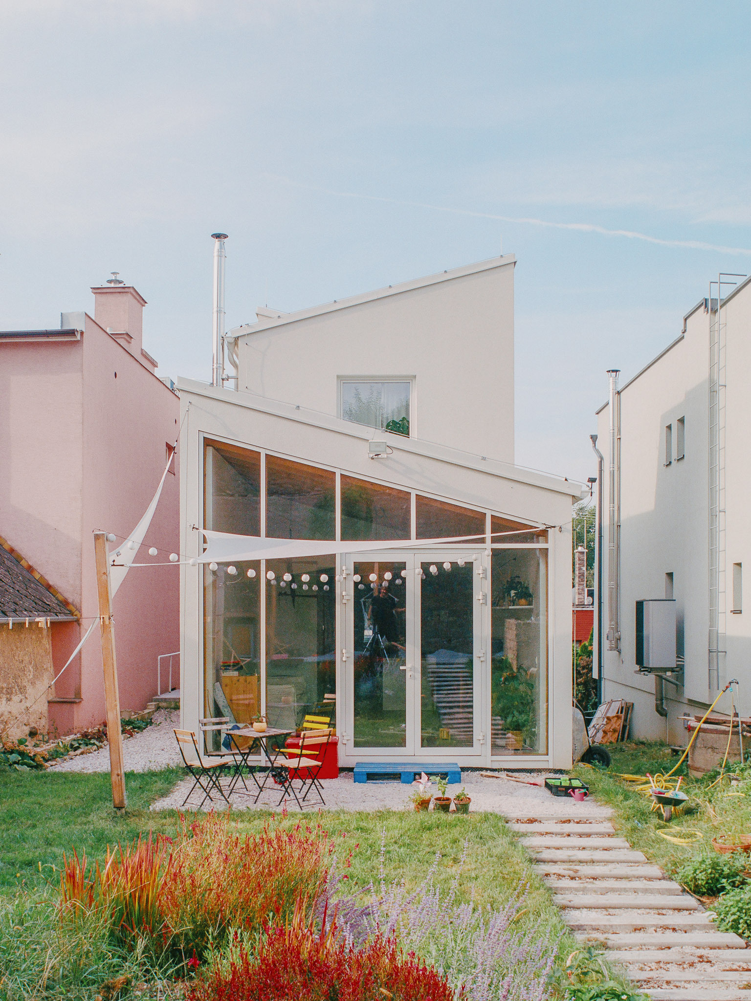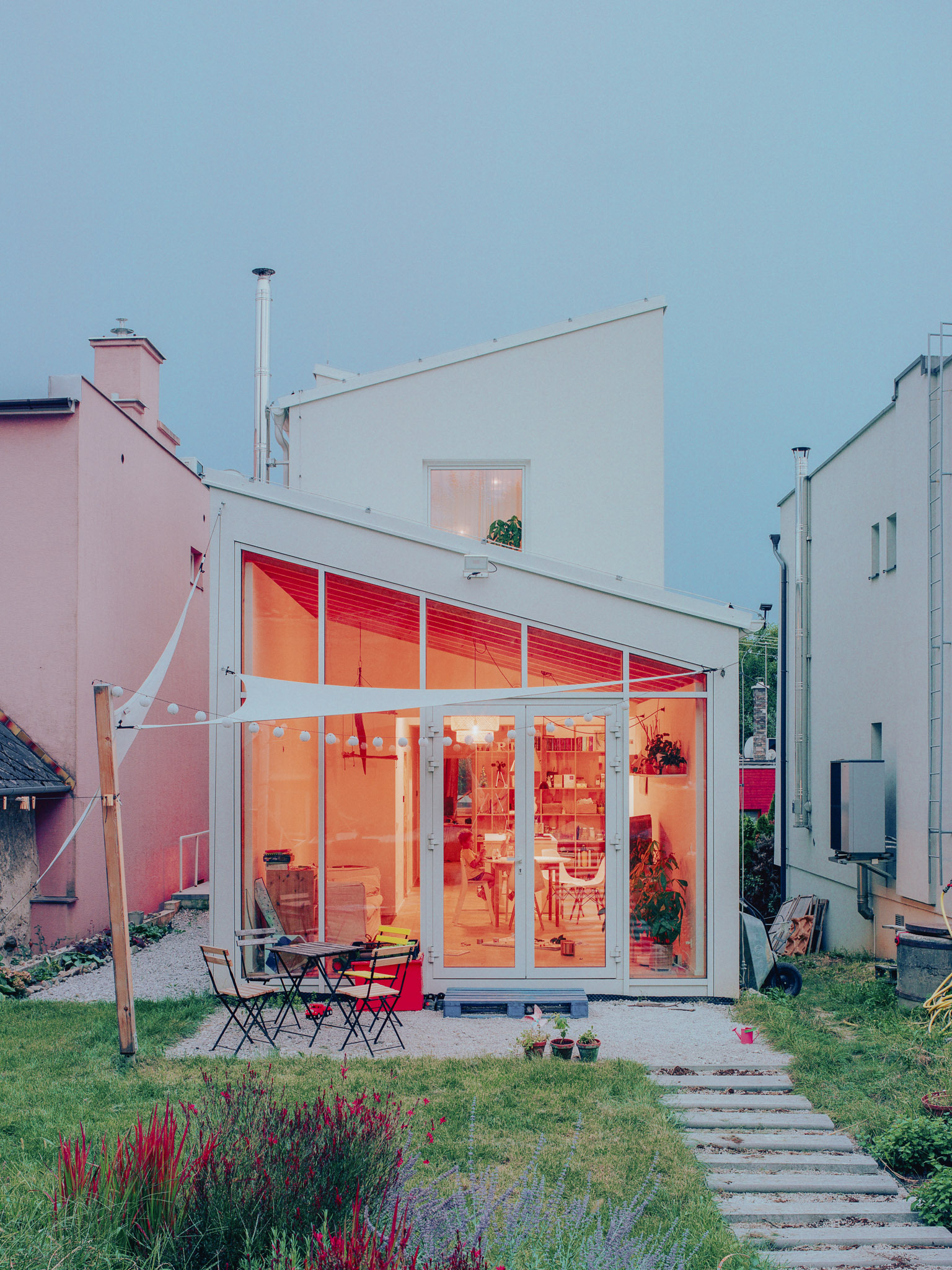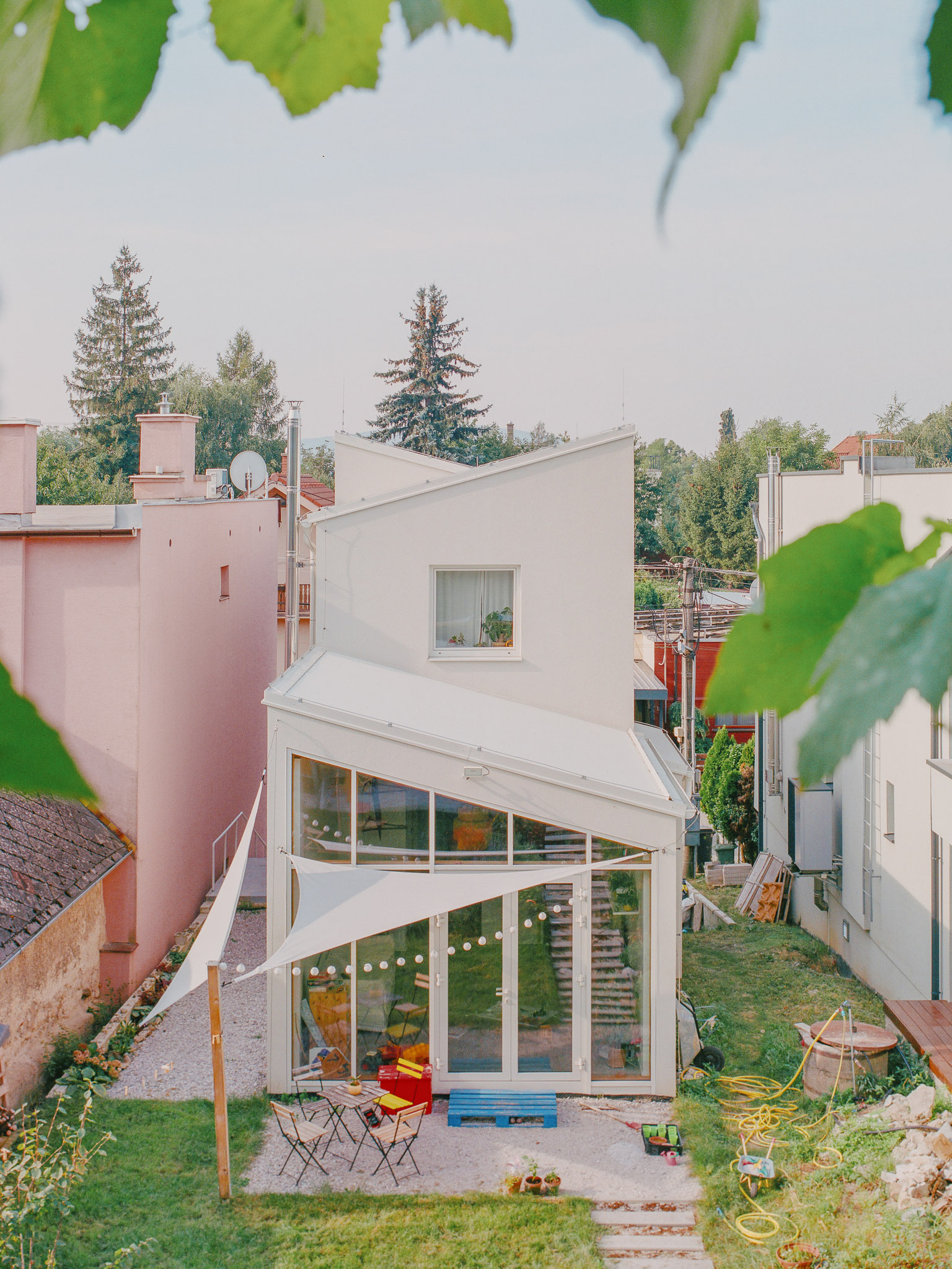 Dom na úzkej parcele vystupuje z tieňa mohutných susedných objektov a otvára sa smerom do stúpajúcej záhrady.