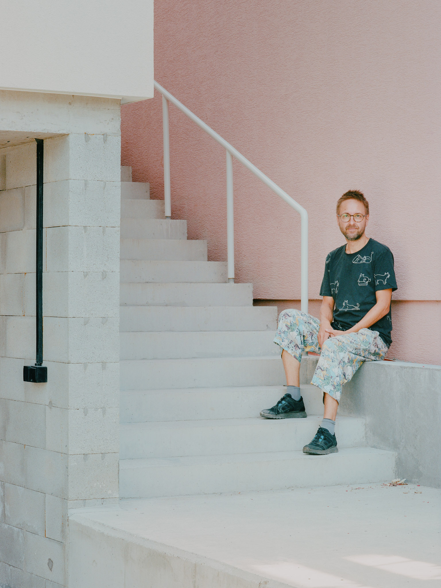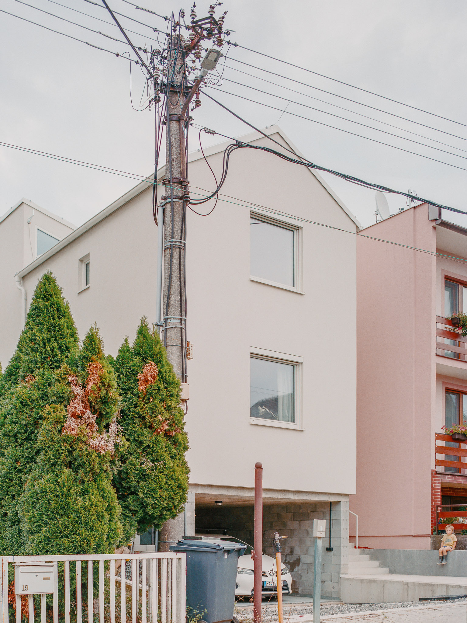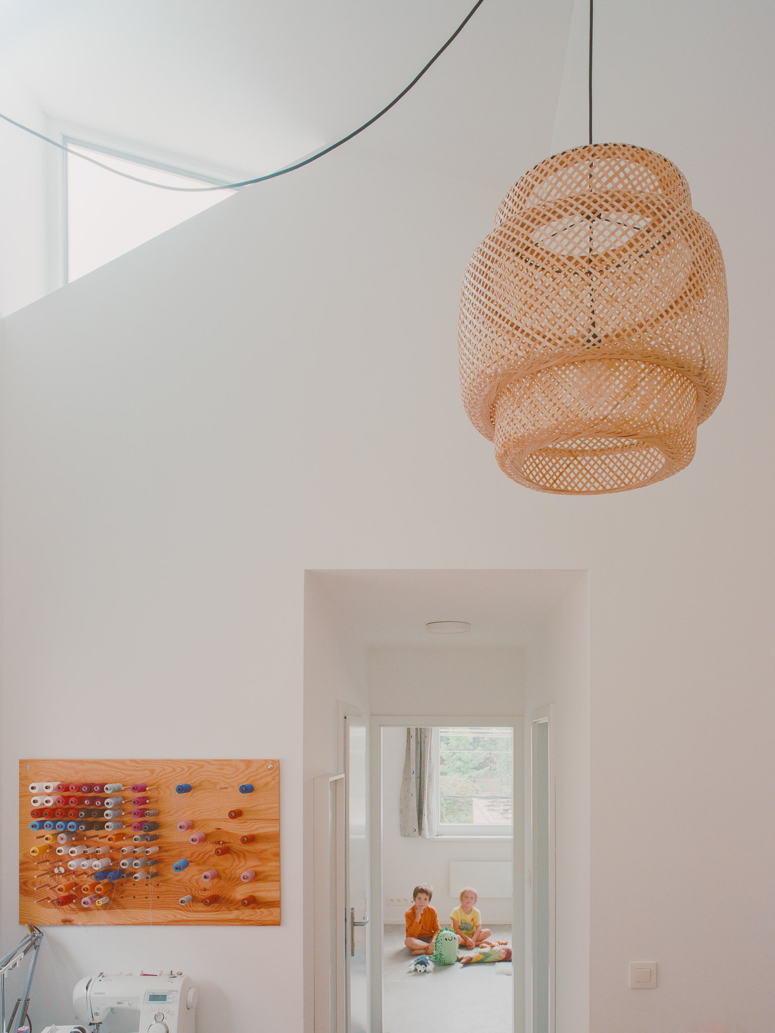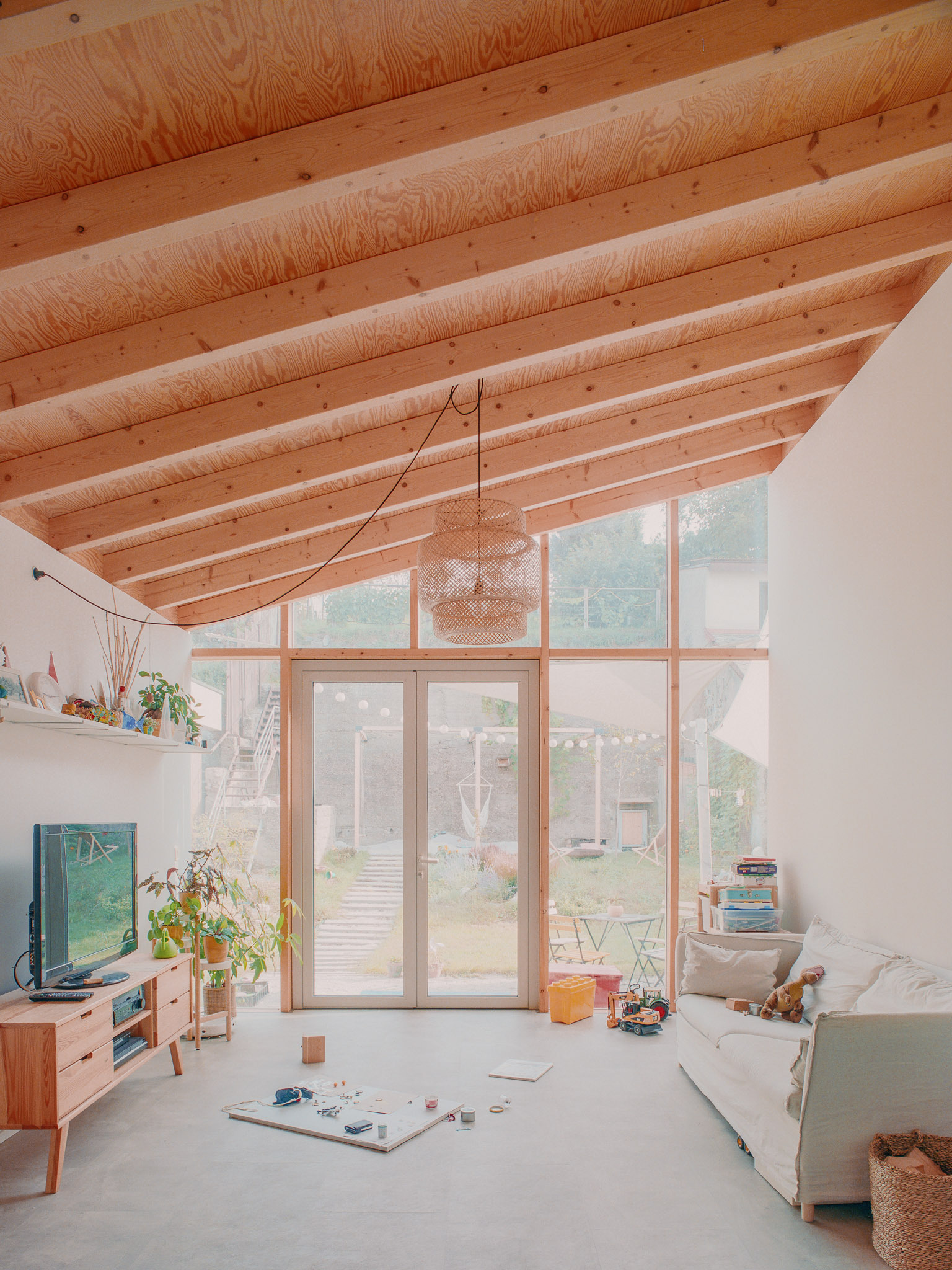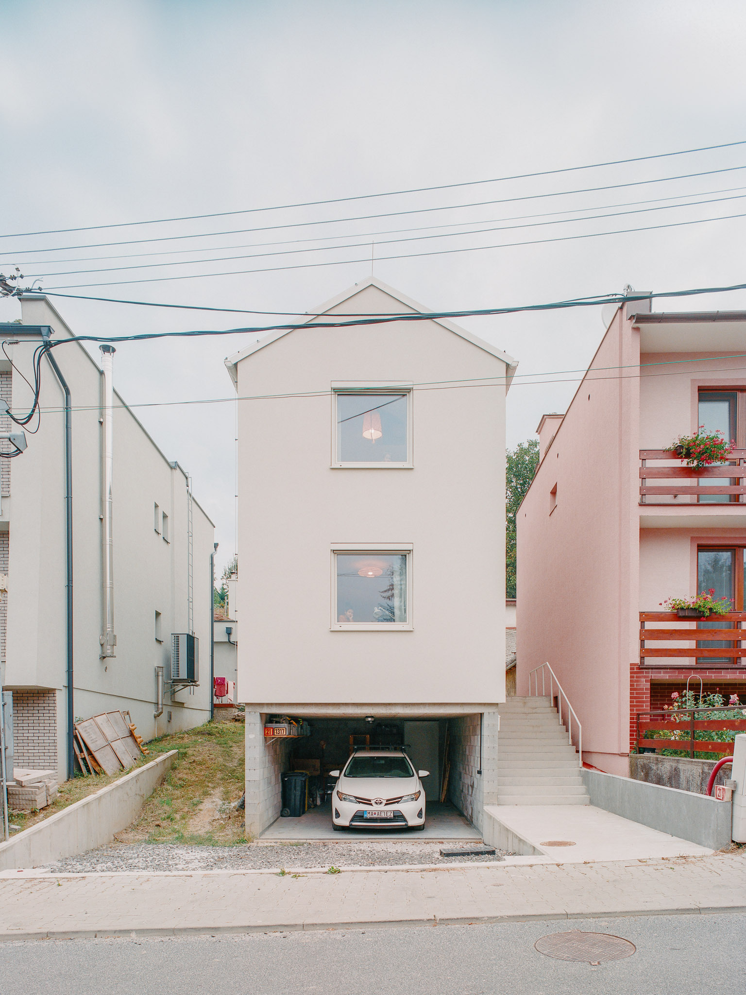 Logicky koncipovanú priestorovú schému uzatvára celopresklená stena obývačky, ktorá prepája pôdorysne skromnú plochu s exteriérom. "Ušká mačky" na úrovni strešnej roviny vedú do hĺbky dispozície juhozápadné svetlo a čiastočne suplujú minimálne okenné otvory smerujúce k susedom. Architekt príkladne pracuje s limitmi prostredia a vytvára pri zachovaní súkromia voľný priestor pre život mladej rodiny. Spodné podlažie domu je koncipované ako “hrubá stavba”. Slúži ako kryté miesto pre auto a skladík. V budúcnosti je možné tento priestor od ulice uzavrieť.