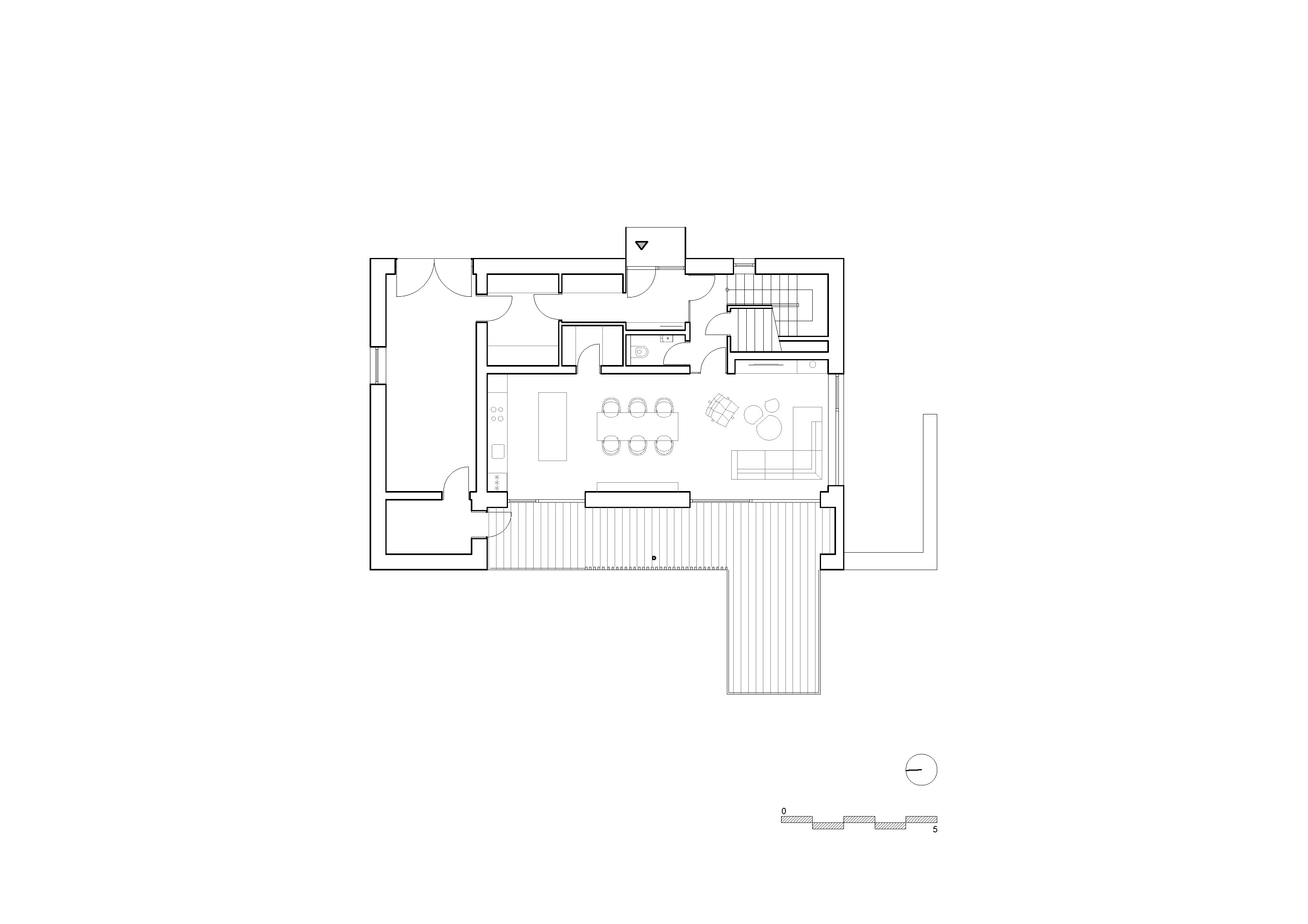 V západnej časti rozširuje dom veranda, inšpirovaná riešením historických chalúp. Pobytový priestor čiastočne kryje zvislé latovanie na úrovni fasády, ktoré vytvára rozhranie medzi interiérom a exteriérom. Z verandy vystupuje oceľová konštrukcia terasy, presahujúca ponad svah lúky. Protiklad k otvorenej fasáde s verandou tvorí kompaktná uličná fronta, ktorú akcentuje vstupný oceľový box, chrániaci obyvateľov pred nepriazňou počasia.