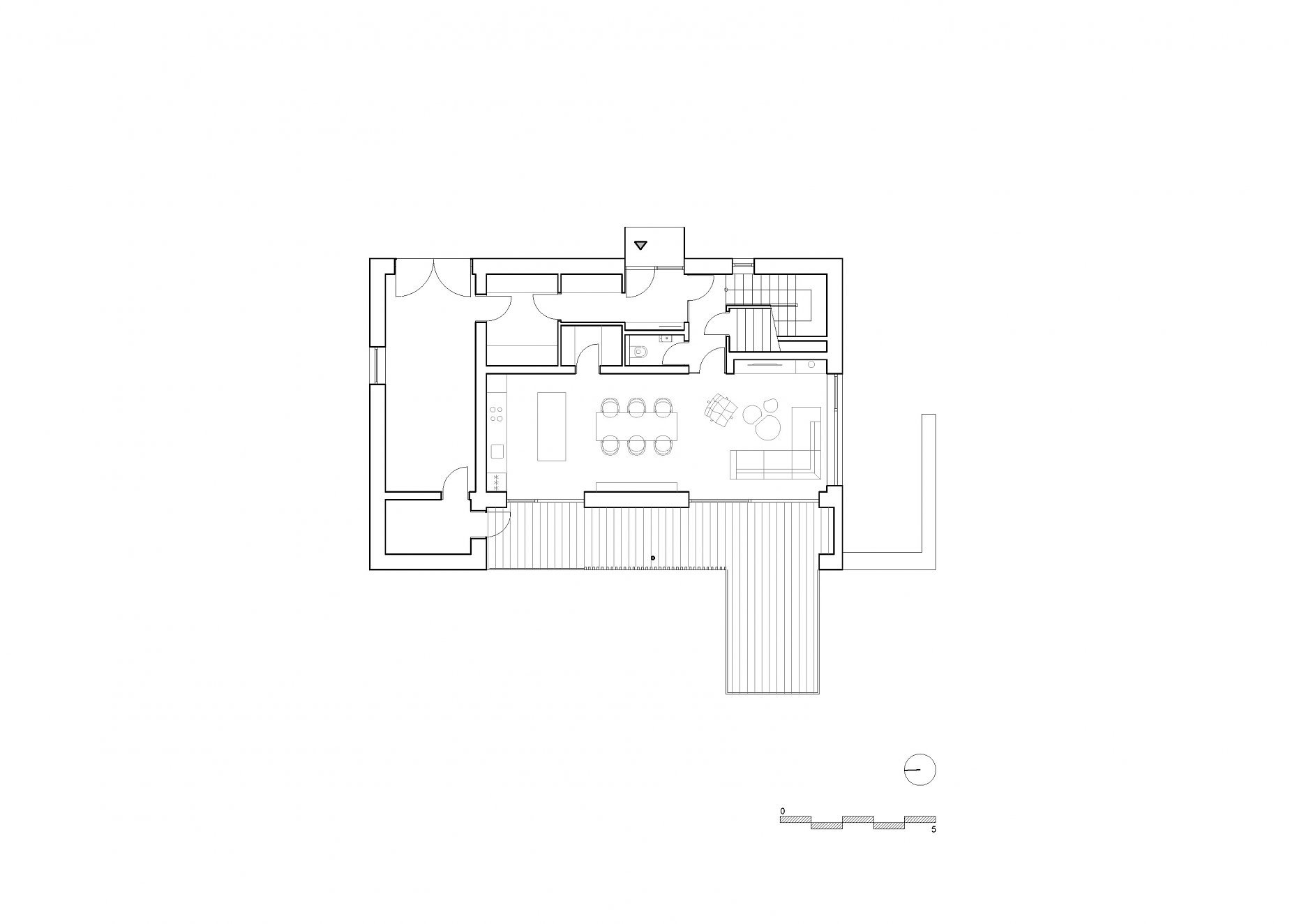 Cez vstupný box sa návštevník dostáva do zádveria a pokračuje do otvorenej dennej zóny. Z prízemia vedie schodisko do suterénu s domácim wellness a do nočnej časti v podkroví.