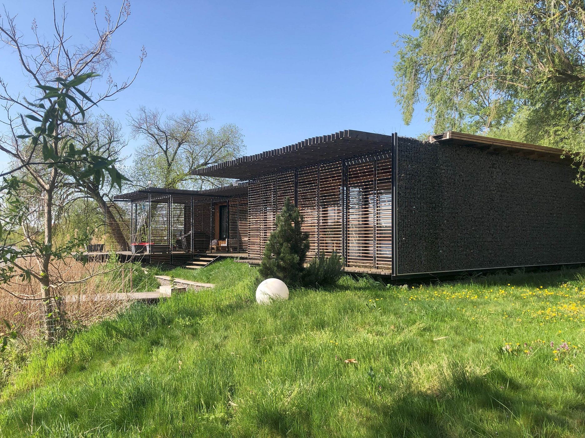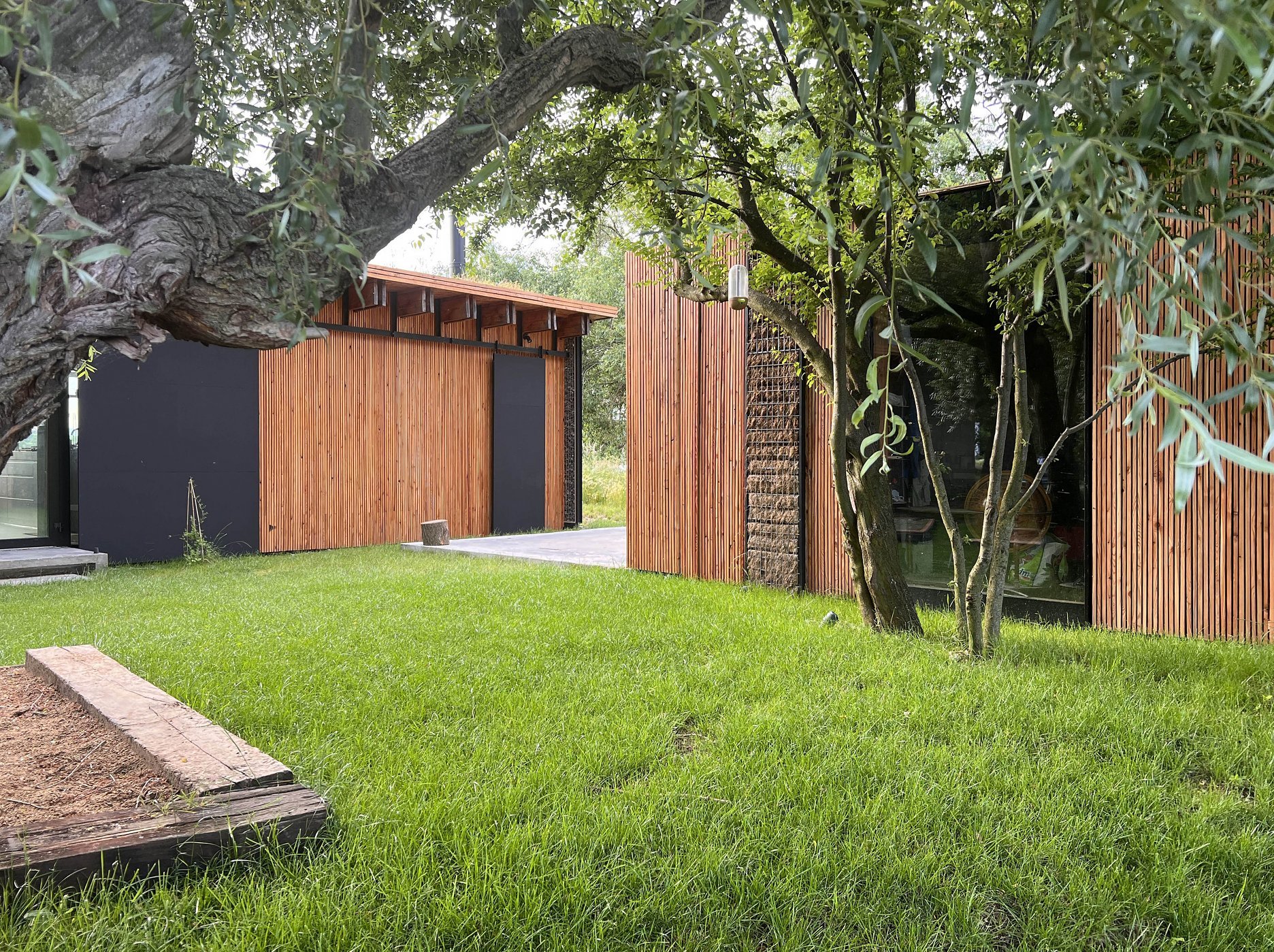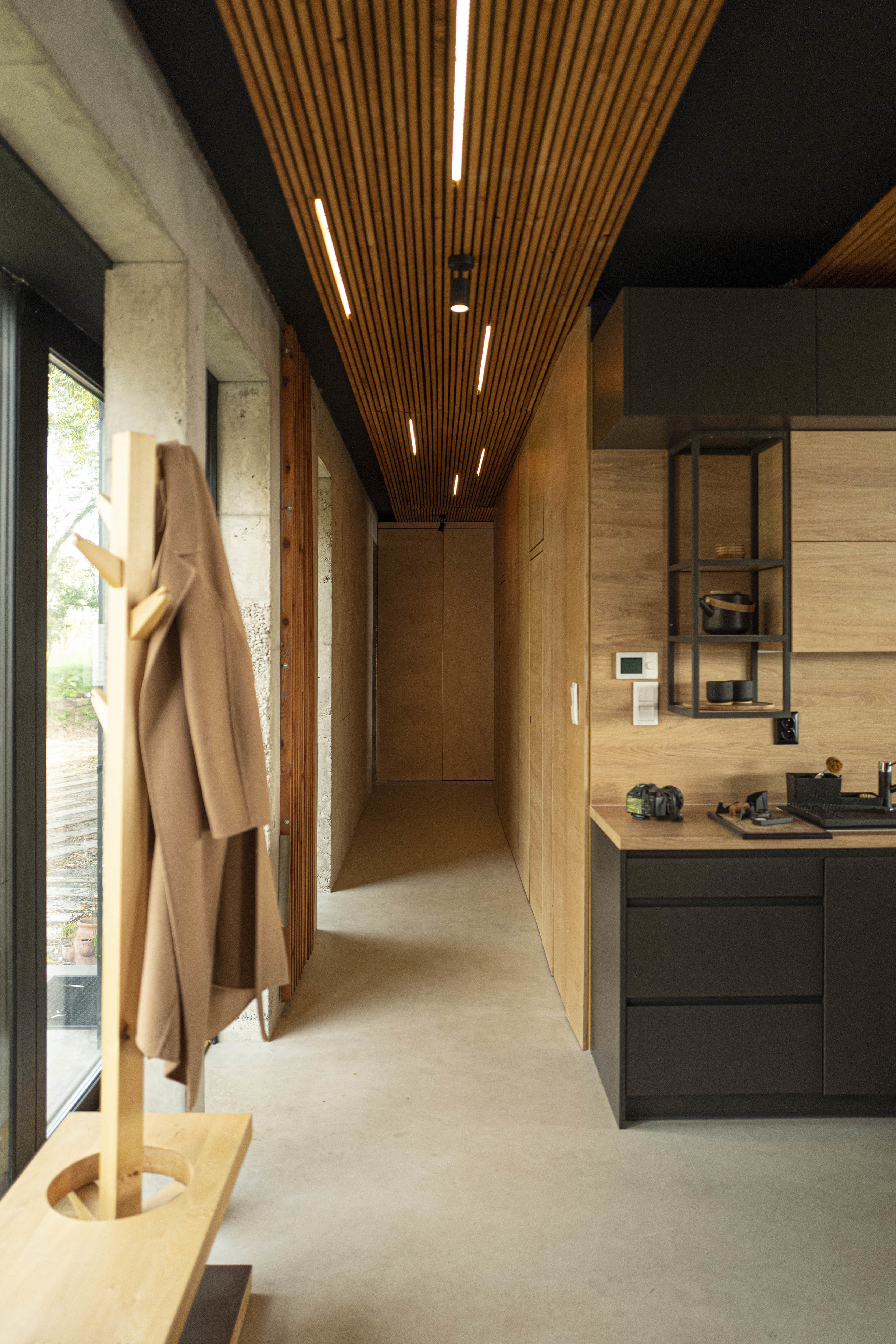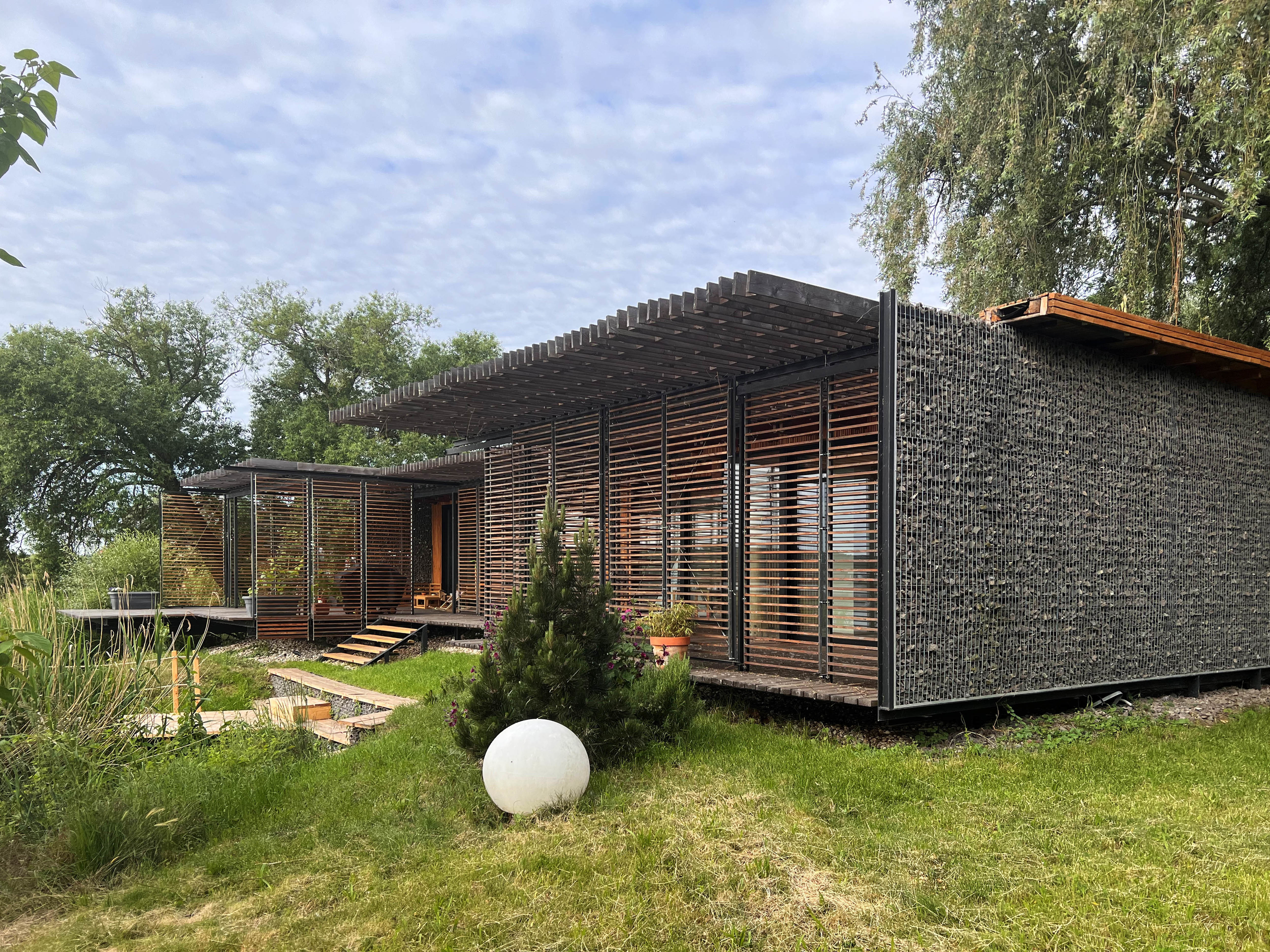 Drevená fasáda je orientovaná do súkromných častí, bočné pohľady charakterizujú gabiónové steny. V interiéri je priznaný pohľadový betón v kombinácii so svetlým drevom. Čierne stropy opticky zvyšujú priestor a spolu s ostatnými čiernymi prvkami dodávajú ráz interiéru. V nočnej časti prevláda biela farebnosť. K domu patrí aj malá stavba, slúžiaca ako garáž a dielňa. Materiálovo je riešená totožne ako hlavný objekt. Obe stavby spája aj použitie zelených striech.