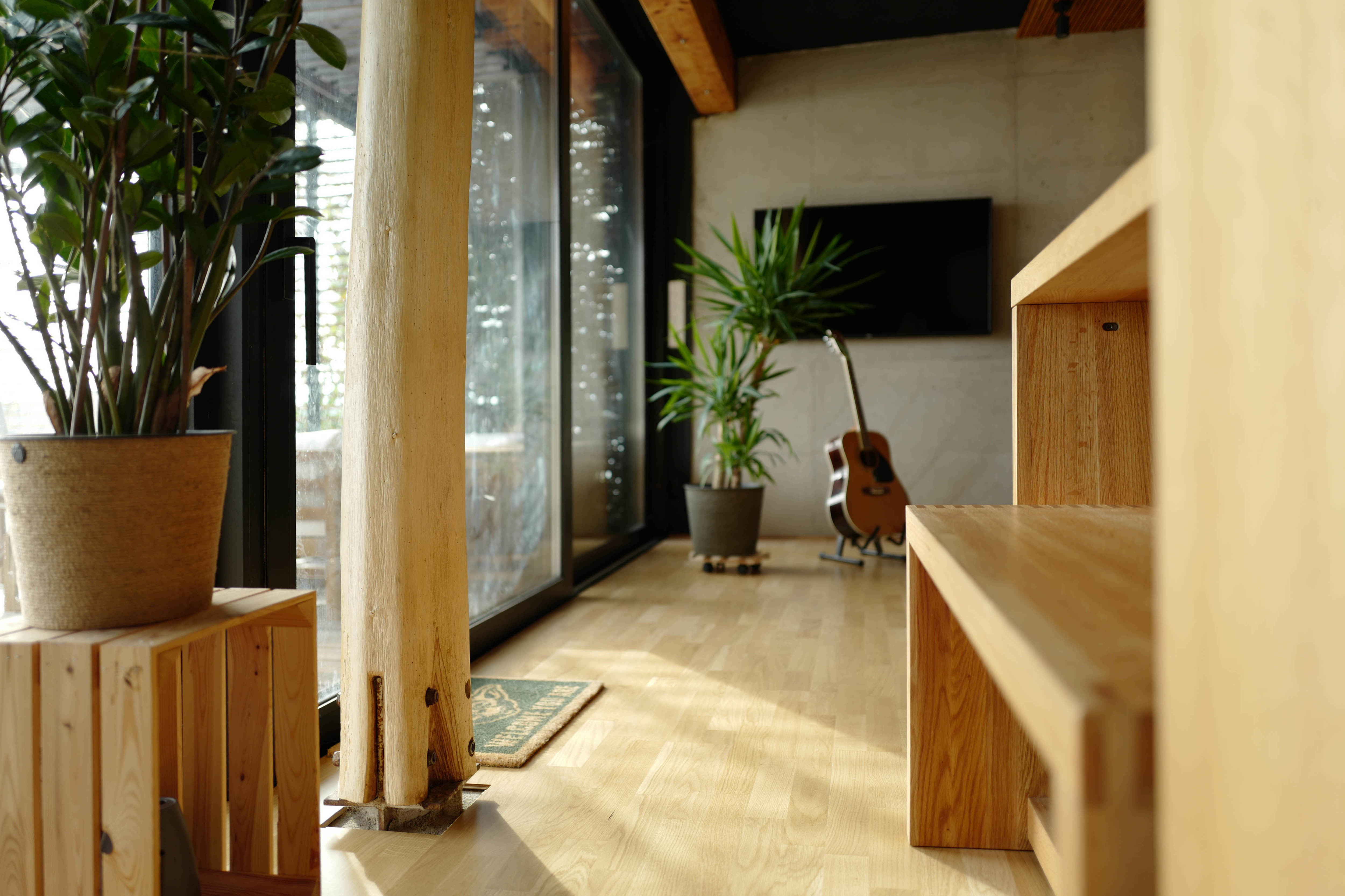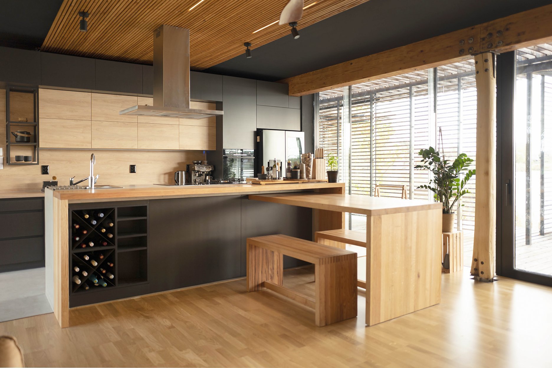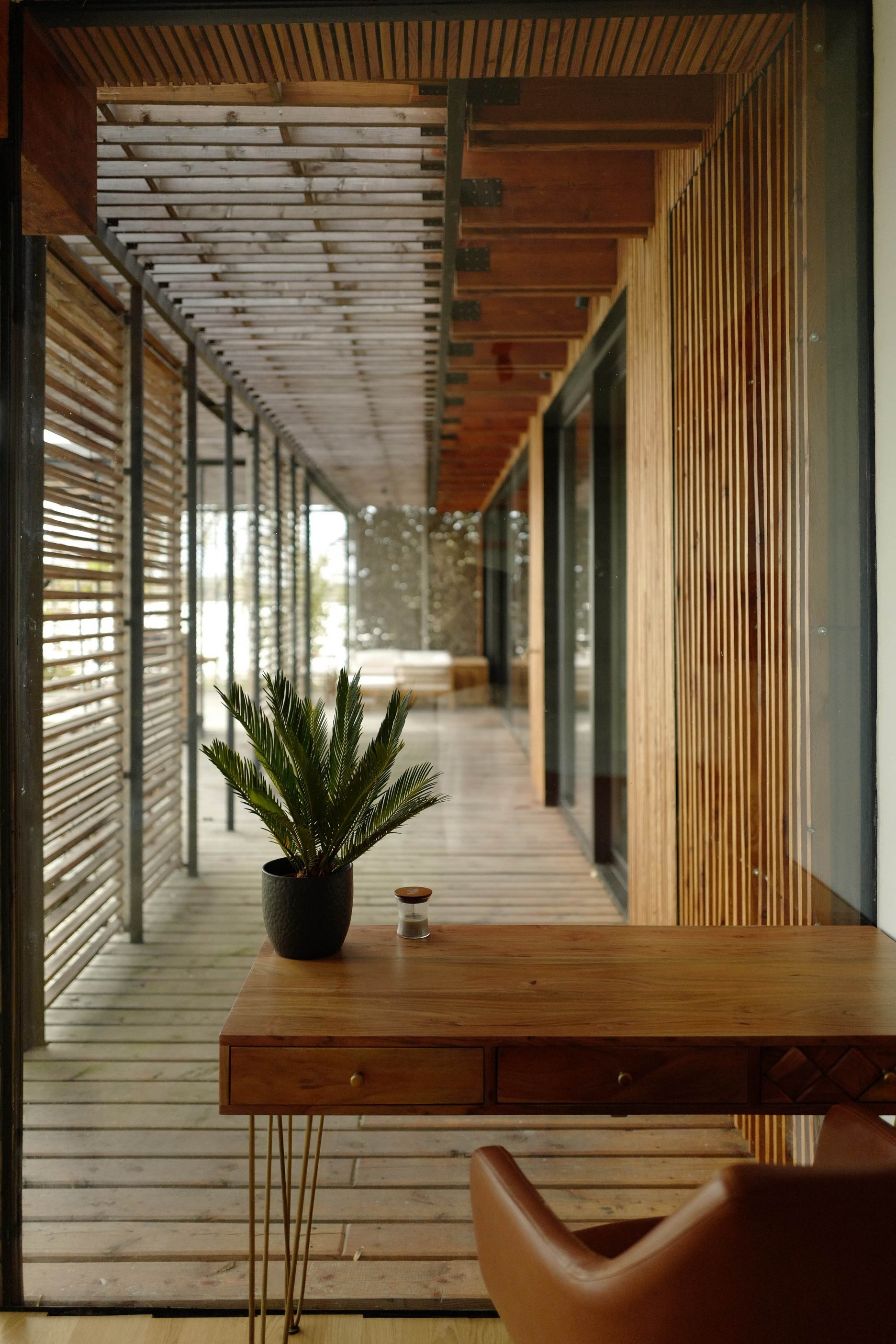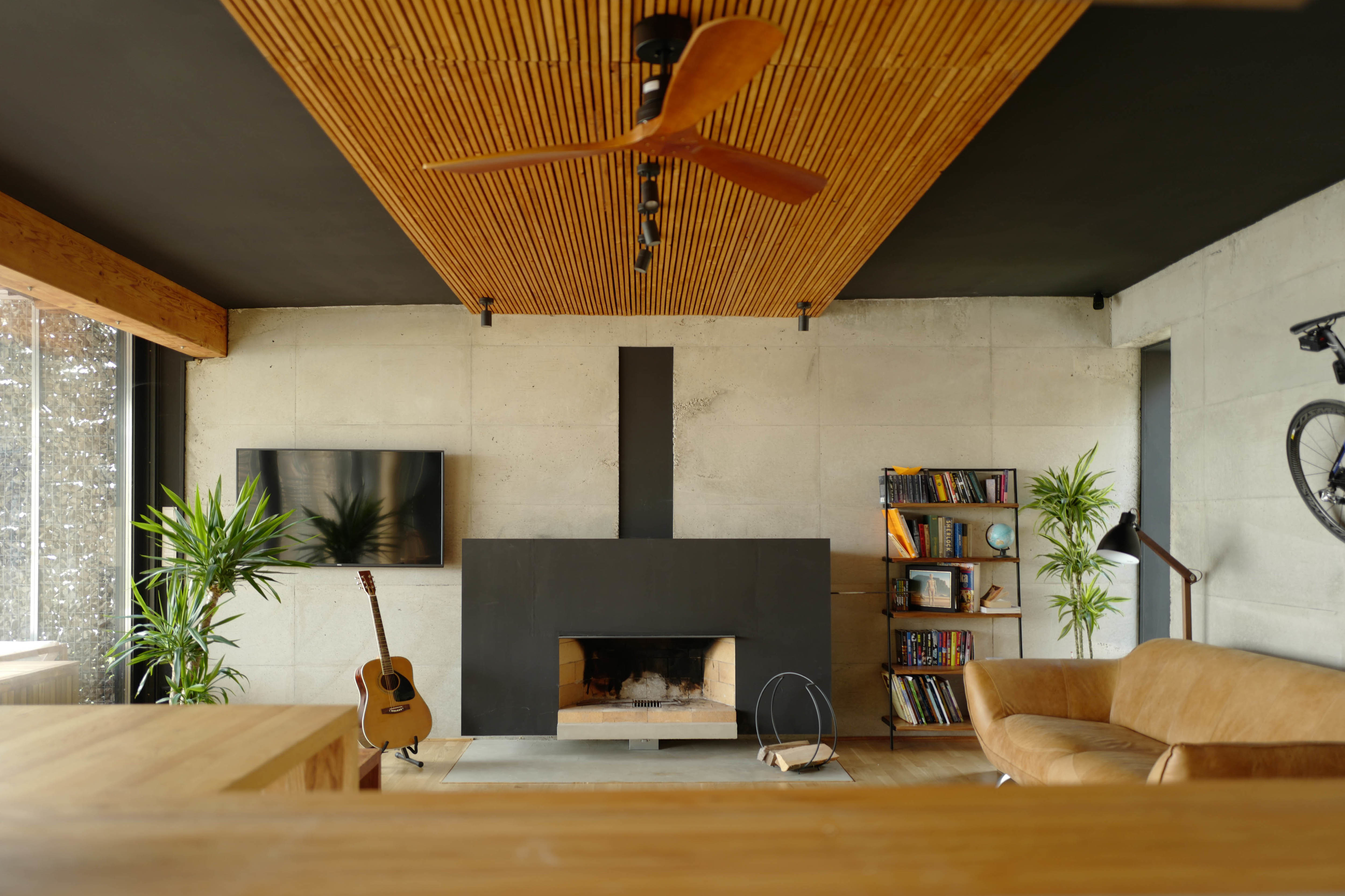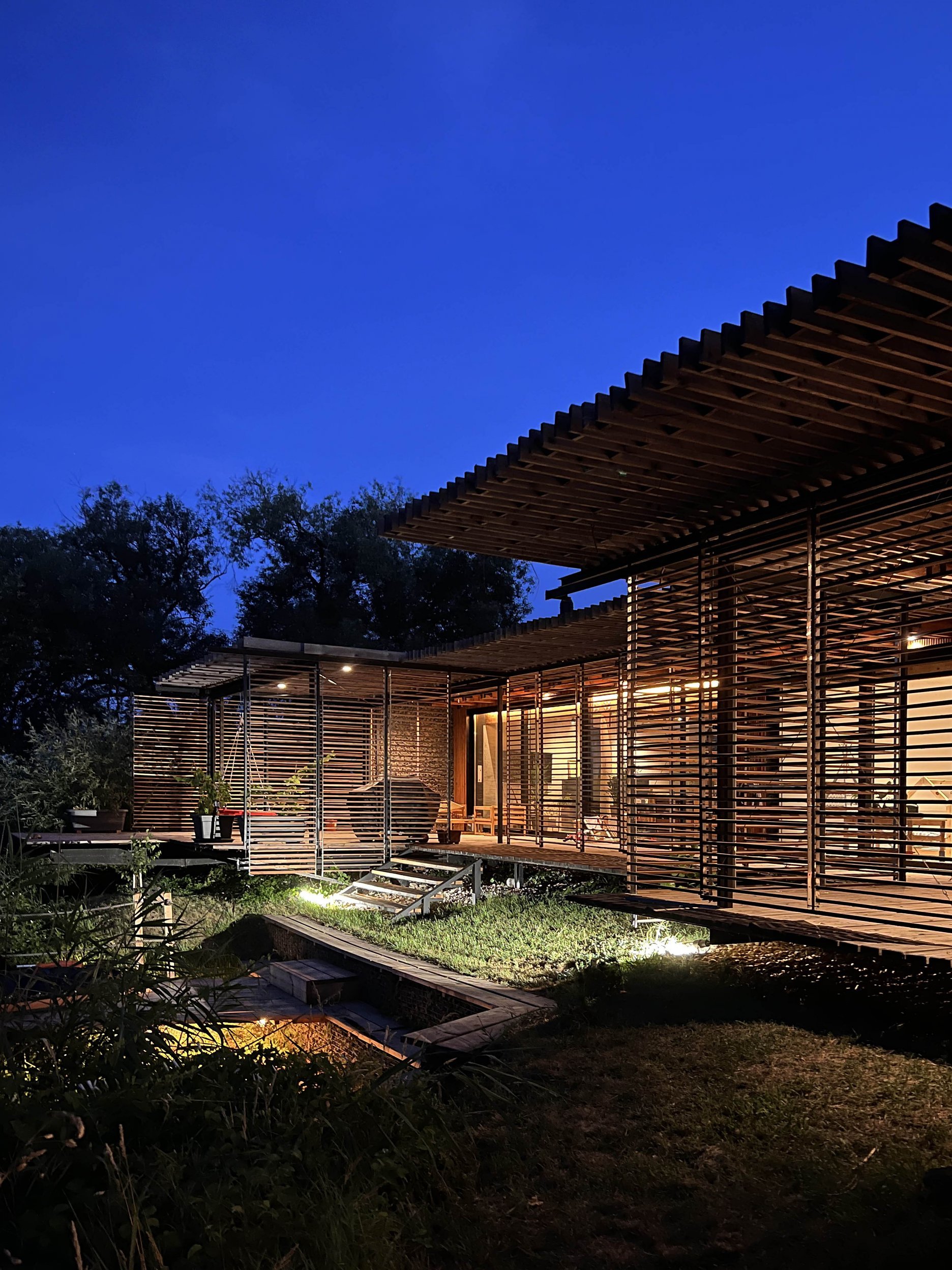 Drevená fasáda je orientovaná do súkromných častí, bočné pohľady charakterizujú gabiónové steny. V interiéri je priznaný pohľadový betón v kombinácii so svetlým drevom. Čierne stropy opticky zvyšujú priestor a spolu s ostatnými čiernymi prvkami dodávajú ráz interiéru. V nočnej časti prevláda biela farebnosť. K domu patrí aj malá stavba, slúžiaca ako garáž a dielňa. Materiálovo je riešená totožne ako hlavný objekt. Obe stavby spája aj použitie zelených striech.