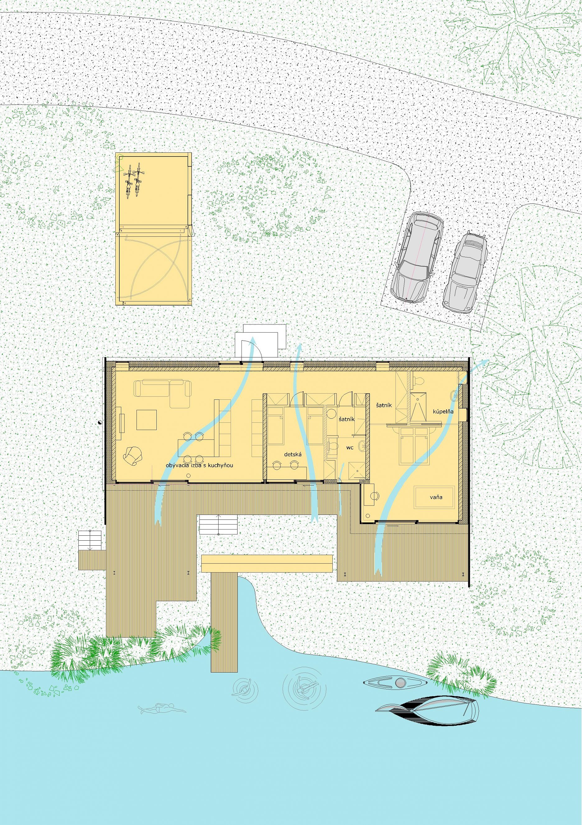 Rodinný dom je súčasťou zoskupenia troch domov pri jazere (I., II., III.), ktorých filozofia je vytvoriť spoločný priestor bez plotov a ohraničení. Cieľom bolo navrhnúť dom s pocitom súkromia, ktorý bude zároveň prepojený s jazerom. Myšlienka je podporená v hmote a v tvare. Všetky obytné miestnosti sú otočené k vode a majú výstup na terasy. Dom "ich vystiera" v tvare písmena "U" ponad hladinu a vo svojom strede umožňuje niekoľkými stupňami priamy prístup k vode. Terasy s posuvnými drevenými lamelami vytvárajú pre obyvateľov množstvo zákutí a možností ako tráviť čas v exteriéri.