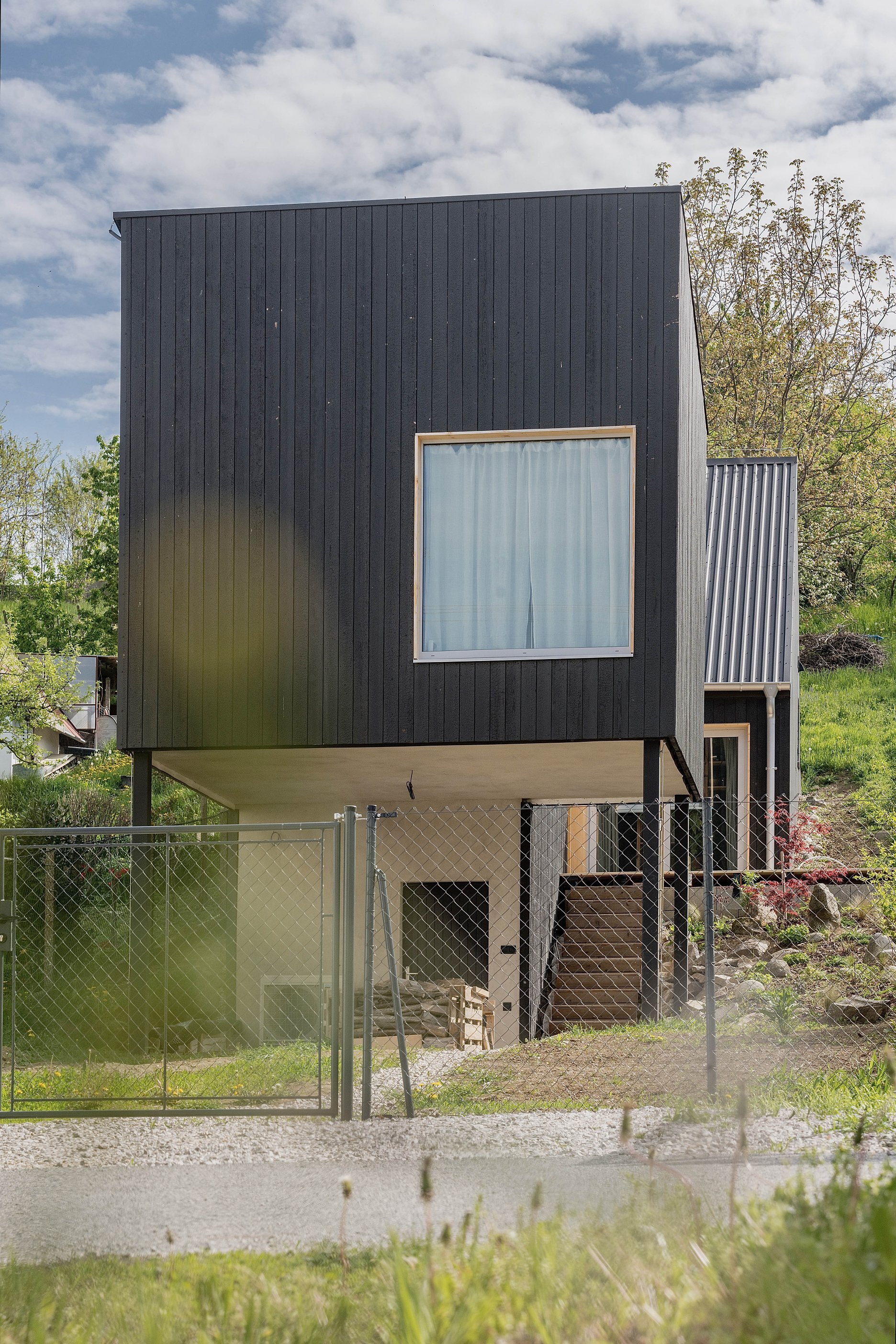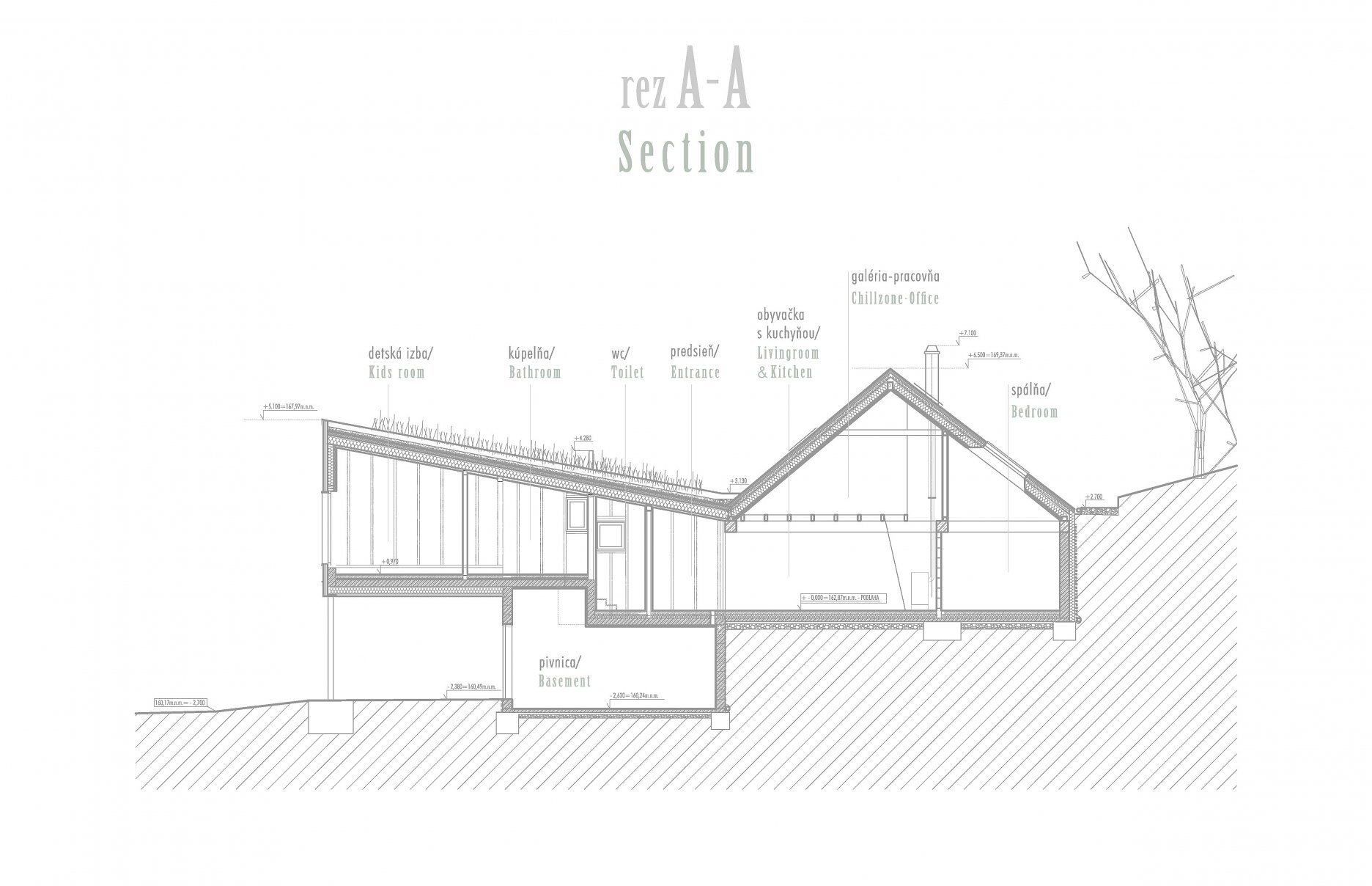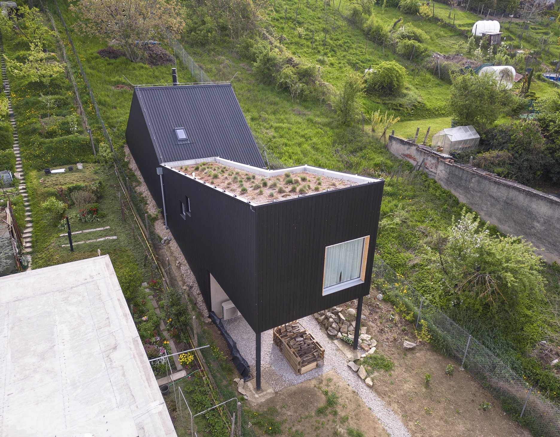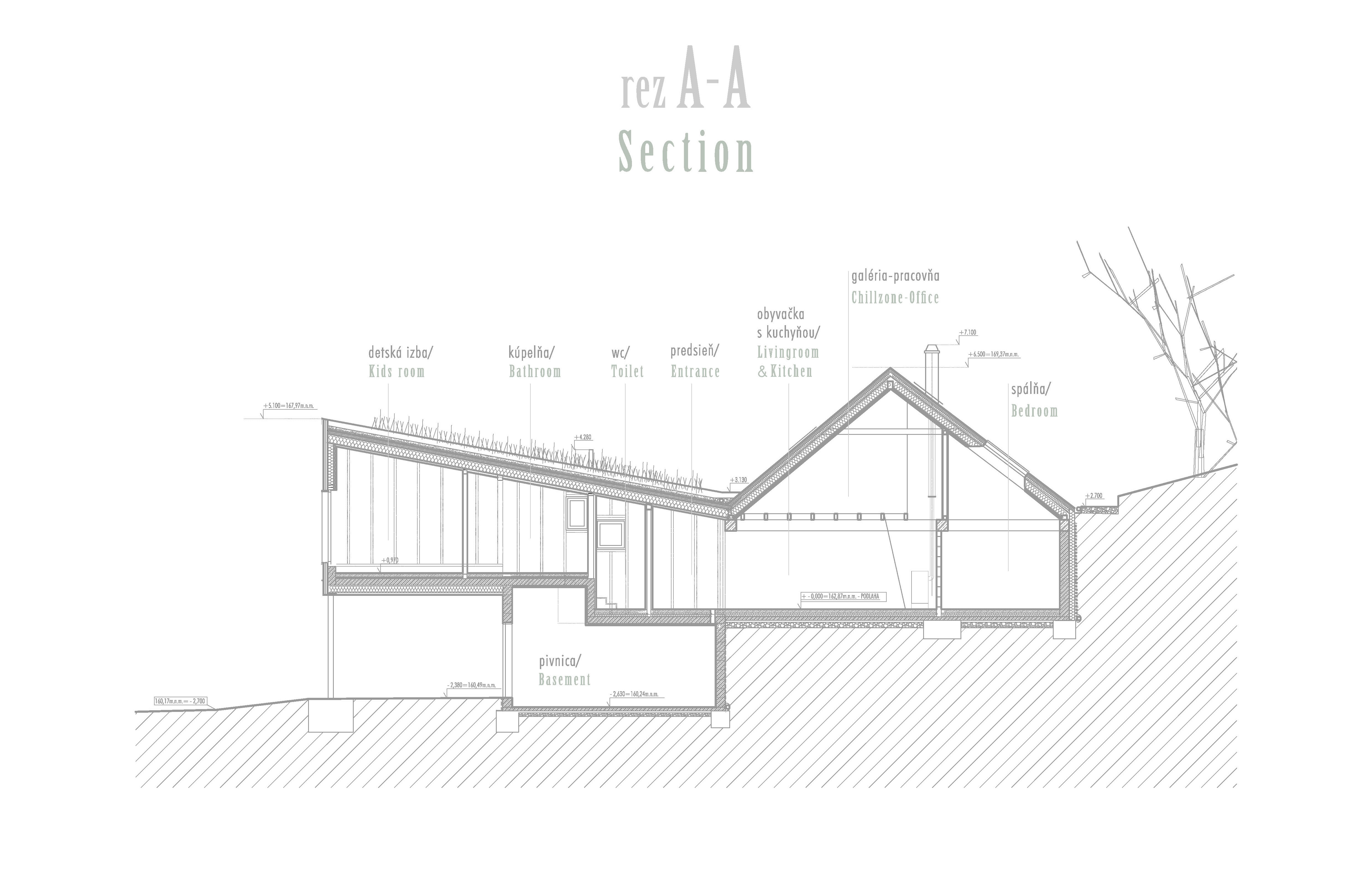 Aktuálna realizácia architektky Jany Konečnej prispôsobuje riešenie rodinného domu komplikovaným východiskovým podmienkam. Výsledný architektonický koncept charakterizuje zalomená strešná rovina, výšková hierarchizácia priestorov a vykonzolovaná hmota detskej izby.