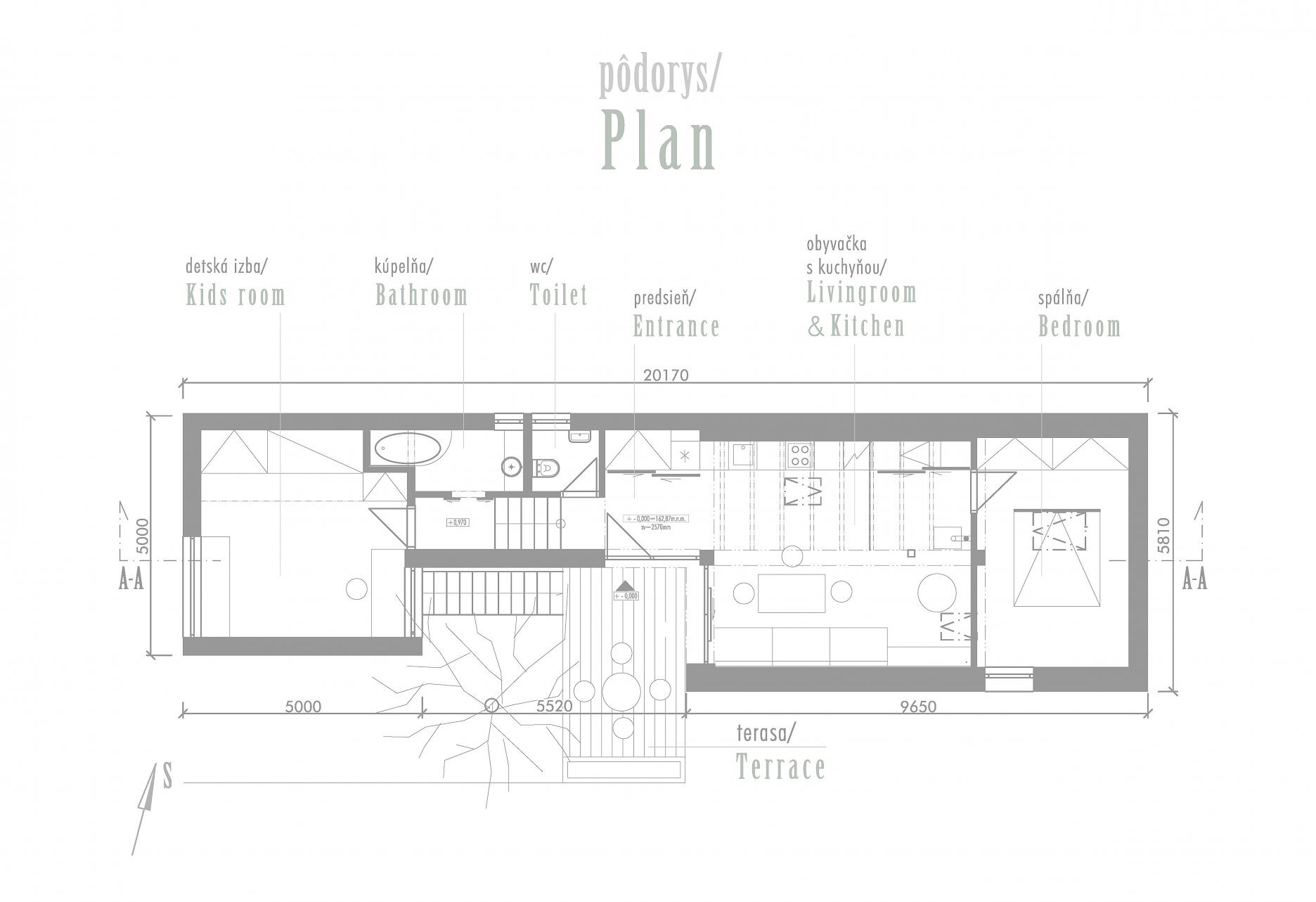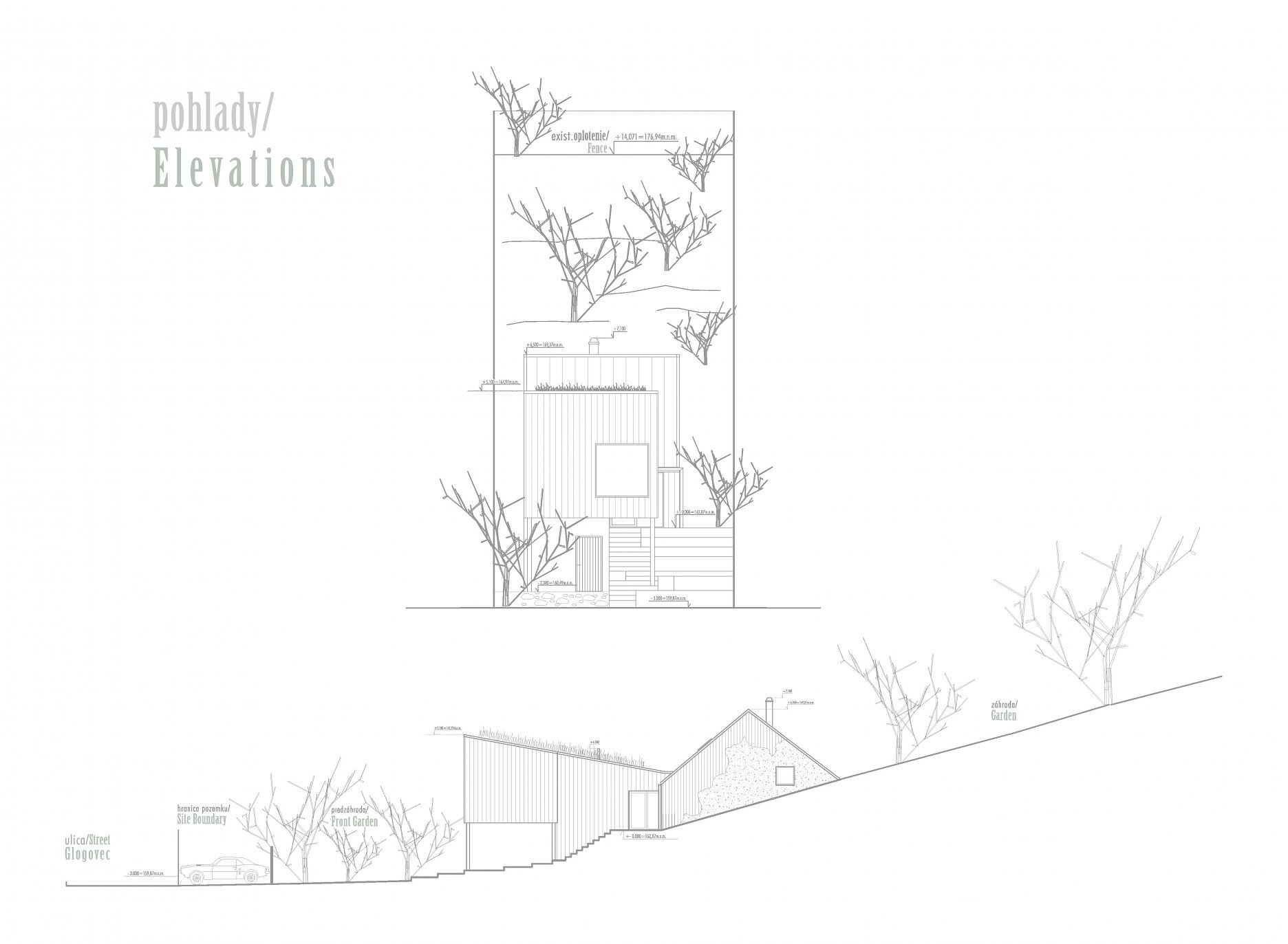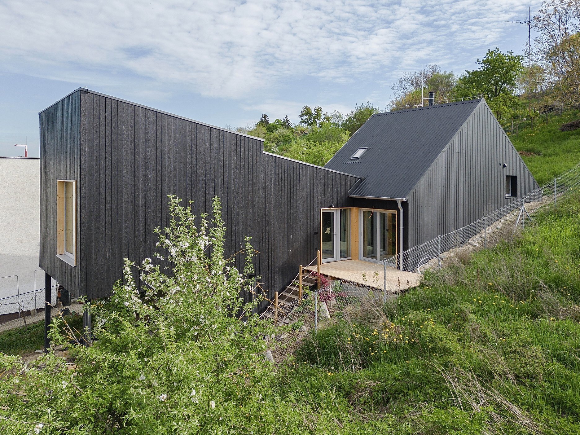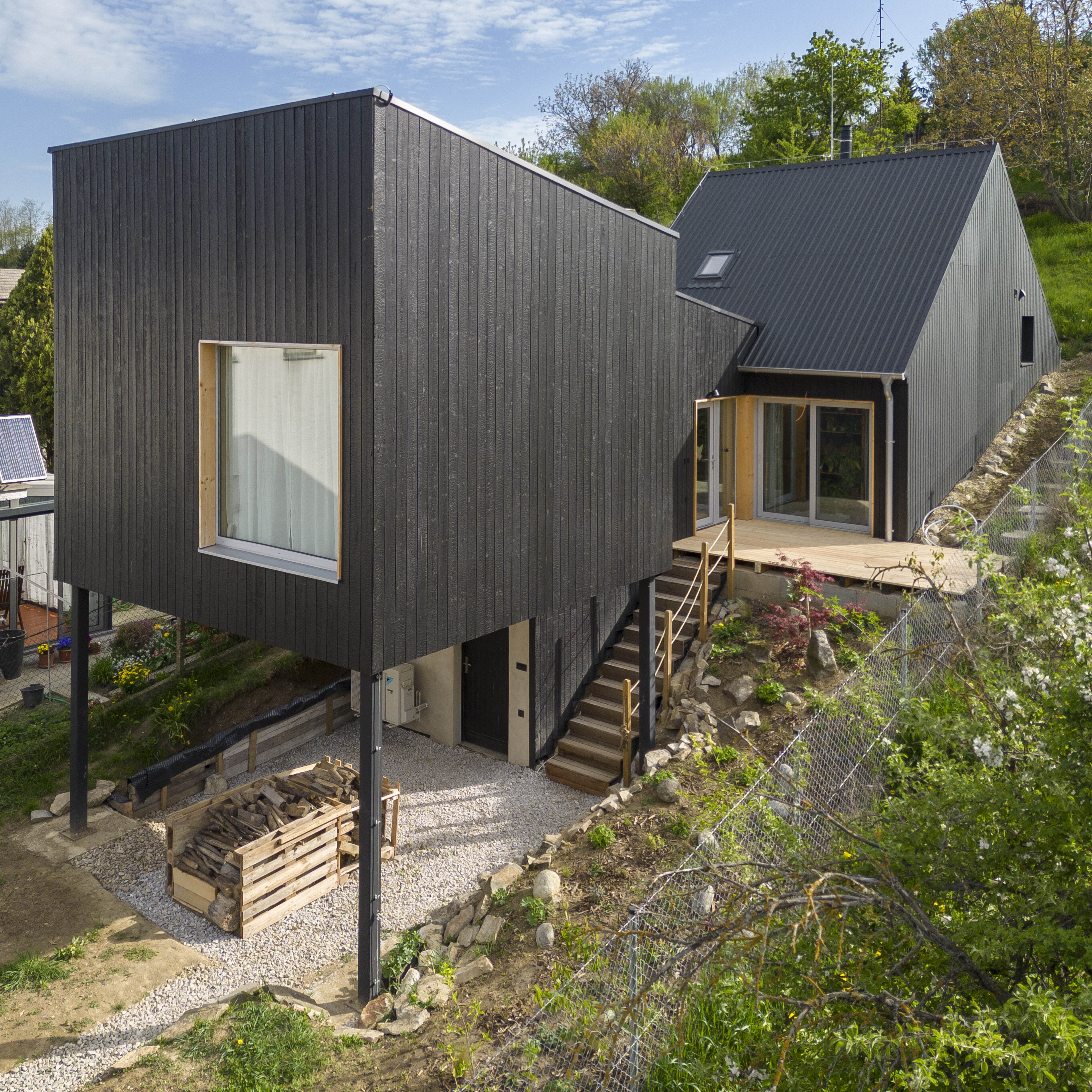 Aktuálna realizácia architektky Jany Konečnej prispôsobuje riešenie rodinného domu komplikovaným východiskovým podmienkam. Výsledný architektonický koncept charakterizuje zalomená strešná rovina, výšková hierarchizácia priestorov a vykonzolovaná hmota detskej izby.