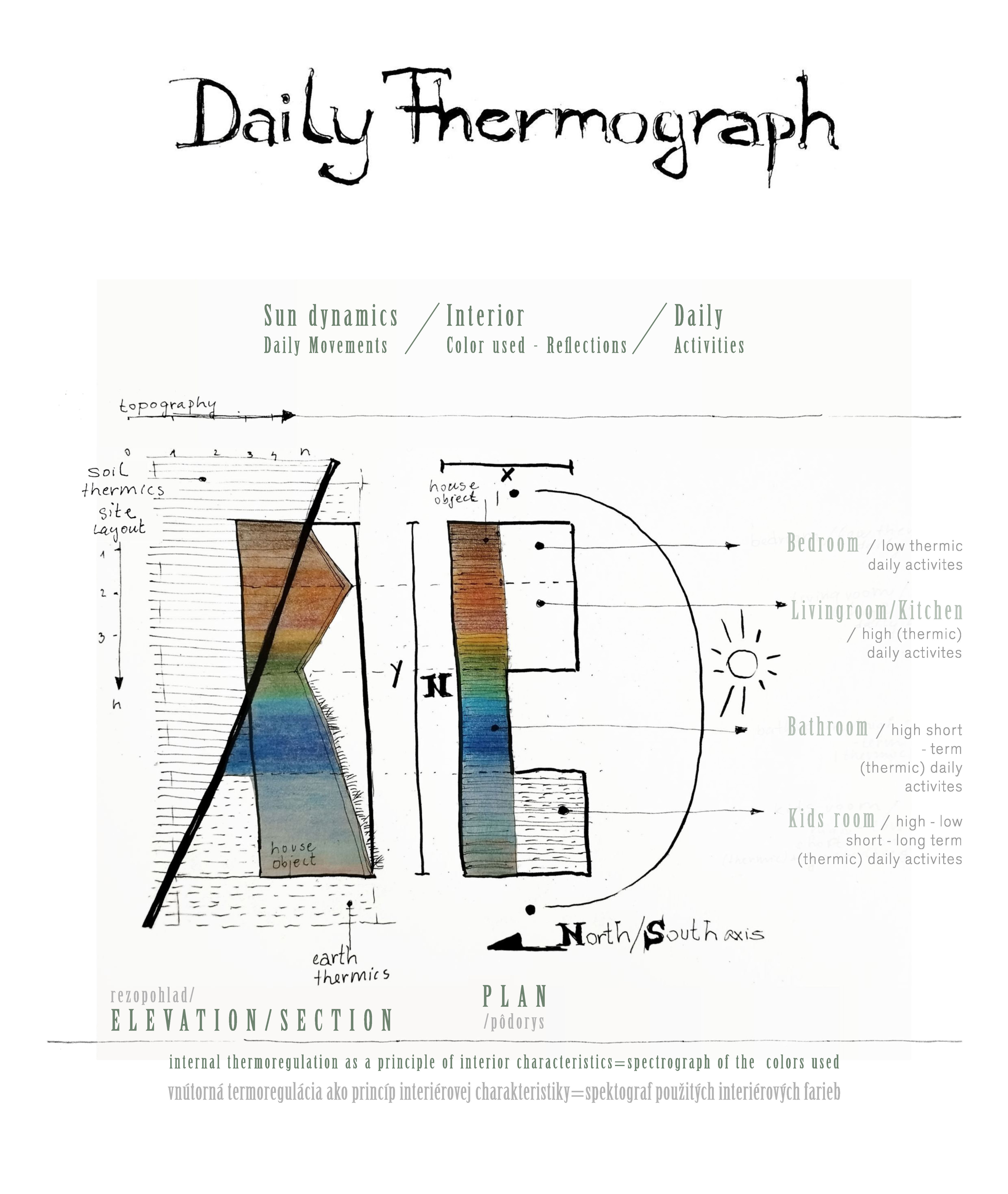 Dom na kopci ukazuje, ako môže architektúra citlivo vstúpiť do prírodného ekosystému. Demonštruje možnosti prepojenia človeka a krajiny prostredníctvom viacerých koncepčných prístupov. Koncept stojí na percepčných stratégiách, ako je rozšírenie vnímania o geografické súvislosti, sledovanie biorytmov prírody či zviditeľňovanie neviditeľných prírodných síl. Finálnu formu tak ovplyvnila environmentálna etika, prirodzená vnútorná termoregulácia, materialita stelesňujúca živly a urbánna stratégia založená na zachovaní prirodzenosti ekosystému a podpore jeho budúcej adaptácie.