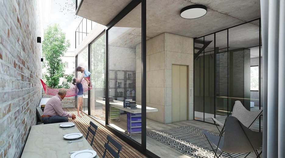 Do domu vstúpime do otvorenej haly. Ponad nástupný priestor sa vinie jednoramenné schodisko s priehľadom cez galériu až do horných podlaží. Masívny objem domu ostáva ponechaný, čistíme ho na podstatu muriva, ktoré nechávame vyznieť v jeho prirodzenej štruktúre. Pôvodné okná sú v parteri stiahnuté na francúzske. Blízkosť stromov vytvára na oboch uliciach dobrú mierku a čiastočné odblokovanie od ruchu dopravy. Radi by sme raster stromov potiahli pred obe fasády domu, vytvoria intímnejší nástup do domu v jeho už exponovanej polohe.