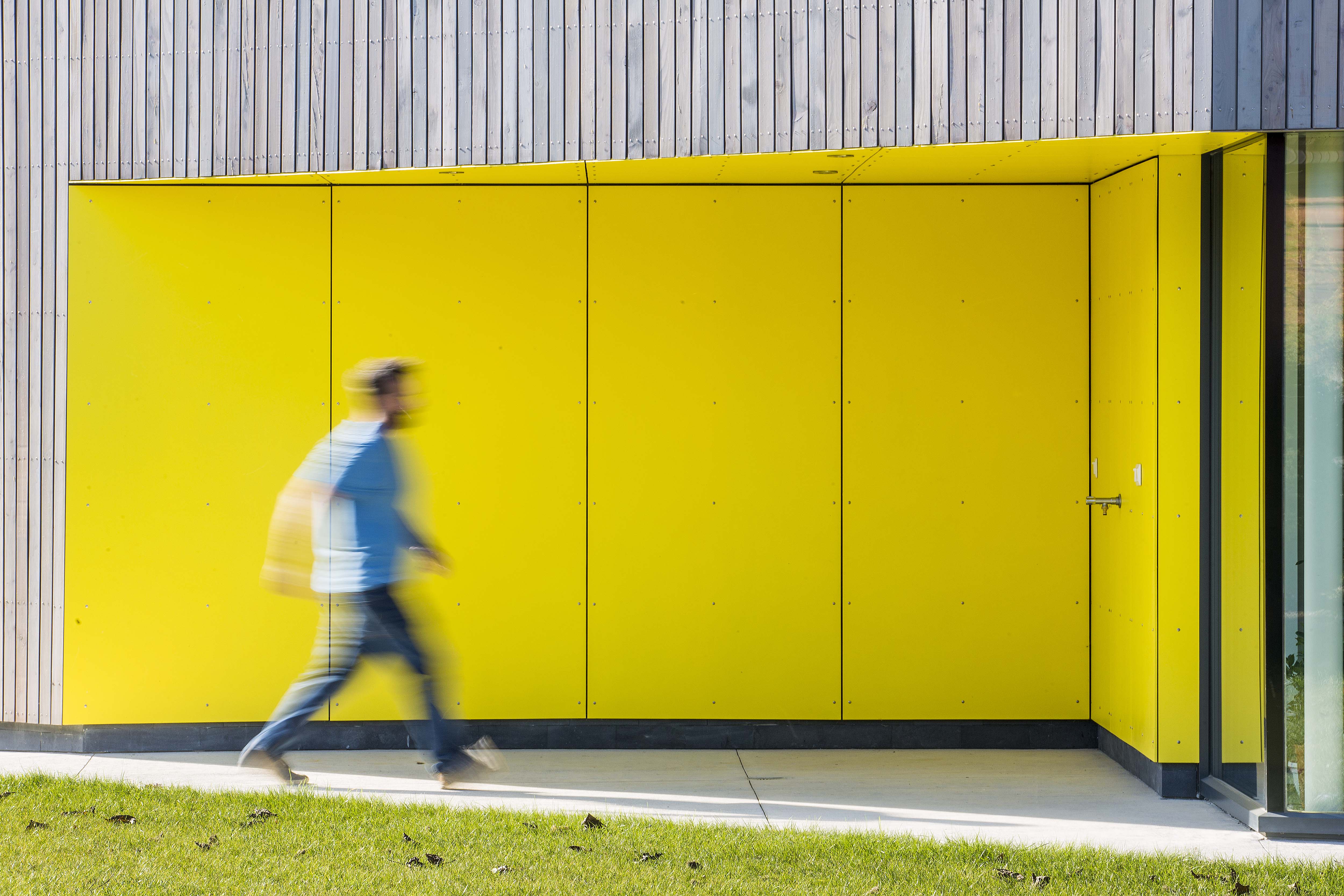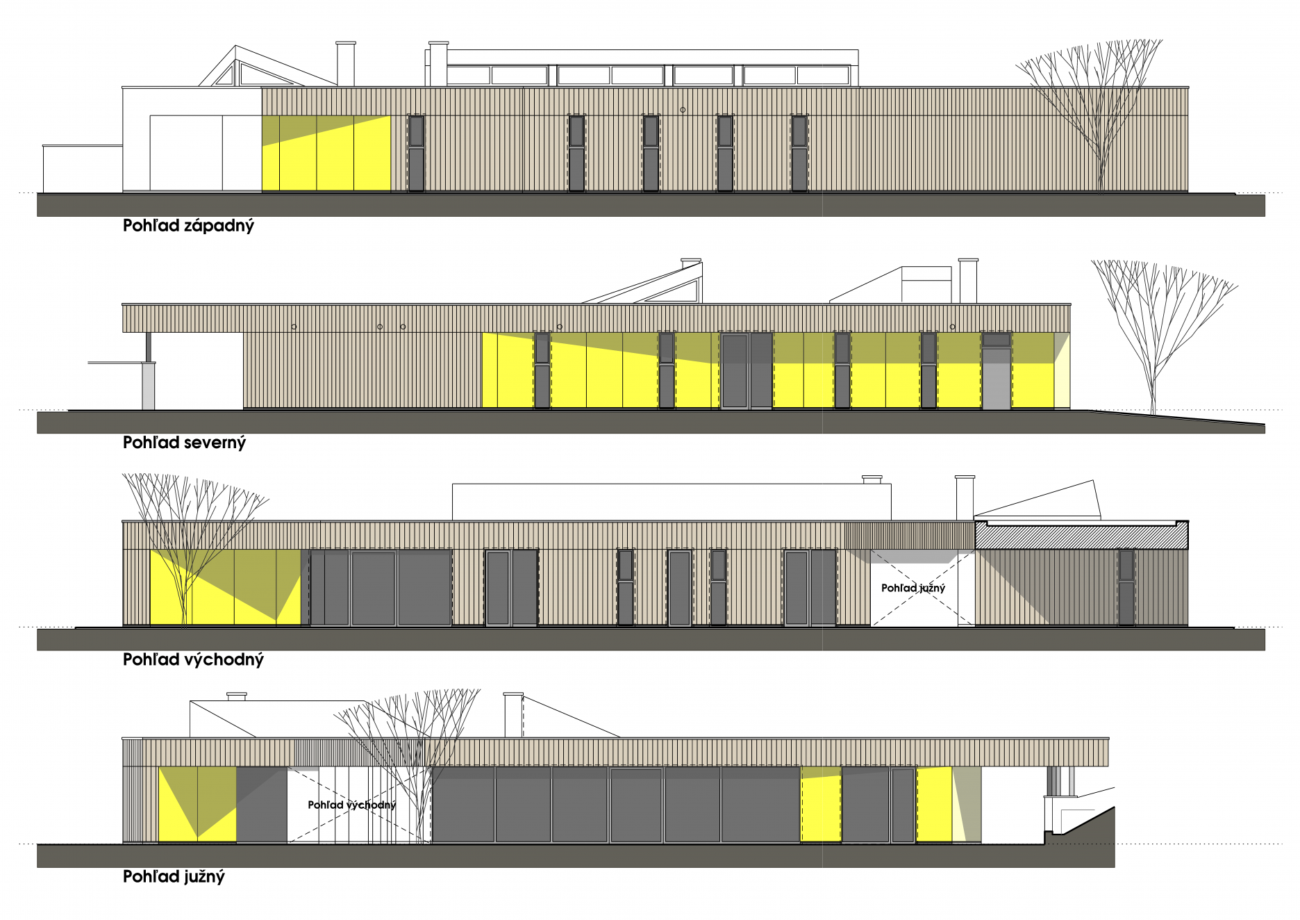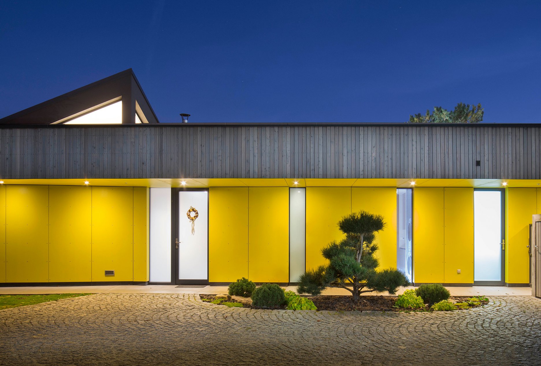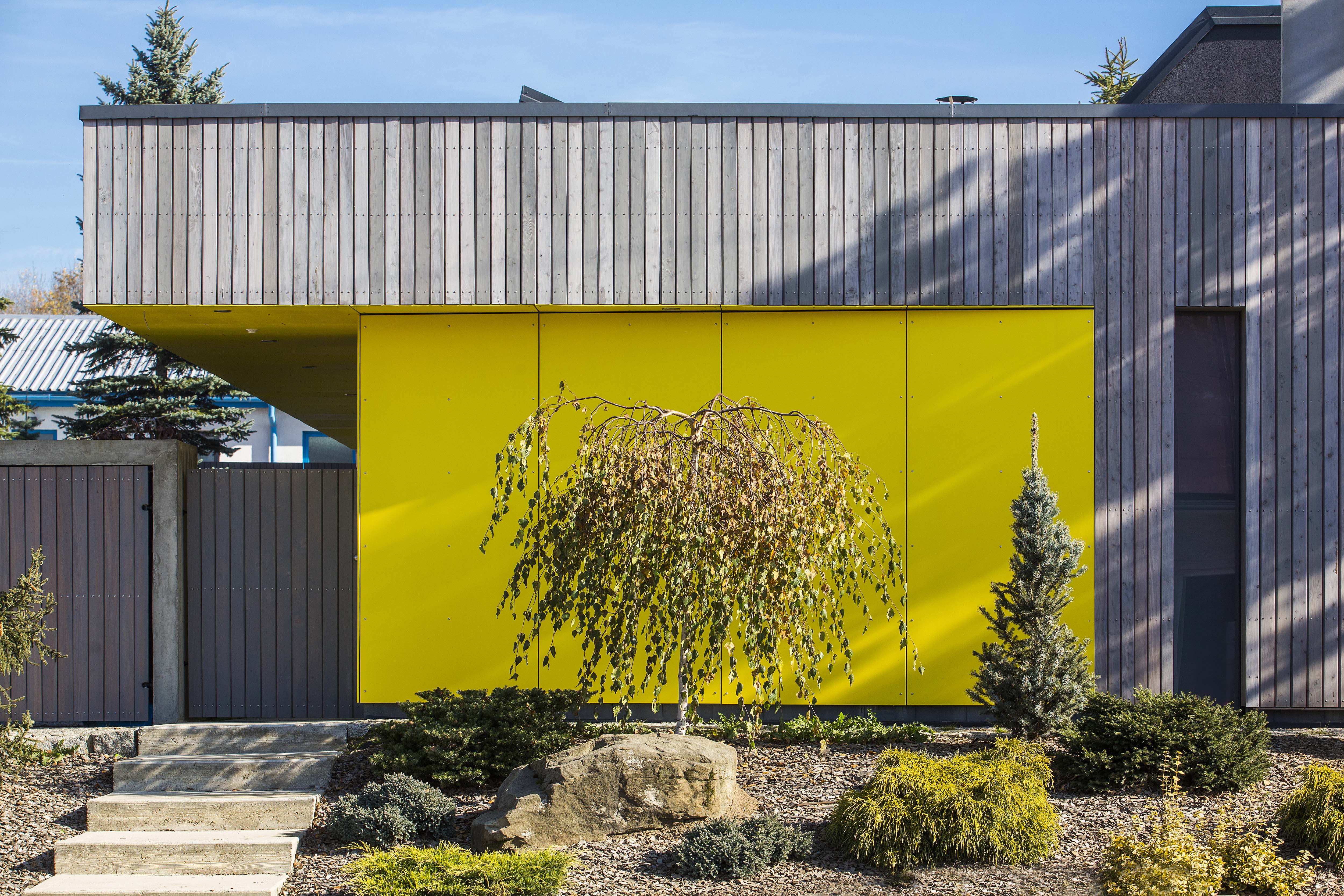 Pohľadovú vrstvu odvetranej fasády tvorí kombinácia plôch vertikálneho dreveného obkladu (s termoúpravou) a kompozitných dosiek Fundermax žltej farby. Všetky klampiarske výrobky sú vyhotovené z hliníkového plechu antracitovej farby. Tmavosivé hliníkové rámy sú zasklené izolačným trojsklom.