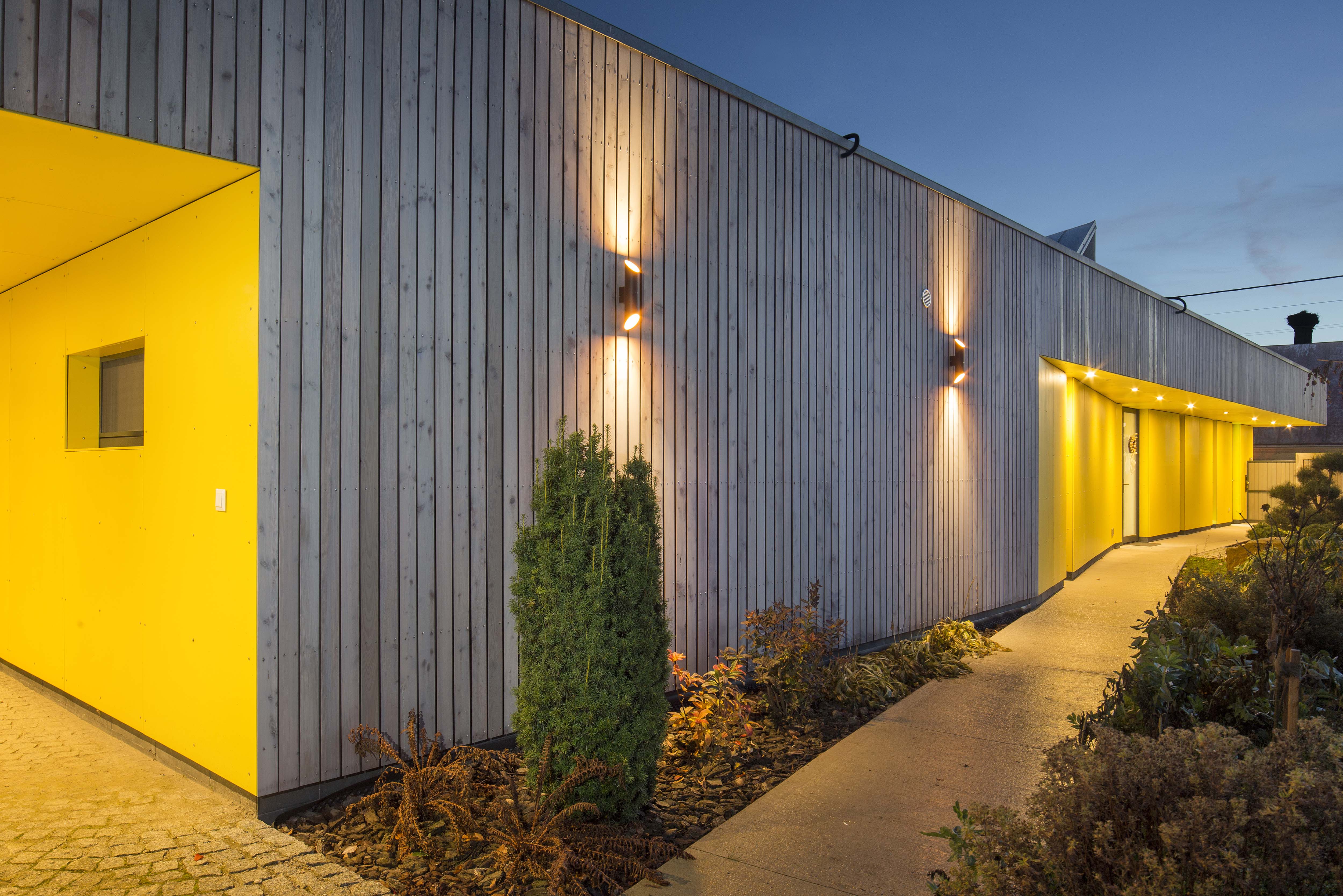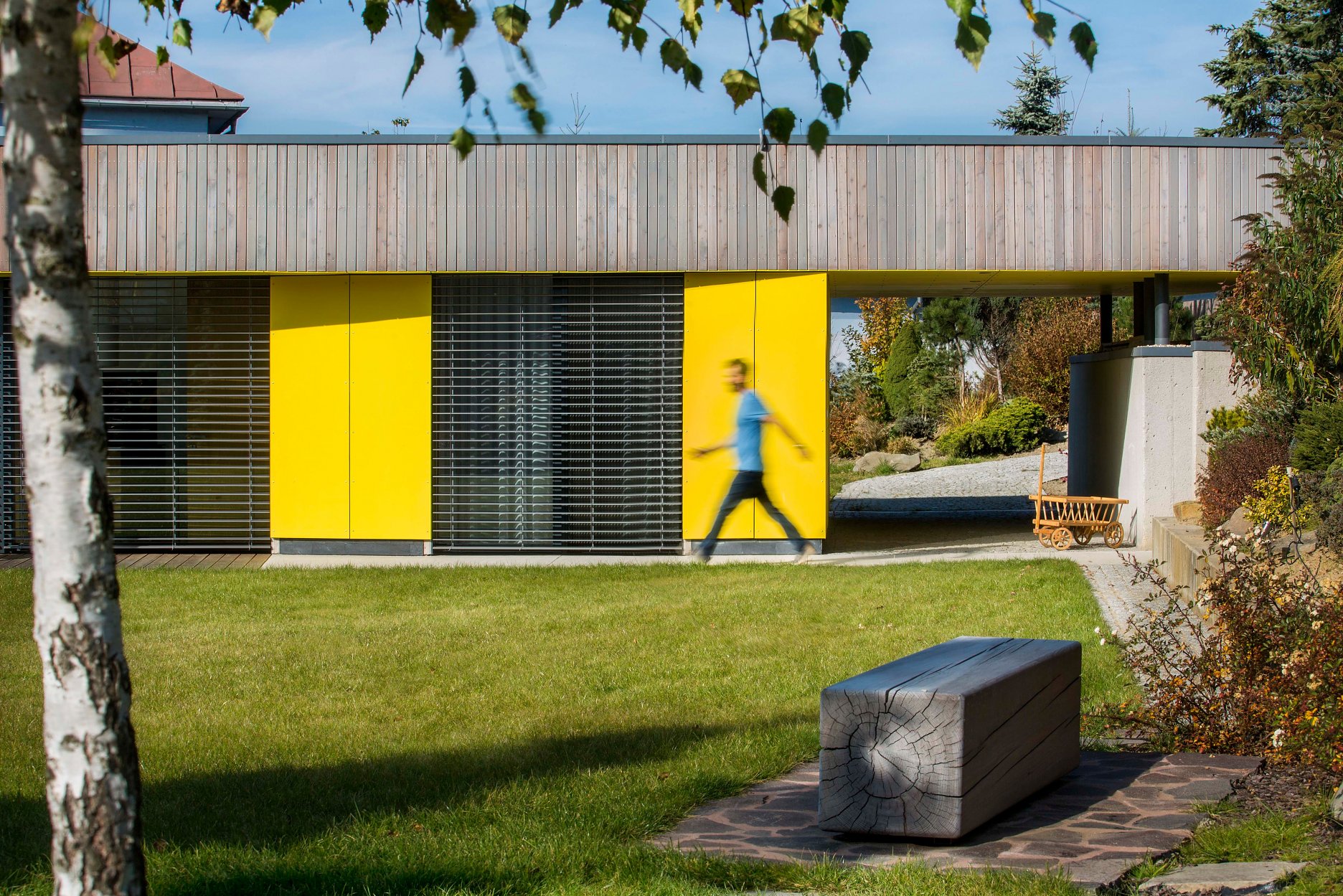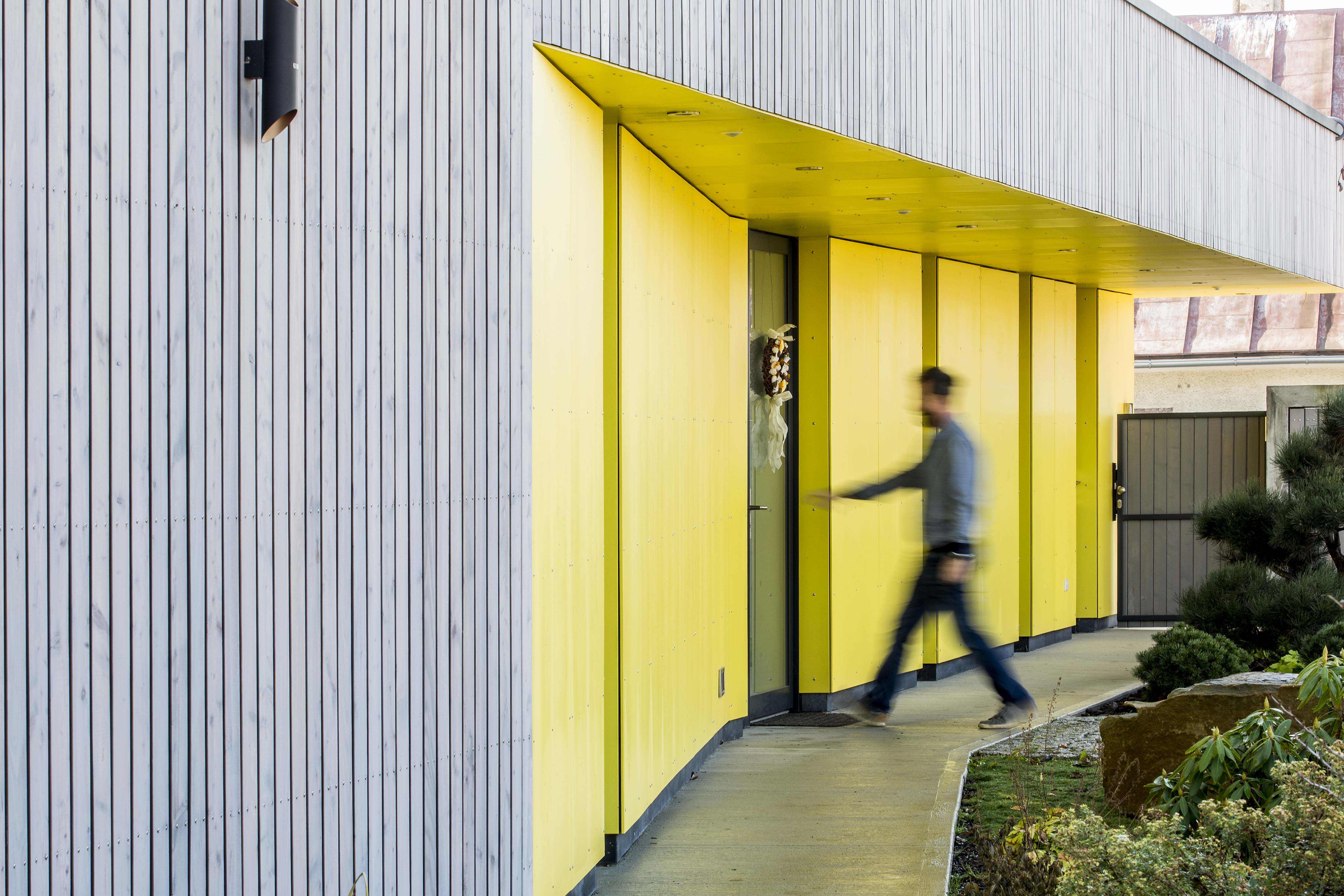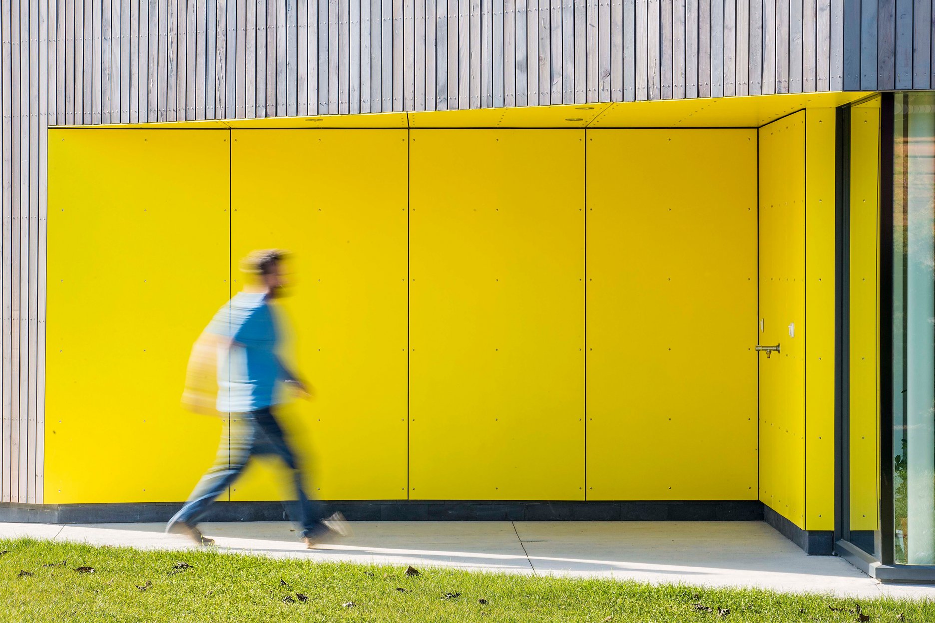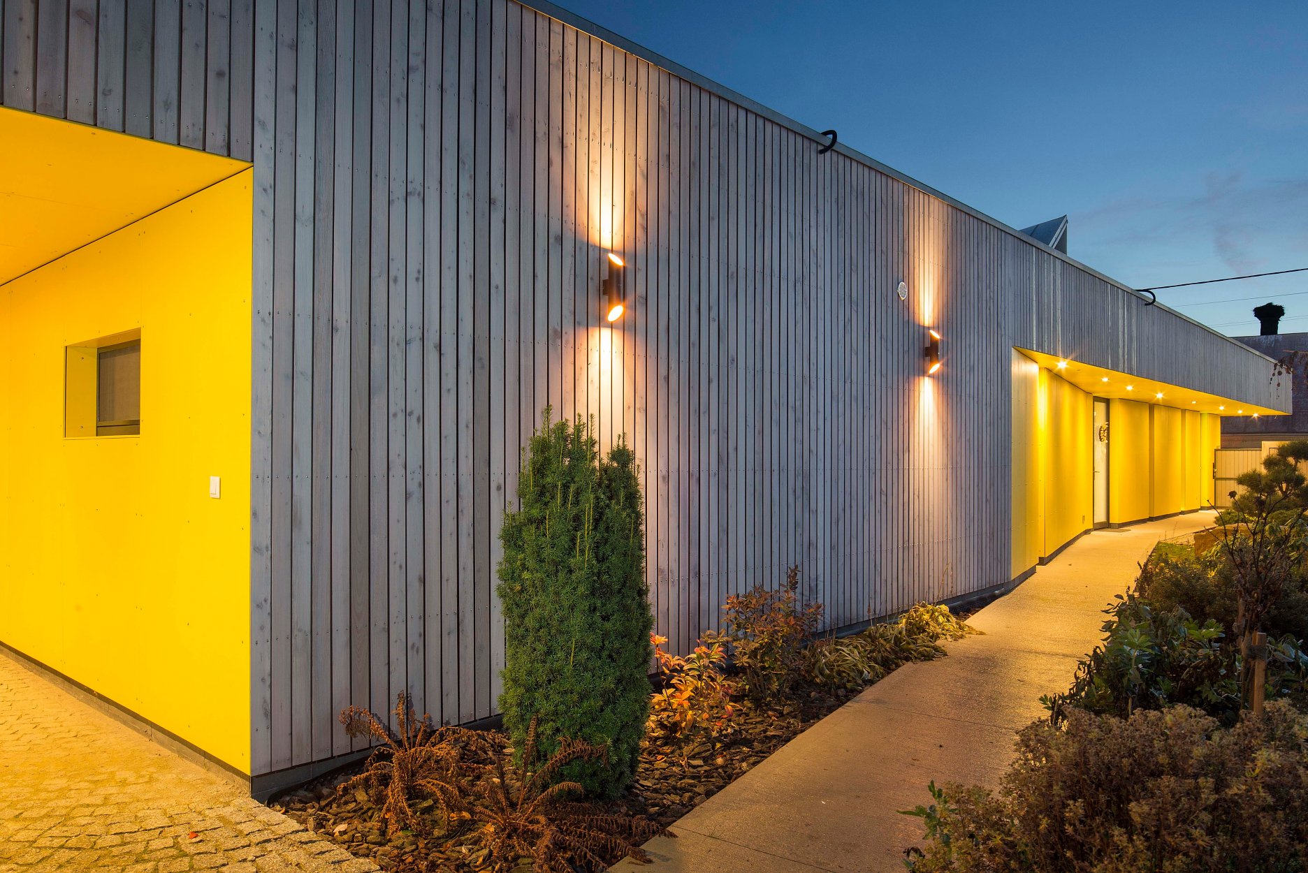Pohľadovú vrstvu odvetranej fasády tvorí kombinácia plôch vertikálneho dreveného obkladu (s termoúpravou) a kompozitných dosiek Fundermax žltej farby. Všetky klampiarske výrobky sú vyhotovené z hliníkového plechu antracitovej farby. Tmavosivé hliníkové rámy sú zasklené izolačným trojsklom.