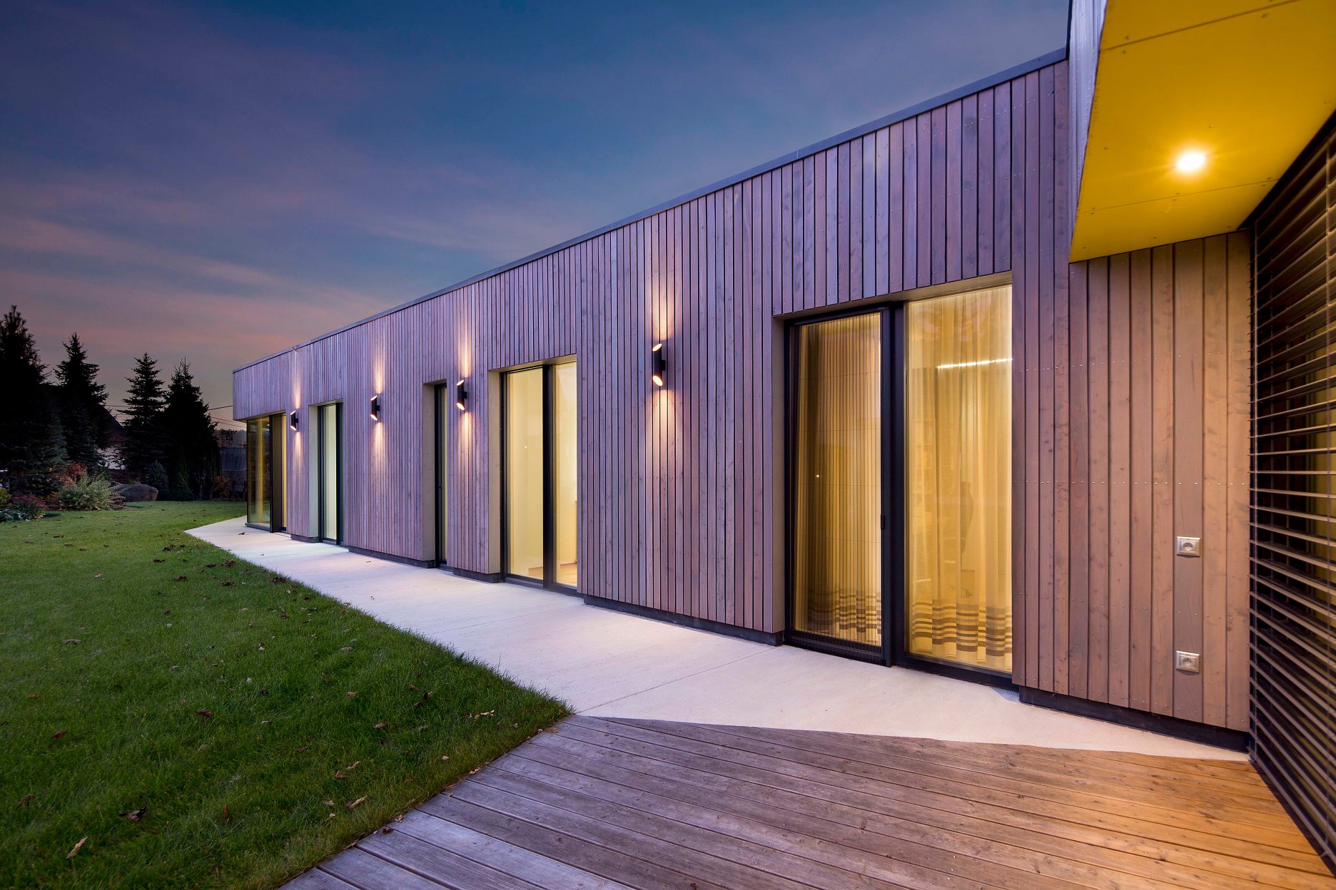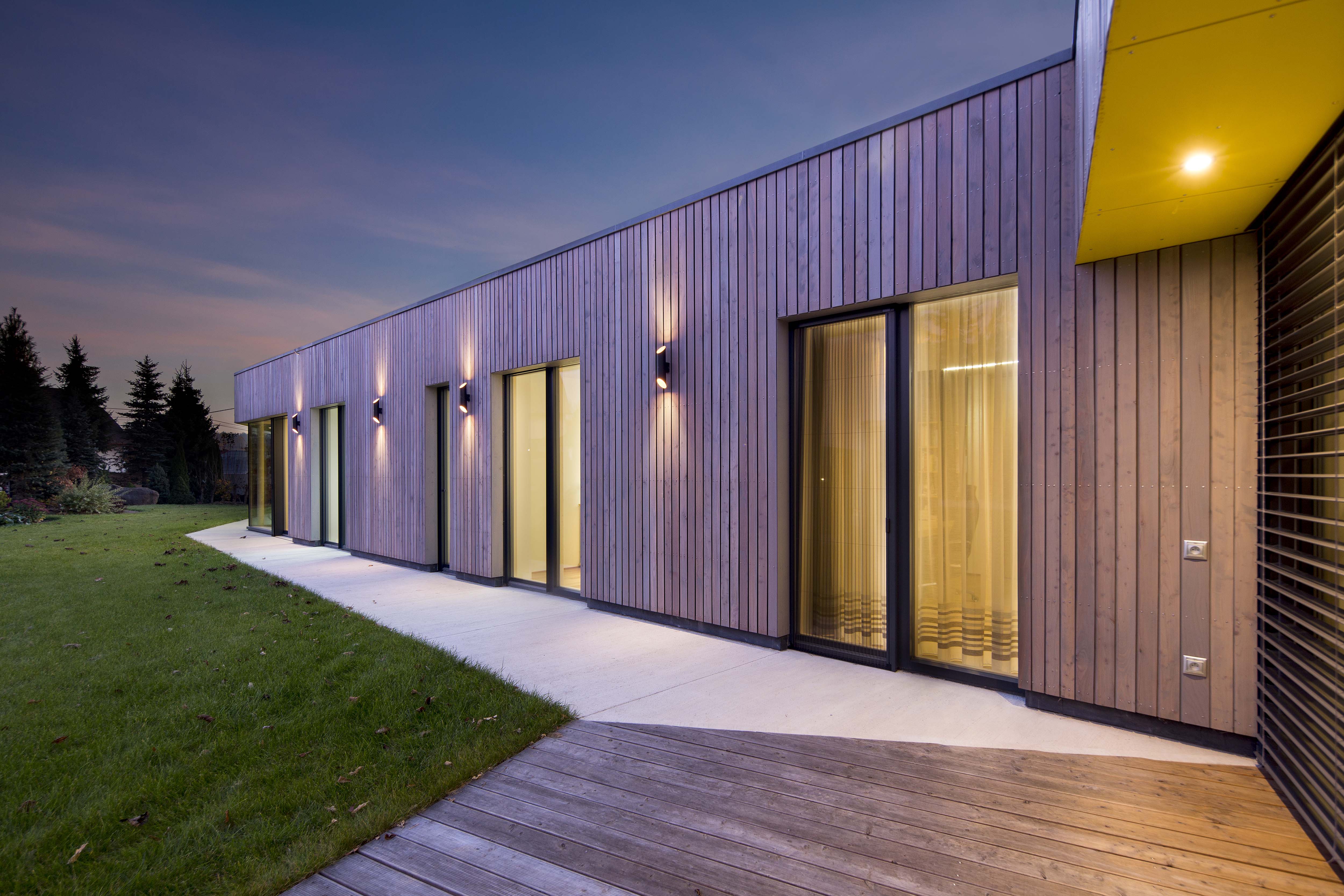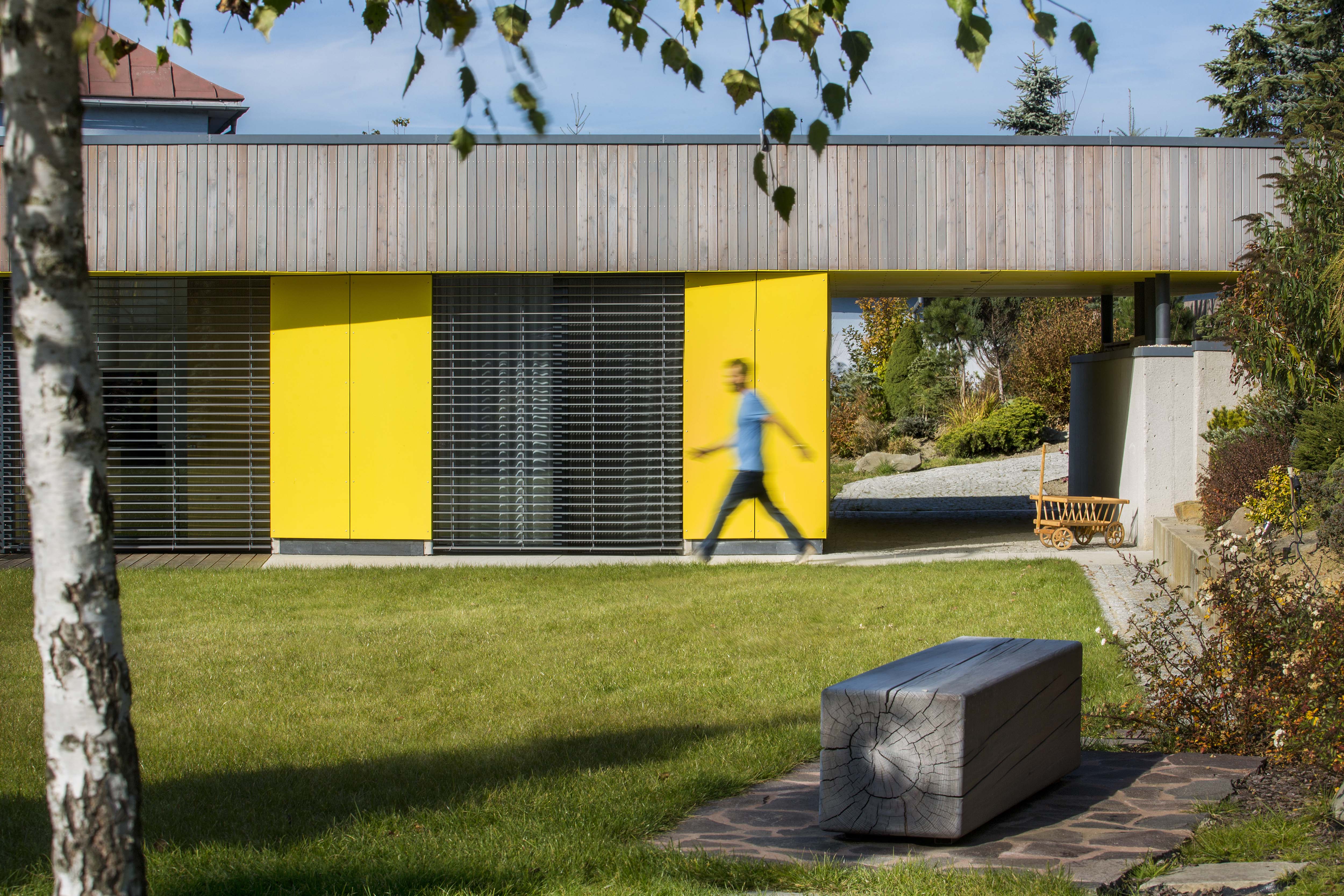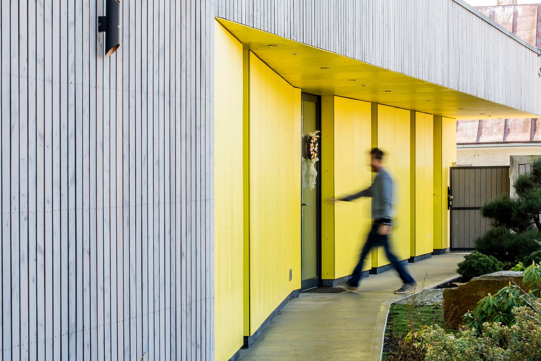 Pohľadovú vrstvu odvetranej fasády tvorí kombinácia plôch vertikálneho dreveného obkladu (s termoúpravou) a kompozitných dosiek Fundermax žltej farby. Všetky klampiarske výrobky sú vyhotovené z hliníkového plechu antracitovej farby. Tmavosivé hliníkové rámy sú zasklené izolačným trojsklom.