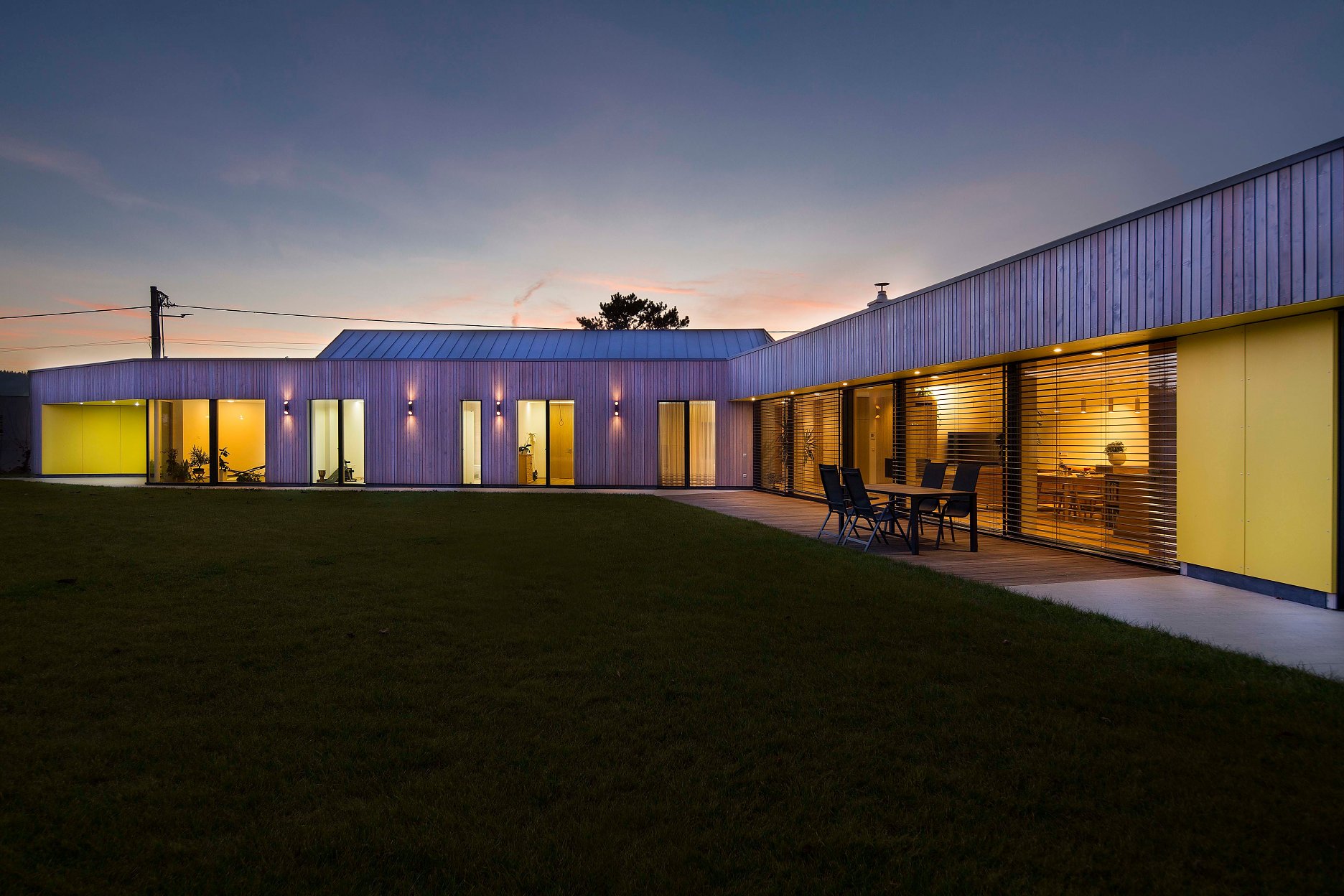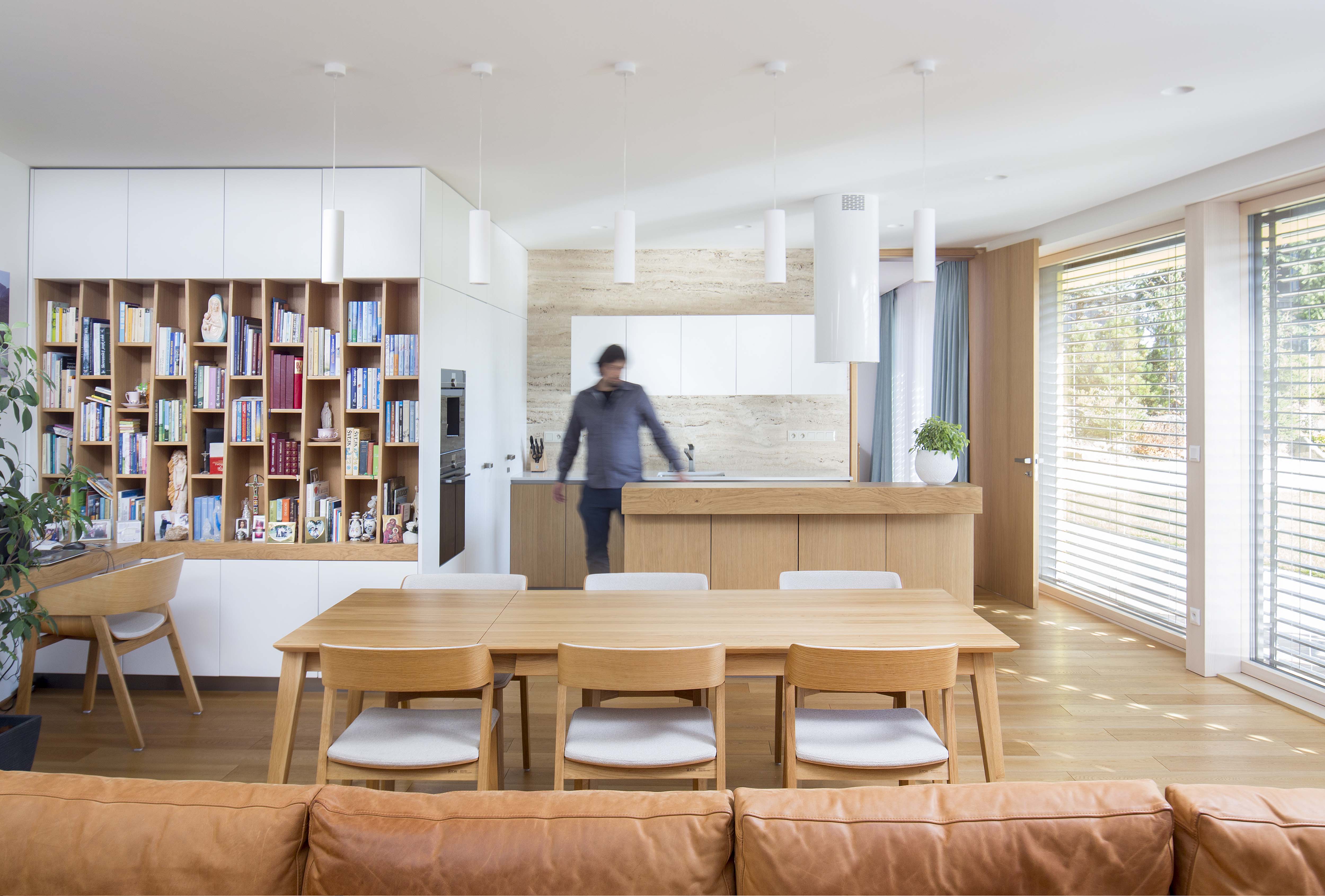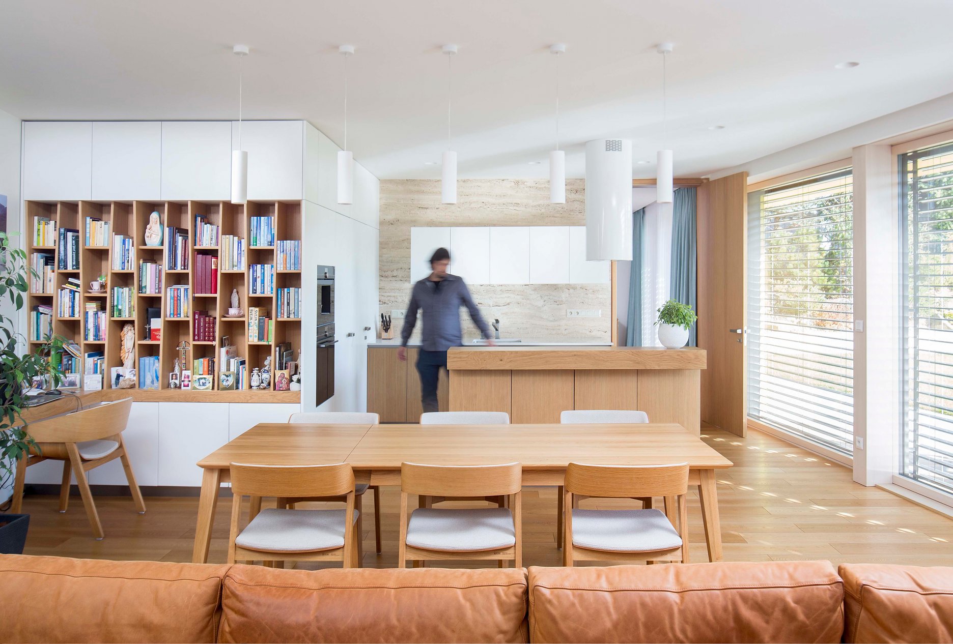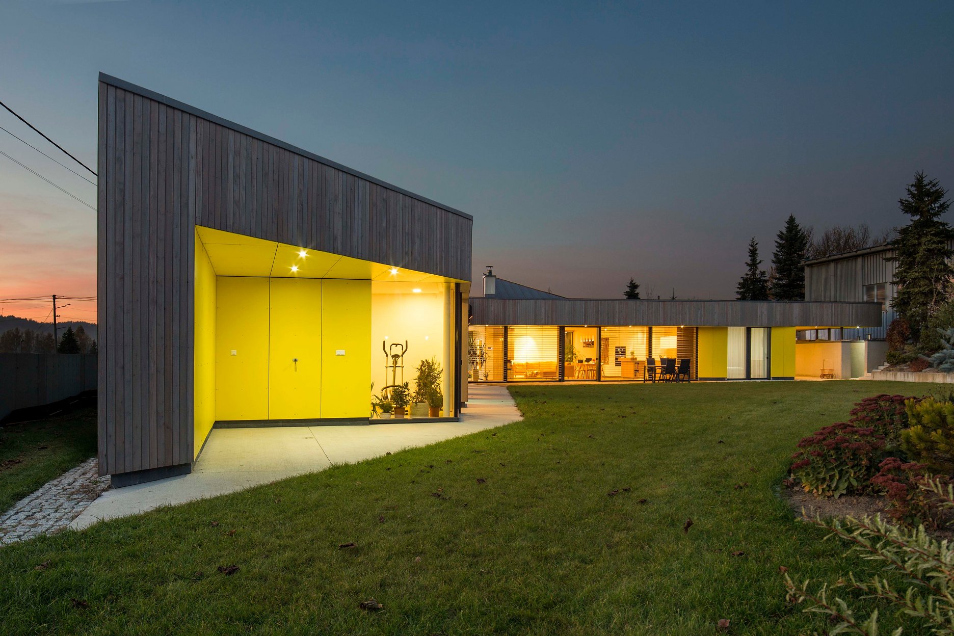Príjemnú sivú patinu dreva, použitého na fasáde domu, strieda v interiéri "živá" farba a textúra prírodného materiálu, ktorá vyniká na monochromatickom pozadí. Priestorový koncept obohatený o prevýšené zóny pod svetlíkmi dopĺňajú výplne otvorov a nábytok využívajúce celú výšku podlažia. K výslednej kvalite prezentovaného diela prispieva aj precízna remeselná práca, zrejmá najmä na nábytkových solitéroch.
