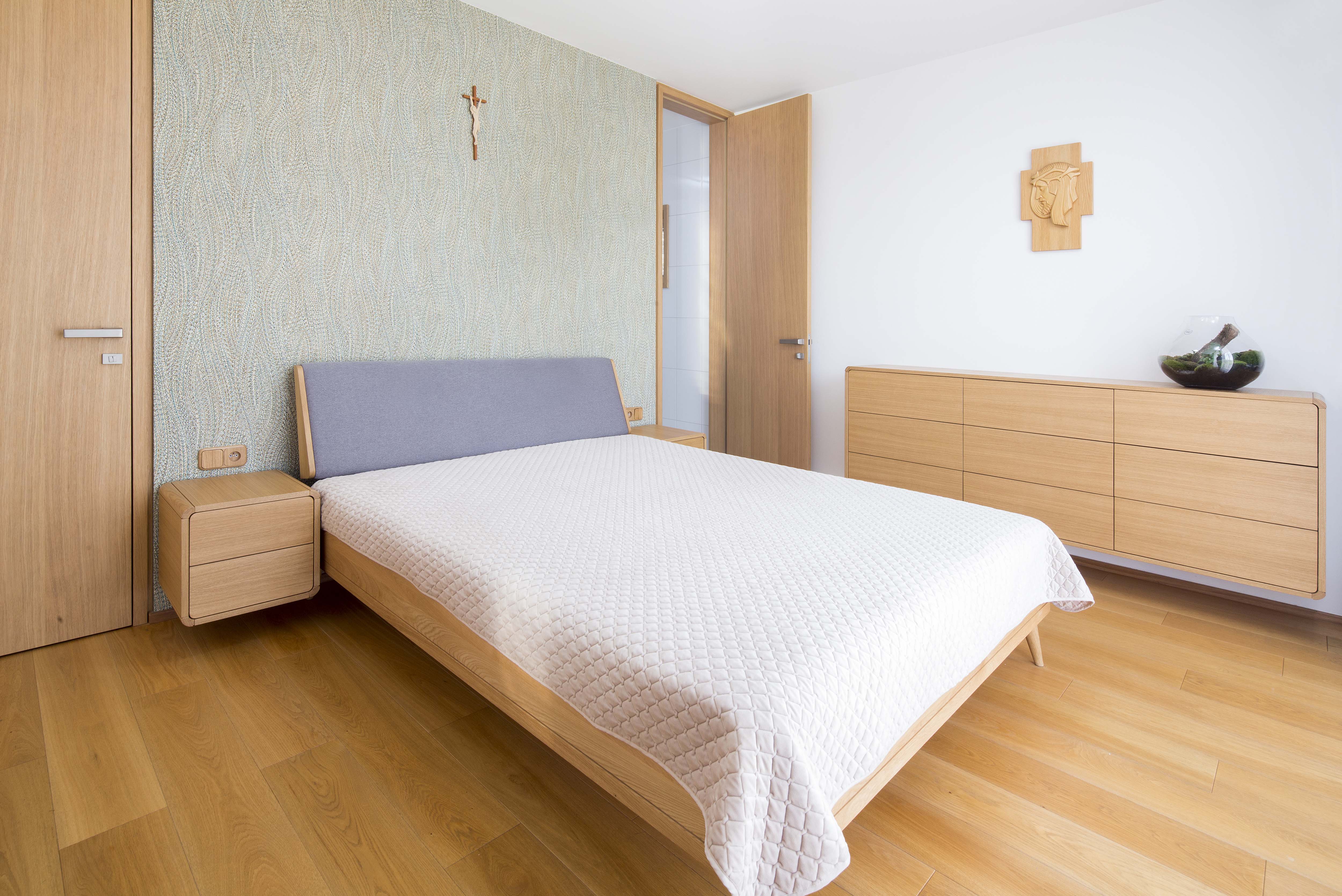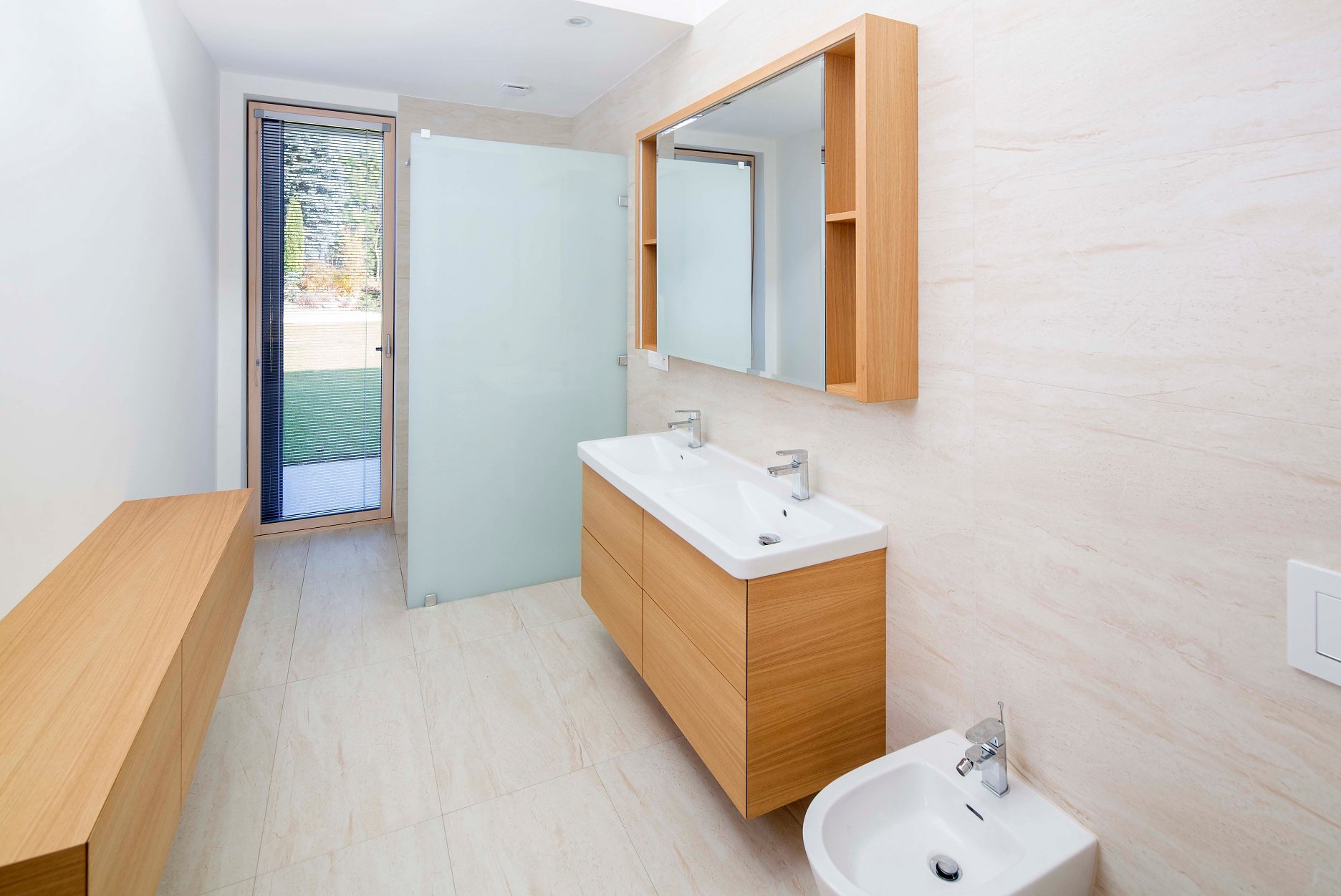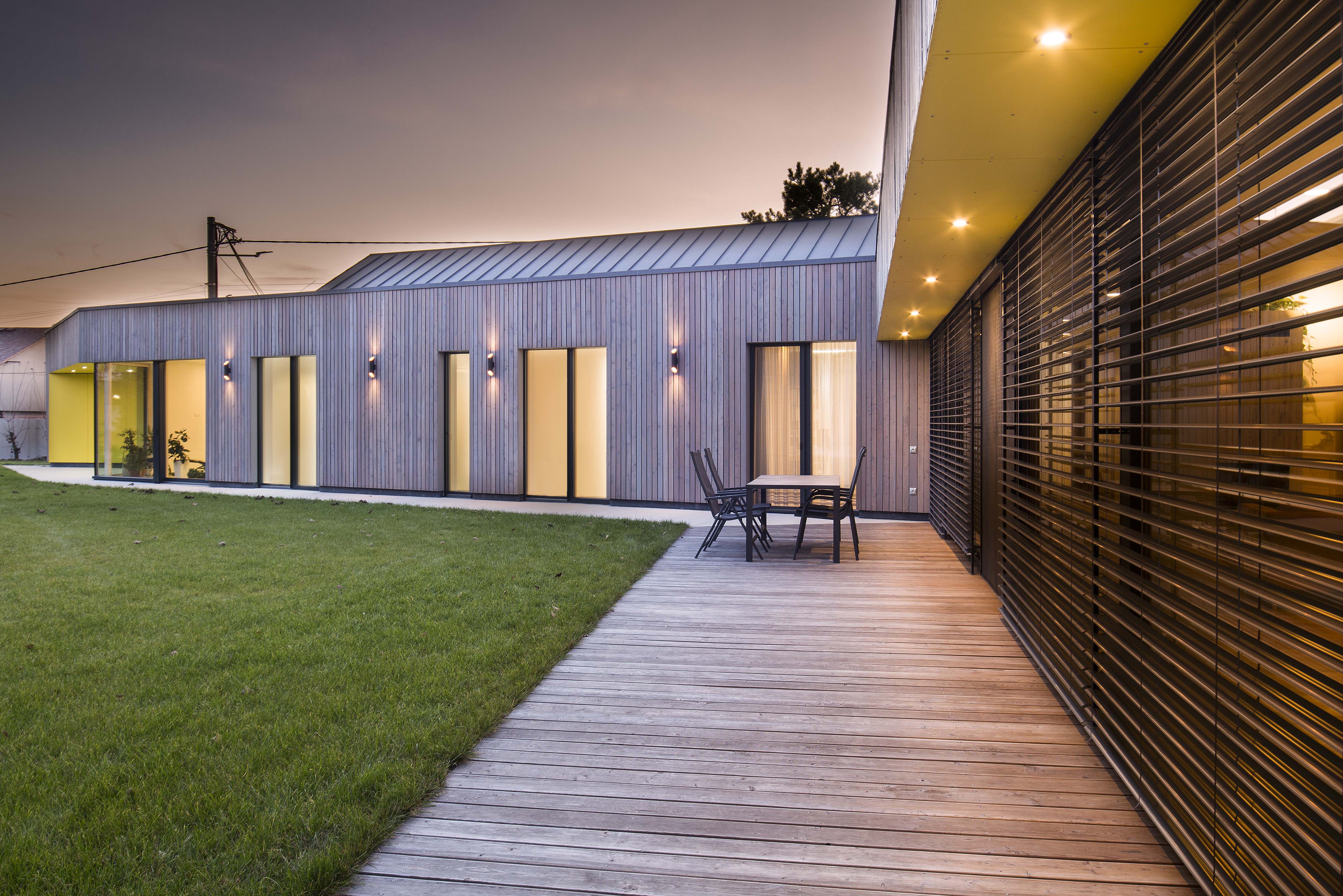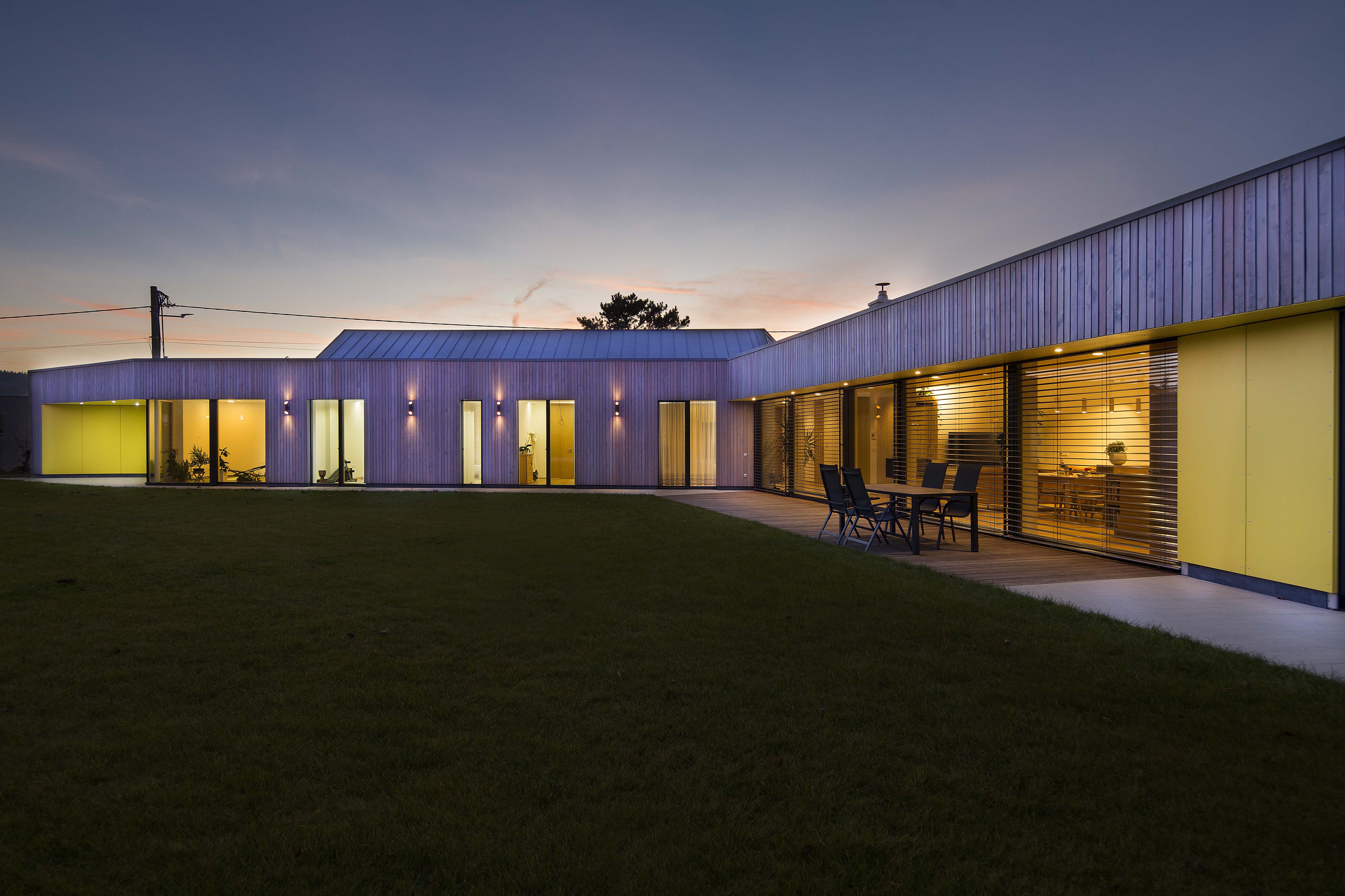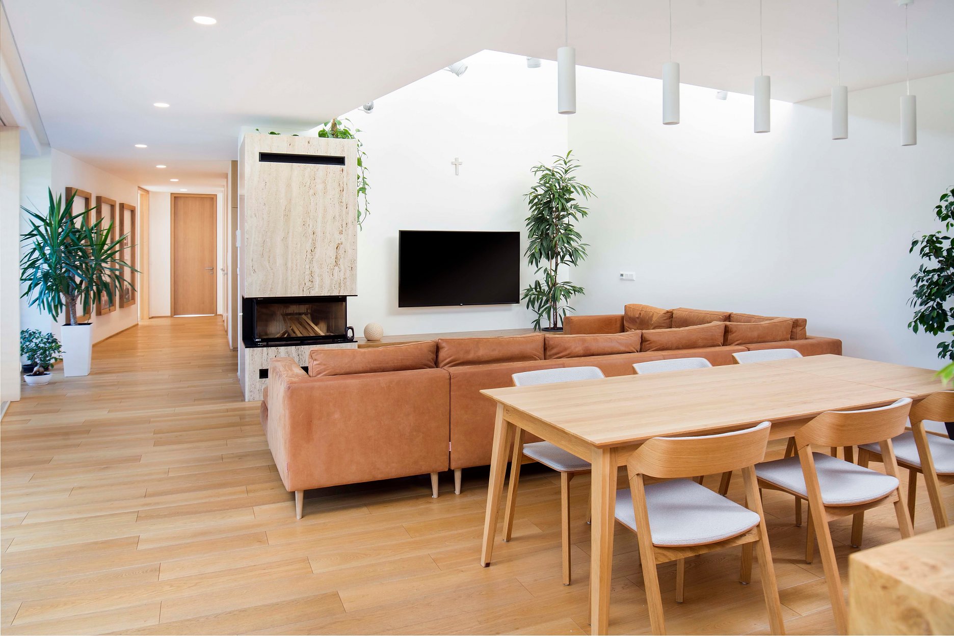 Príjemnú sivú patinu dreva, použitého na fasáde domu, strieda v interiéri "živá" farba a textúra prírodného materiálu, ktorá vyniká na monochromatickom pozadí. Priestorový koncept obohatený o prevýšené zóny pod svetlíkmi dopĺňajú výplne otvorov a nábytok využívajúce celú výšku podlažia. K výslednej kvalite prezentovaného diela prispieva aj precízna remeselná práca, zrejmá najmä na nábytkových solitéroch.