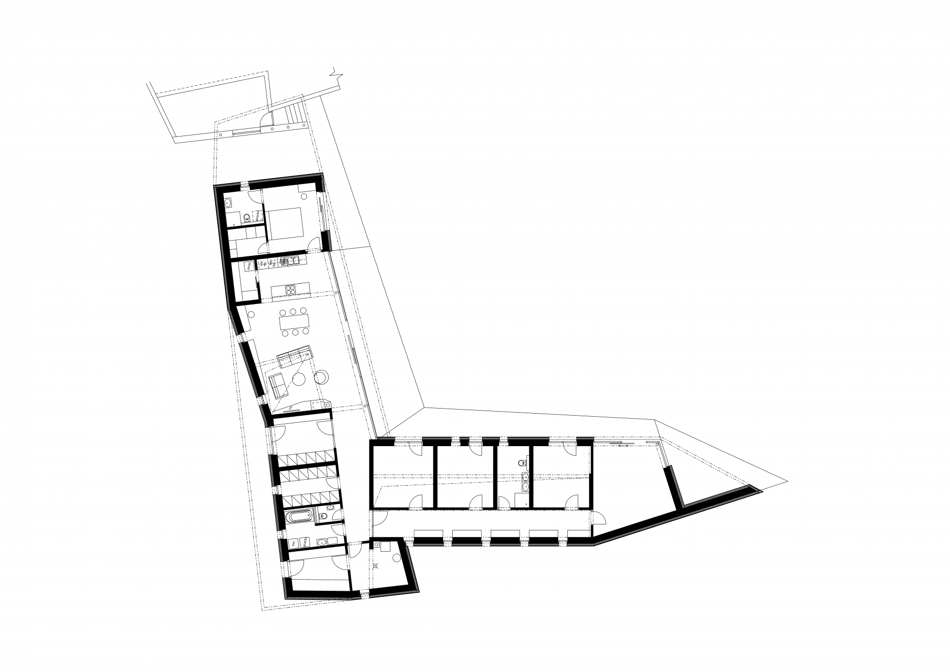 Dom je jednopodlažný, veľkosť pozemku umožňuje usporiadanie dispozície len na prízemí. Radenie a vzájomné väzby hmôt podporujú myšlienku obostavania dvora, tak ako to bolo zvykom v minulosti.