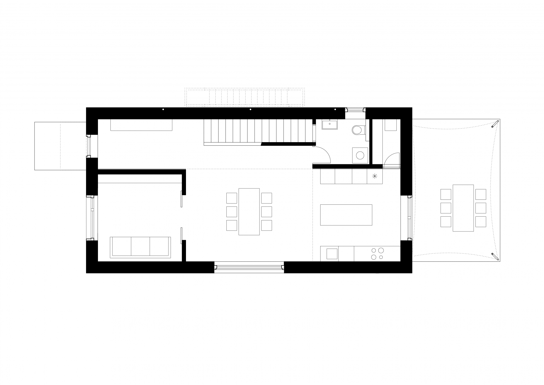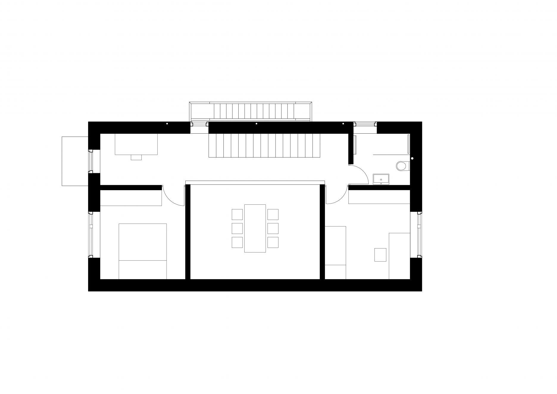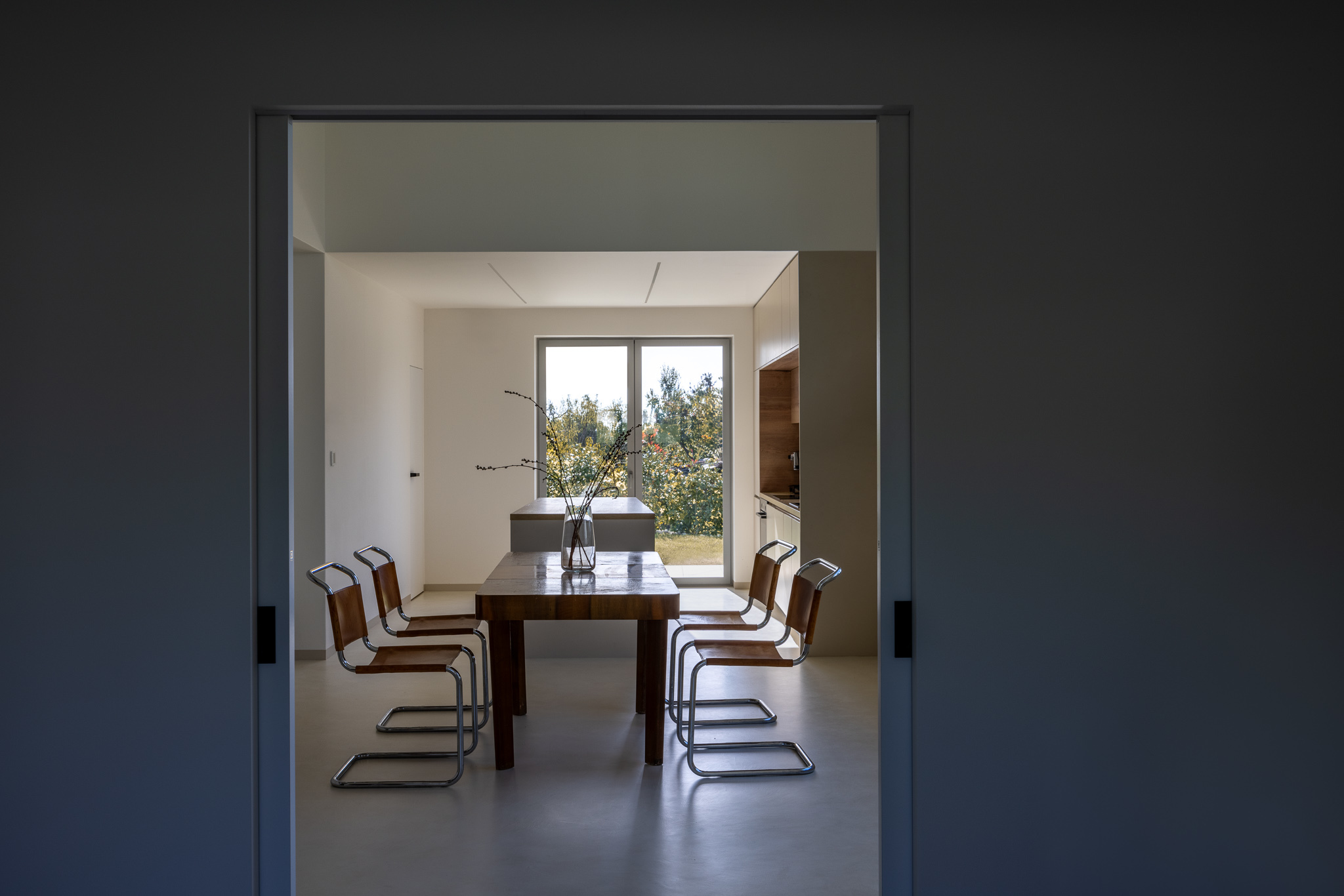Na oboch podlažiach sa v dispozícii uplatňuje schéma troch za sebou radených priestorov, s príslušným servisným vybavením. Na prízemí je dispozícia preplávajúca a otvára priehľady naprieč domom.