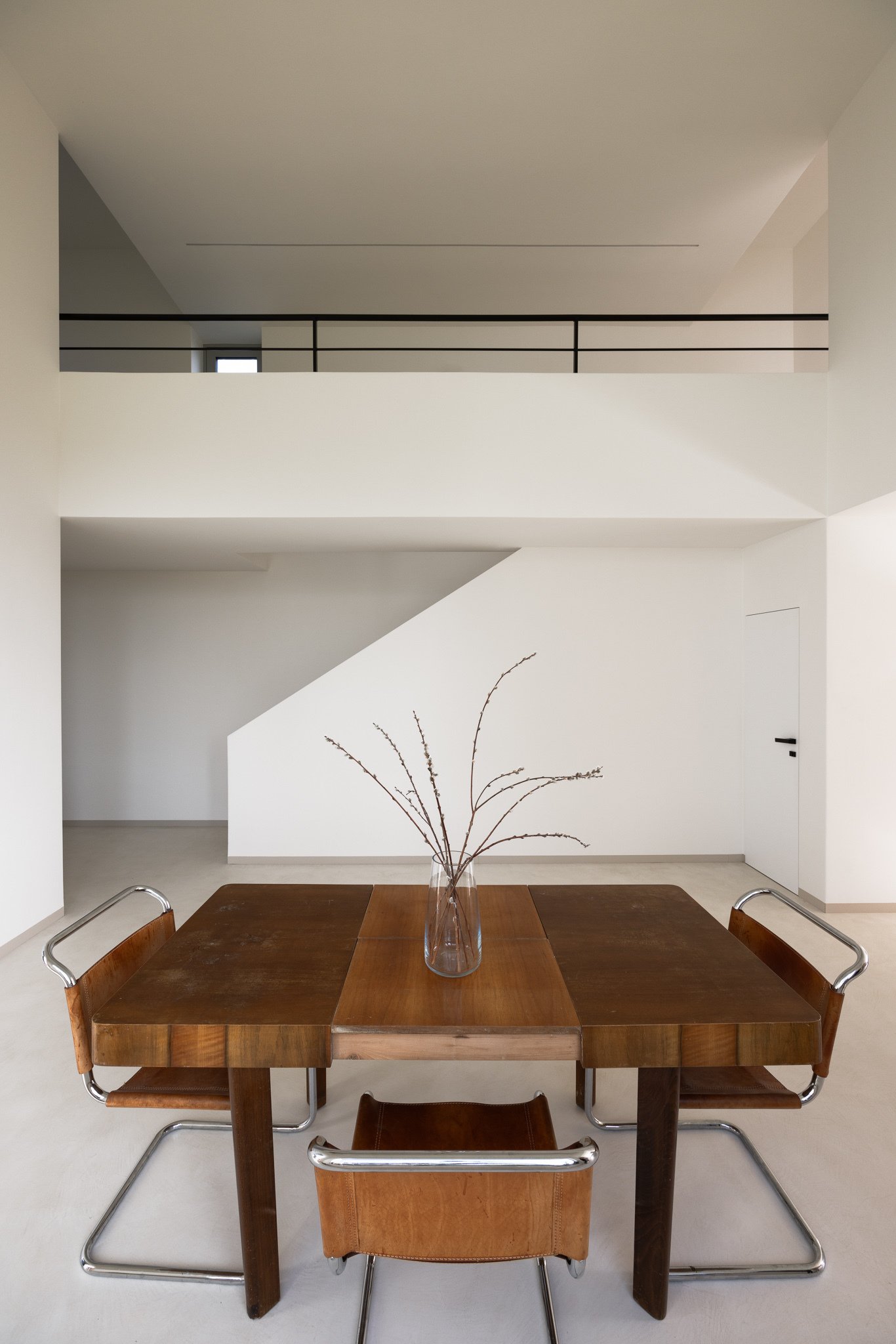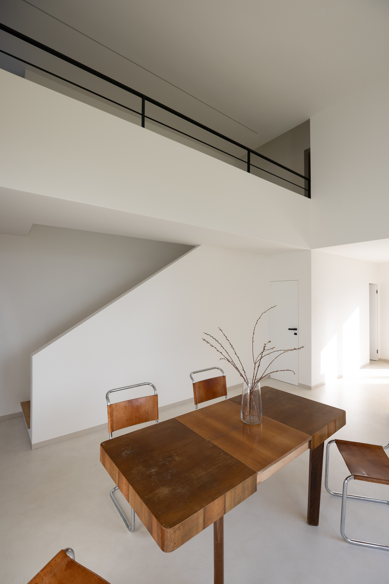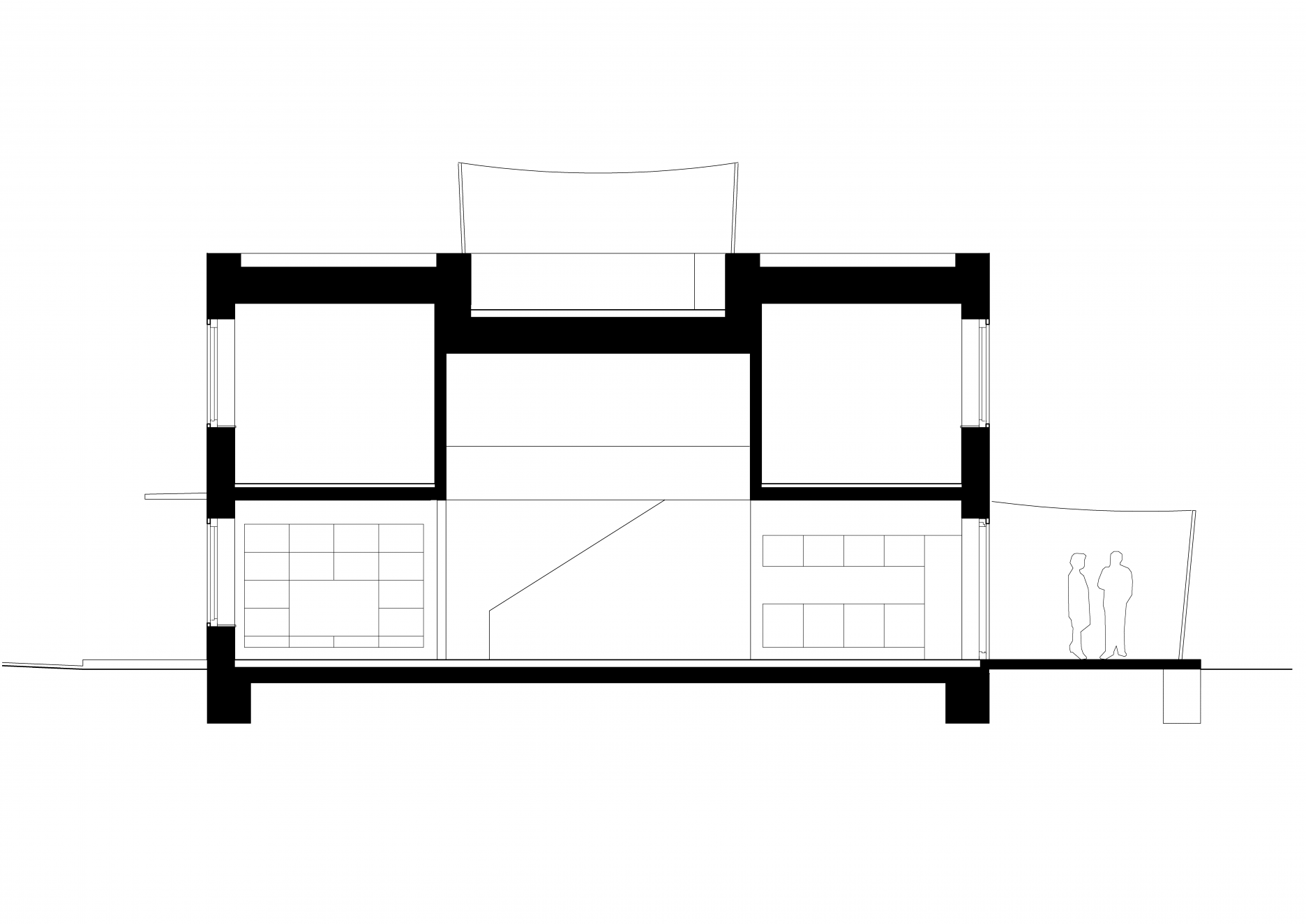 Stredný trakt je otvorený cez obe podlažia. Zníženie v hornej úrovni, vytvára strešnú terasu, sprístupnenú vonkajším oceľovým schodiskom. Nosný systém domu kombinuje keramické tvarovky hrúbky 440 mm a monolitické stropné dosky. Izolačné zasklenie je osadené do hliníkových profilov.
