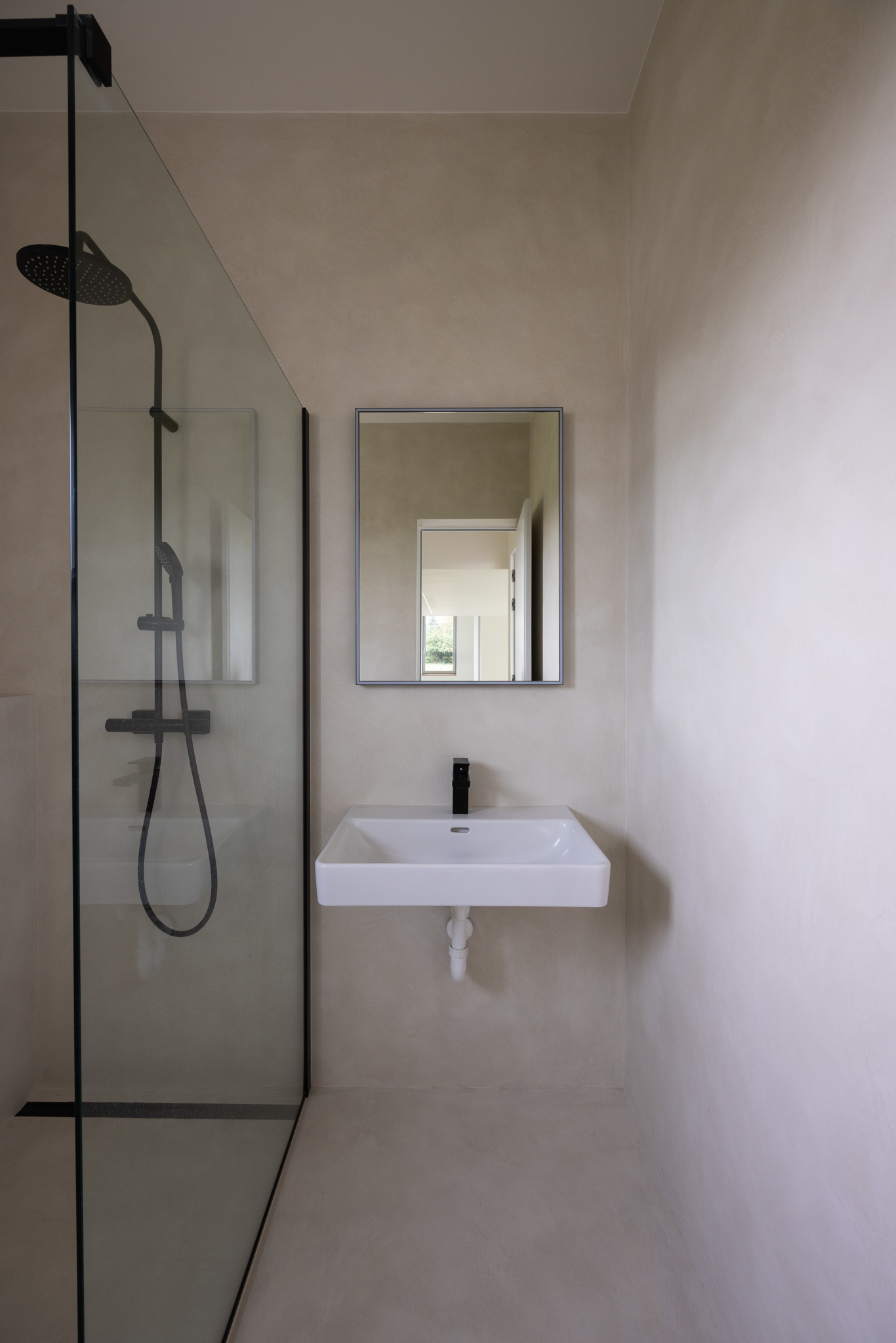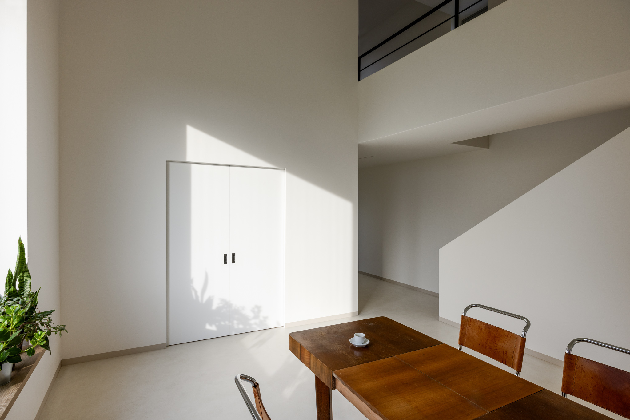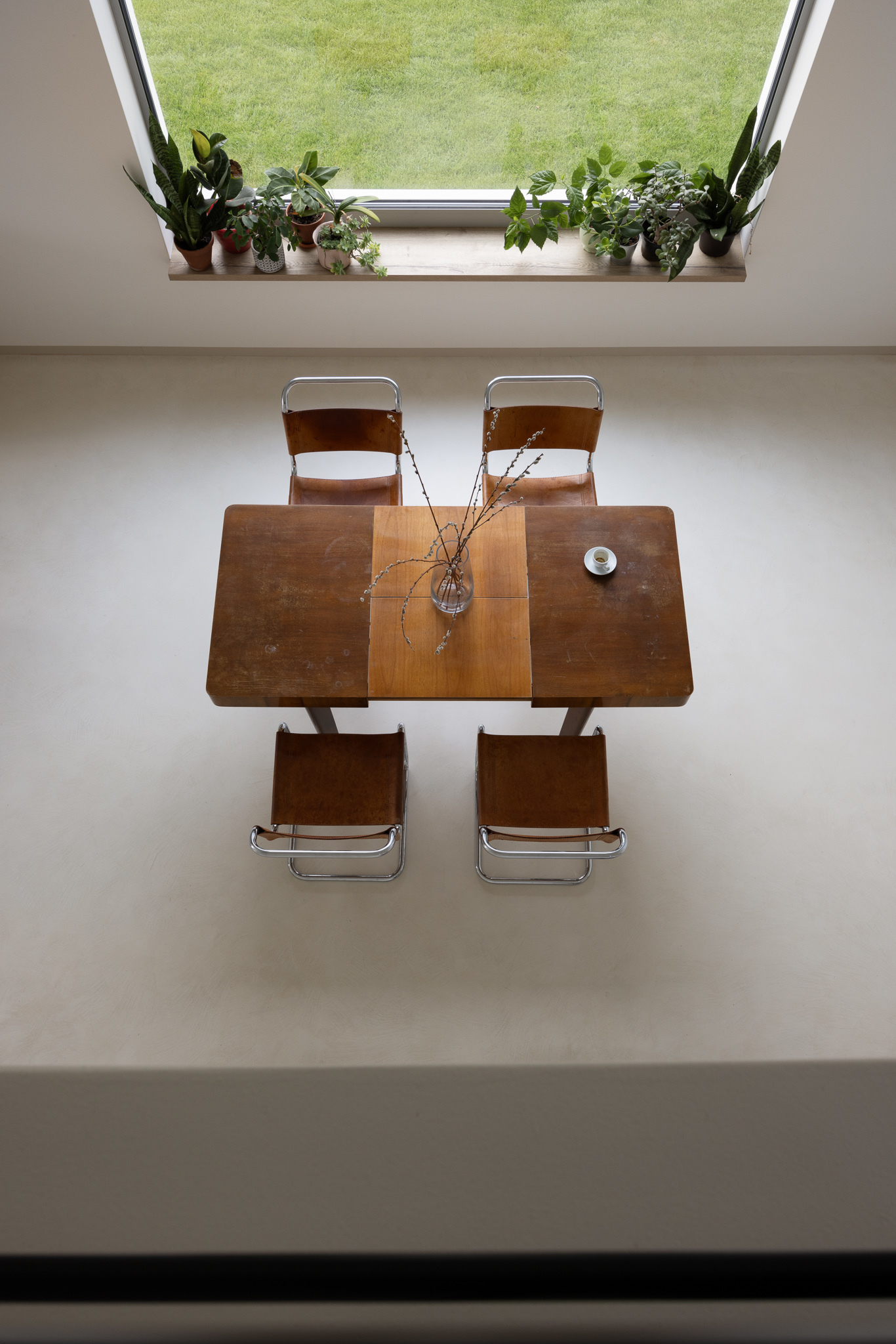 Stredný trakt je otvorený cez obe podlažia. Zníženie v hornej úrovni, vytvára strešnú terasu, sprístupnenú vonkajším oceľovým schodiskom. Nosný systém domu kombinuje keramické tvarovky hrúbky 440 mm a monolitické stropné dosky. Izolačné zasklenie je osadené do hliníkových profilov.