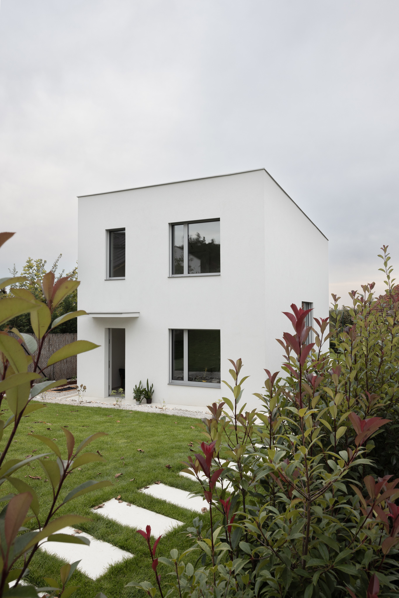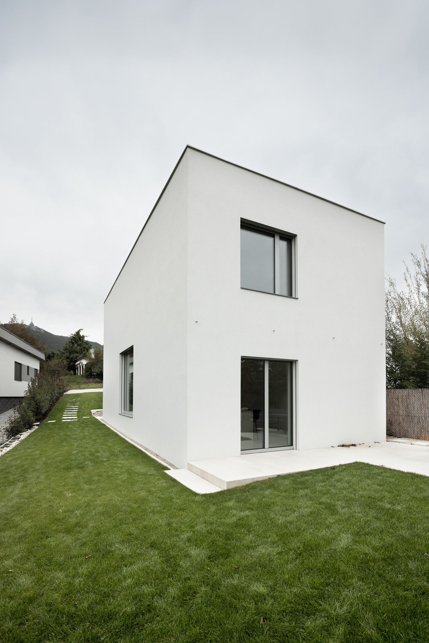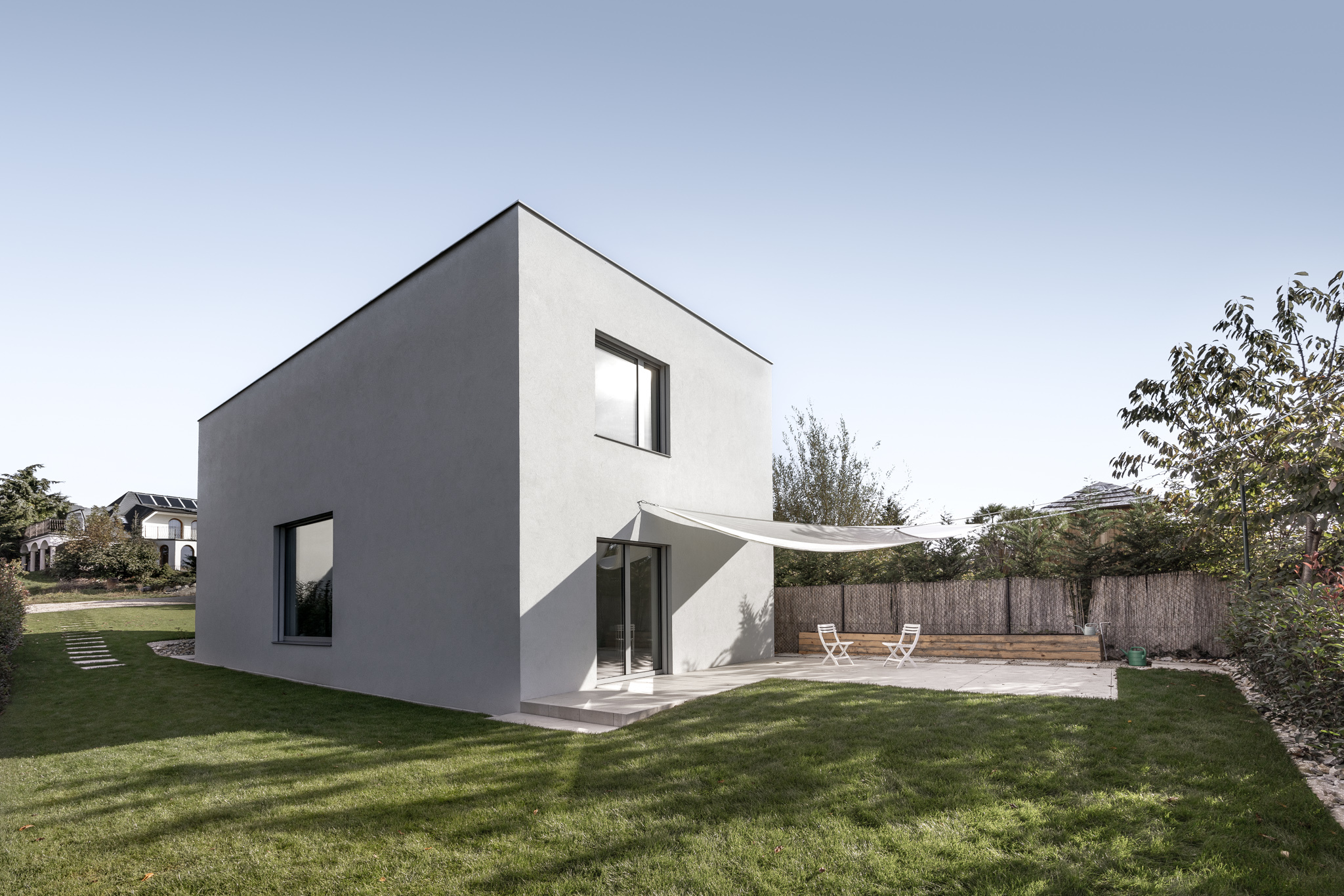 Hmotu domu tvorí racionálny biely kubus s vonkajšími rozmermi 6,5 x 12,5 x 6,5 m. Prísnu formu “zmäkčuje” zámočnícka konštrukcia schodiska a plachta tieniaca terasu.