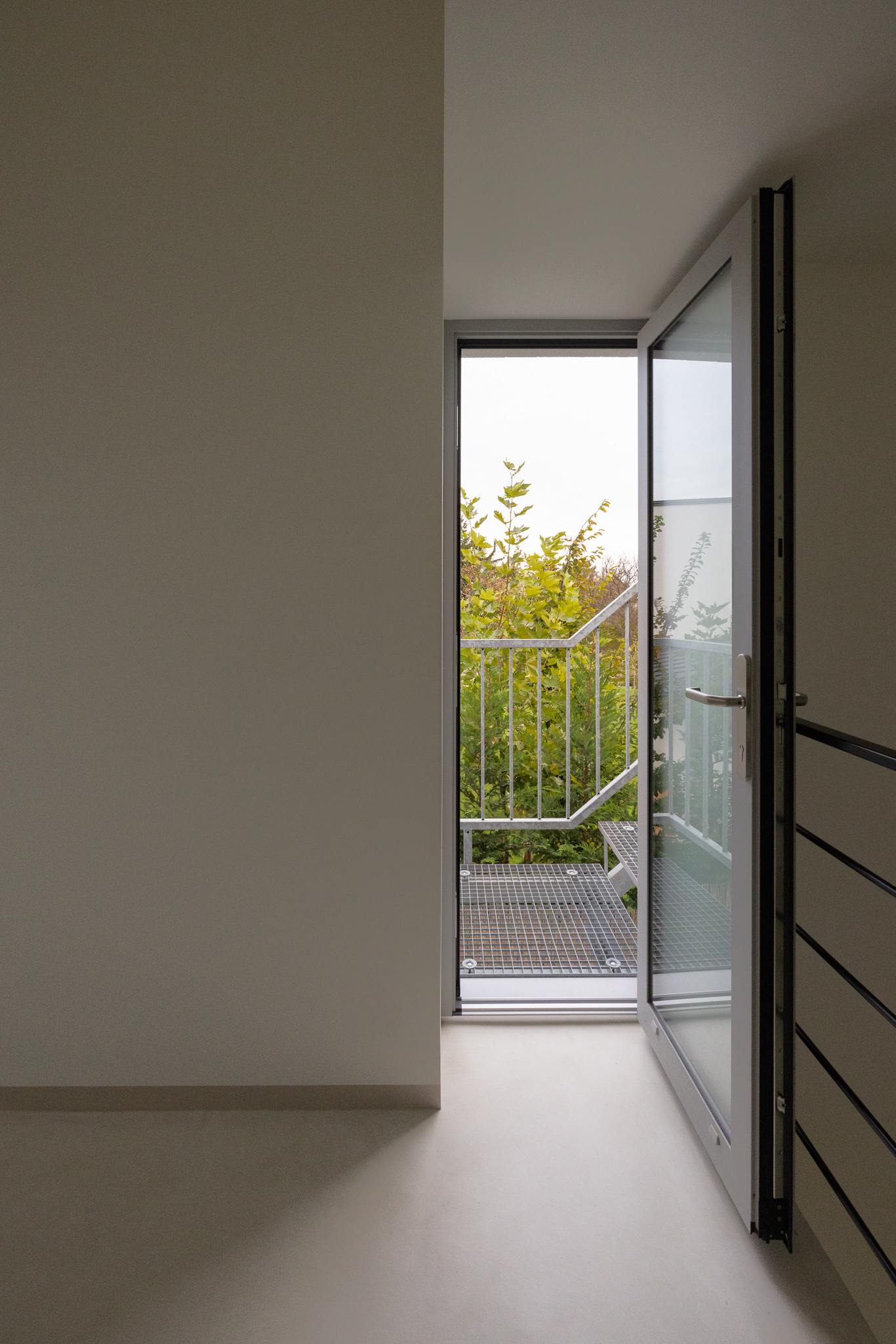 Hliníkové okná so skrytým krídlom sú z profilového systému heroal W72i a s izolačným trojsklom s Ug = 0,6 W/(m2K). Veľké fixné okno v prízemí je vyrobené z hliníkového profilu heroal W77HI, v ktorom je osadené 320 kg ťažké obojstranne kalené sklo (ESG). V prípade vchodových dverí sa majitelia rozhodli pre hliníkové dvere heroal D72 s mliečnym izolačným sklom, ktoré je takisto obojstranne kalené. Všetky okná aj dvere sú v obojstrannej štruktúrovanej farbe RAL 0848.