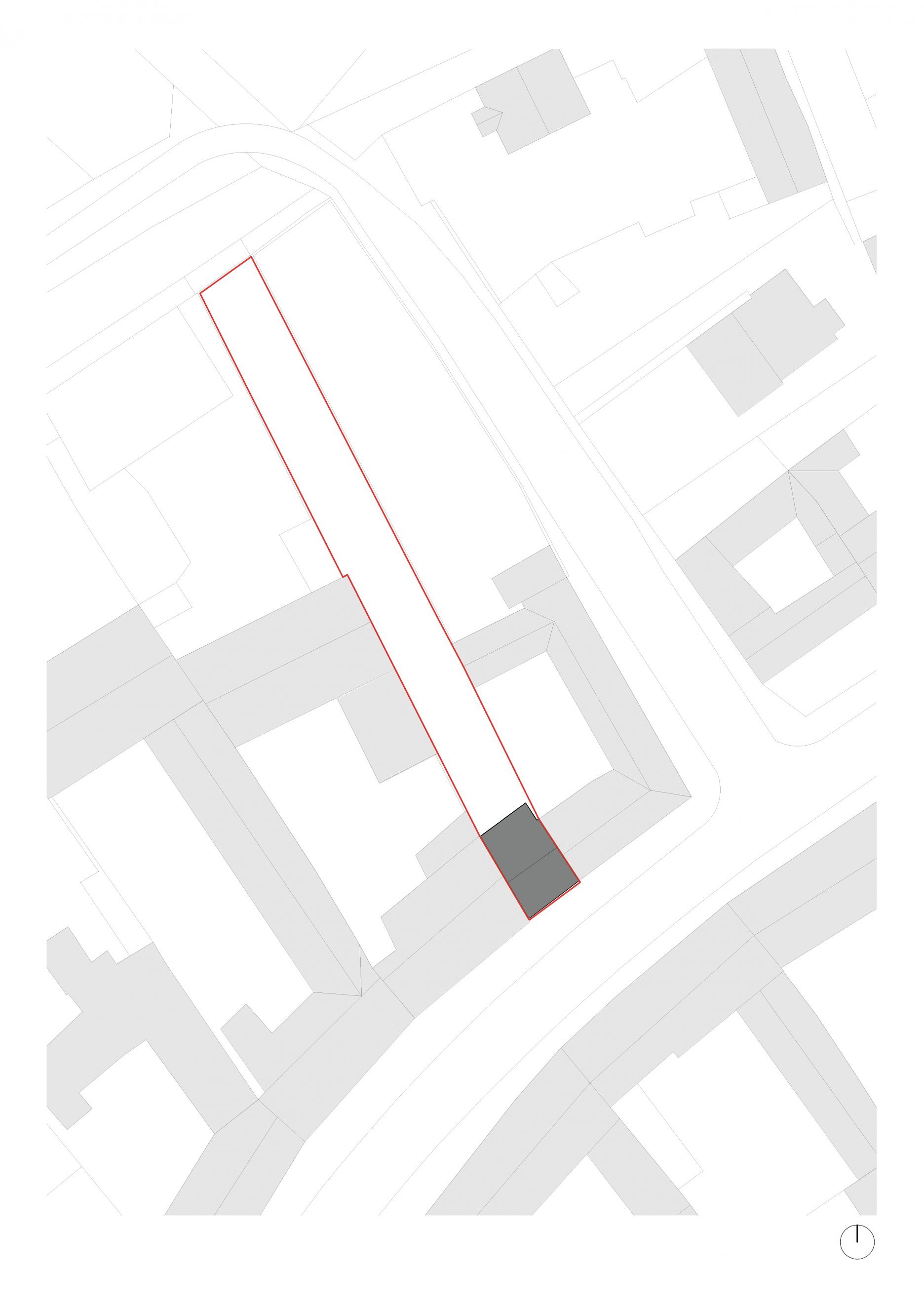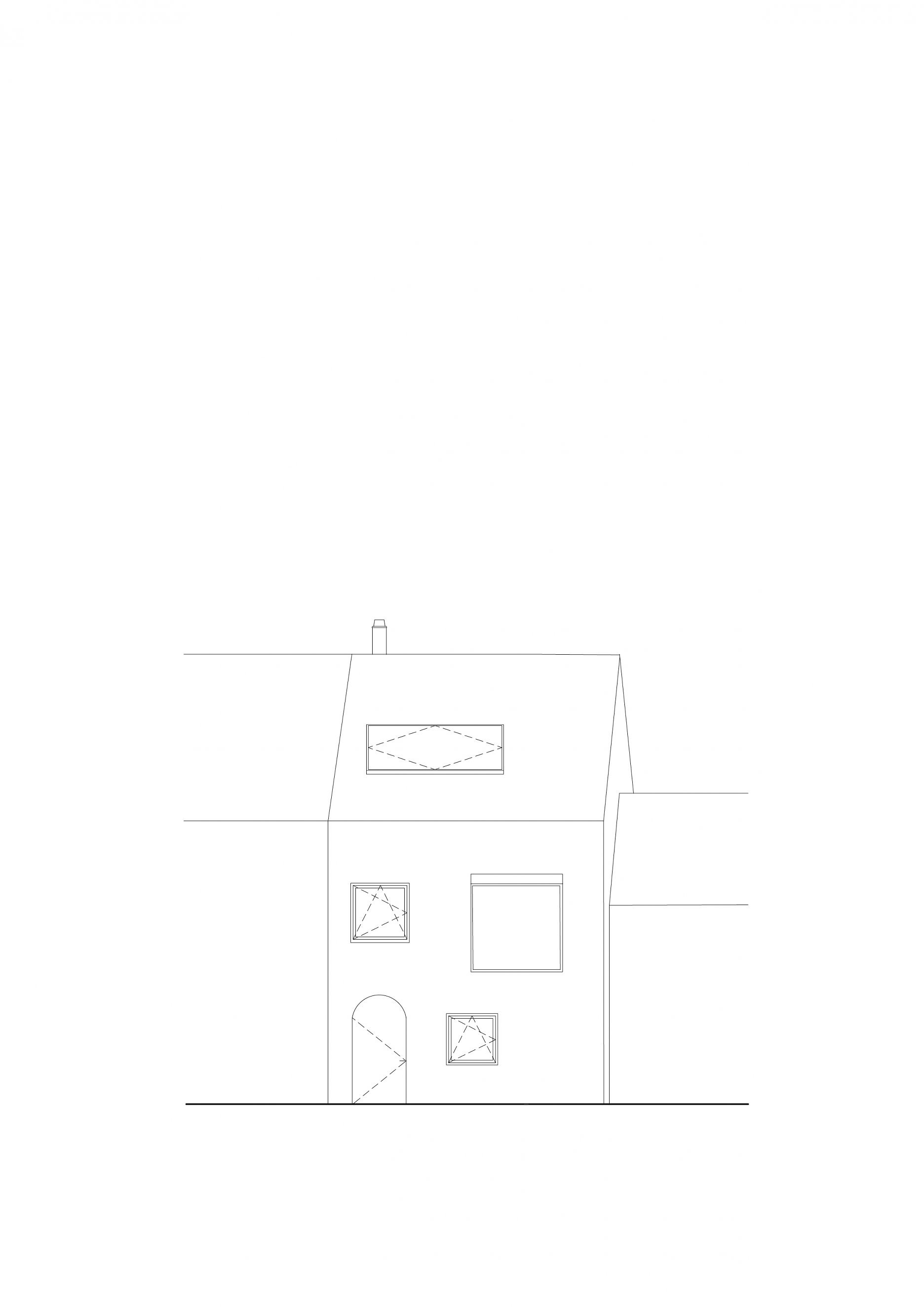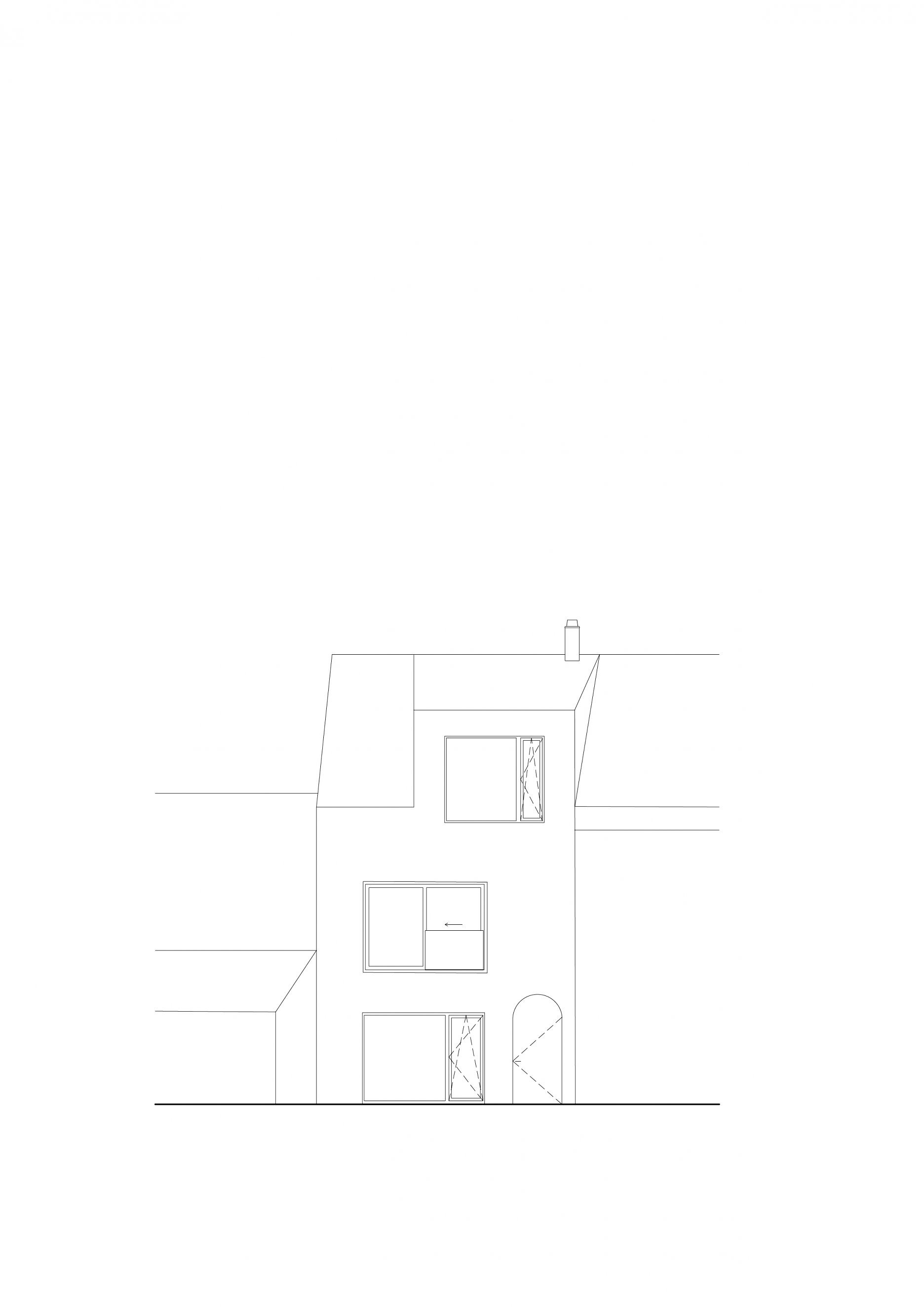 Od počátku však bylo jasné, že je důležité, aby dům svou hmotou respektoval stávající řadovou zástavbu. Půdorysnou stopou téměř kopíruje původní stavbu, do zahrady se rozšířil o necelé dva metry. Uliční fasáda respektuje uliční čáru, sklon střechy i výšku okapní římsy sousední stavby, díky čemuž podporuje typickou urbnánní strukturu obce. Obě fasády se snaží v maximální možné míře přinést osvětlení do hluboké dispozice skrz veliká prosklení. Požadavkem klienta bylo udržet možnost průchodnosti mezi ulicí a zahradou