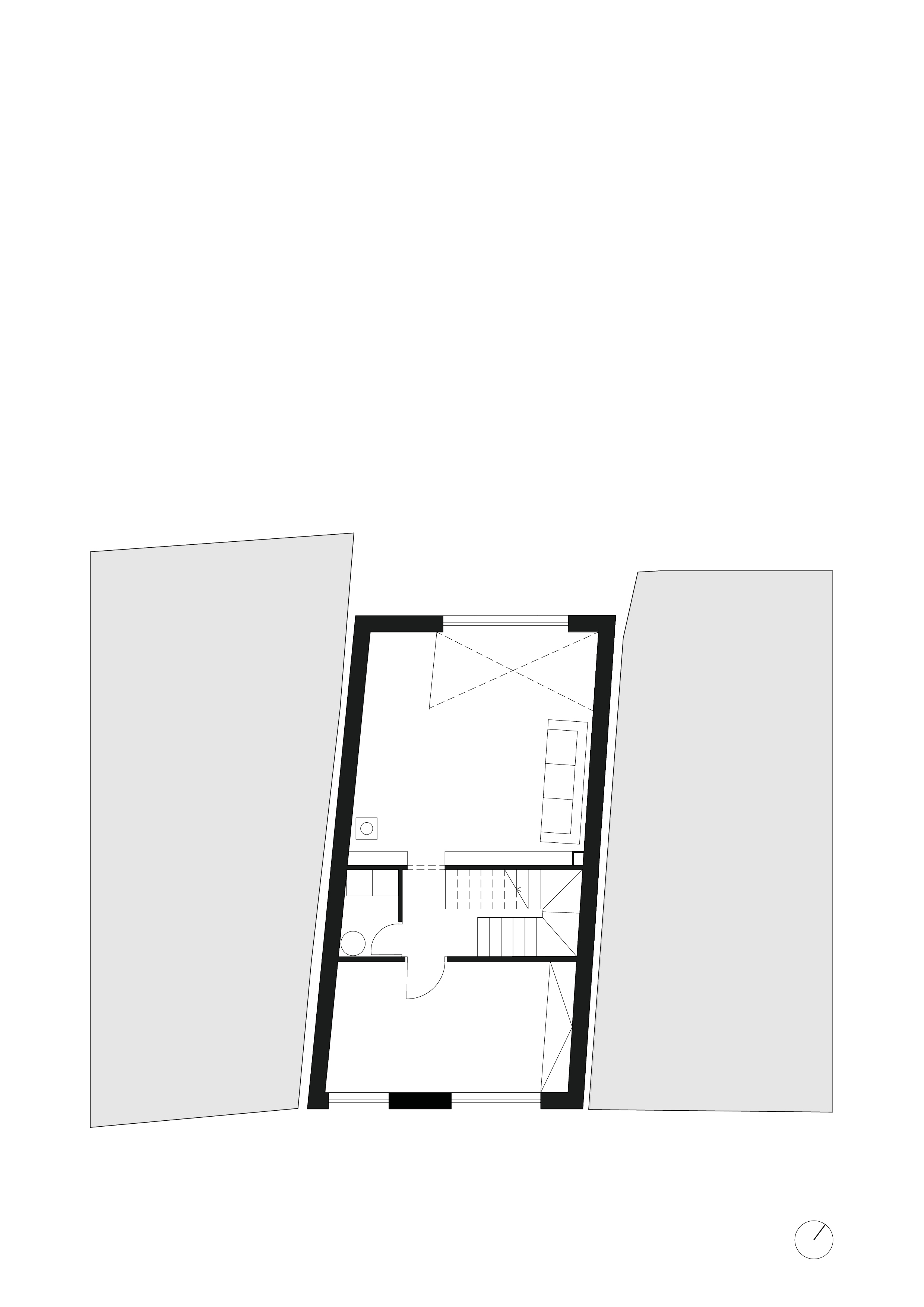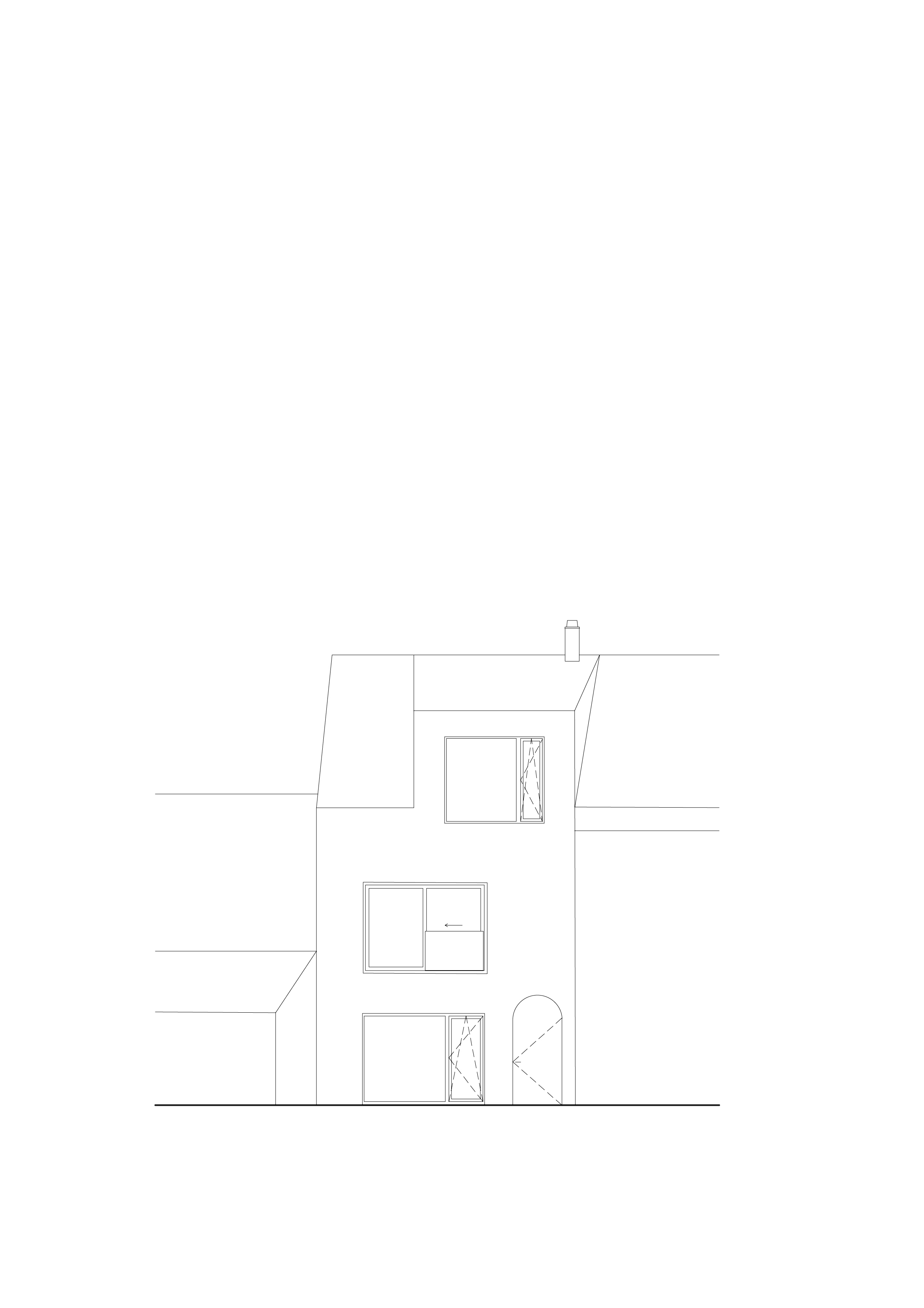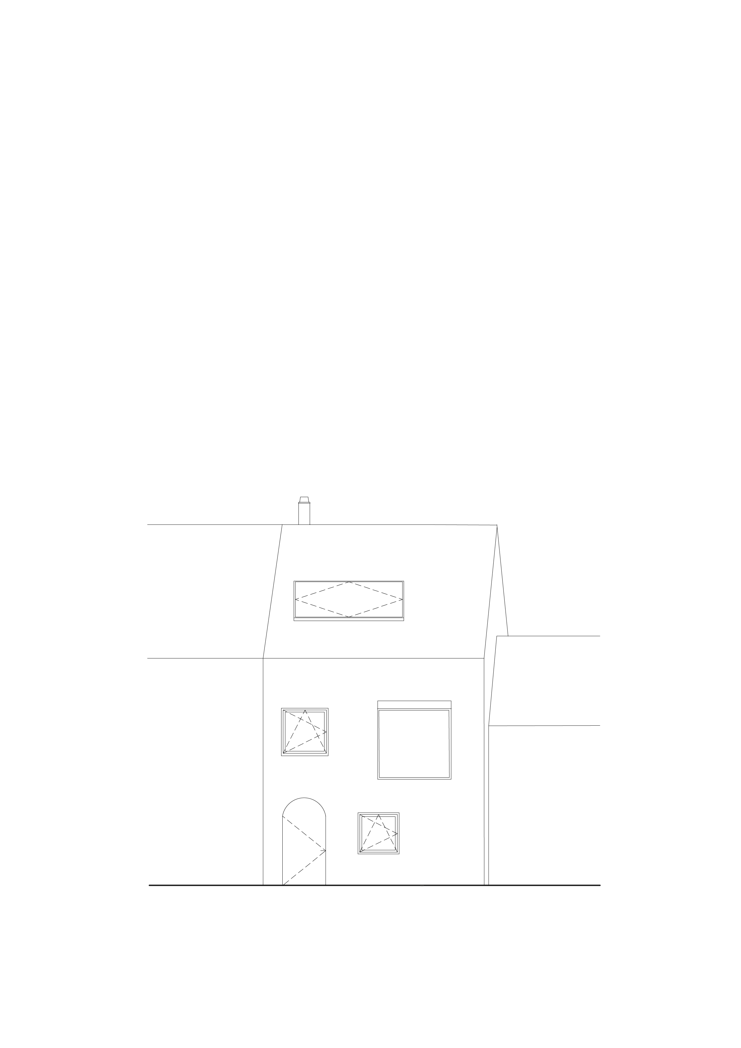 Od počátku však bylo jasné, že je důležité, aby dům svou hmotou respektoval stávající řadovou zástavbu. Půdorysnou stopou téměř kopíruje původní stavbu, do zahrady se rozšířil o necelé dva metry. Uliční fasáda respektuje uliční čáru, sklon střechy i výšku okapní římsy sousední stavby, díky čemuž podporuje typickou urbnánní strukturu obce. Obě fasády se snaží v maximální možné míře přinést osvětlení do hluboké dispozice skrz veliká prosklení. Požadavkem klienta bylo udržet možnost průchodnosti mezi ulicí a zahradou